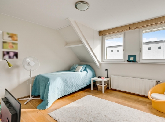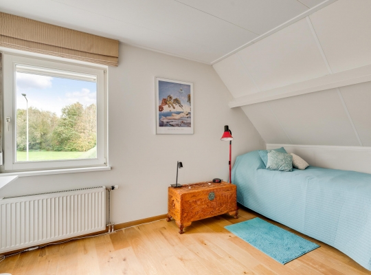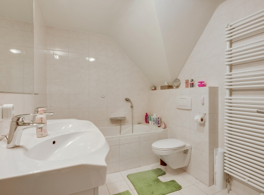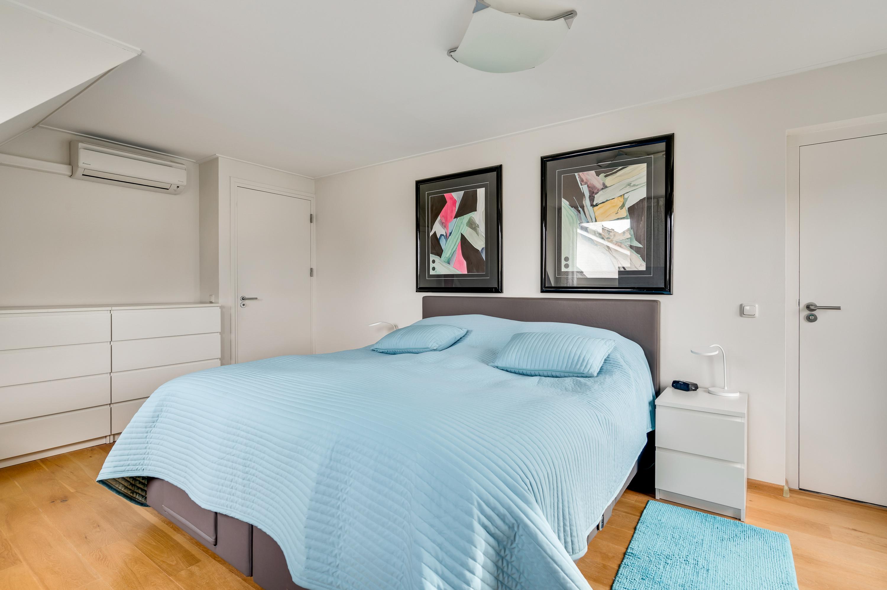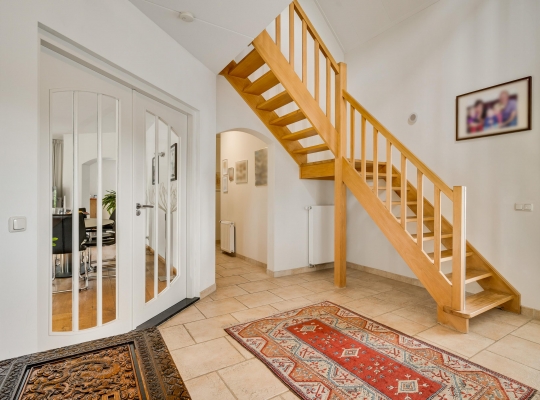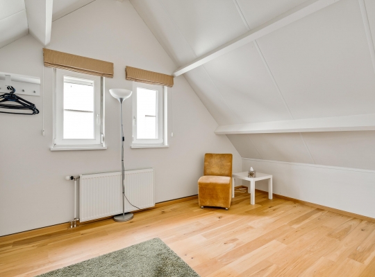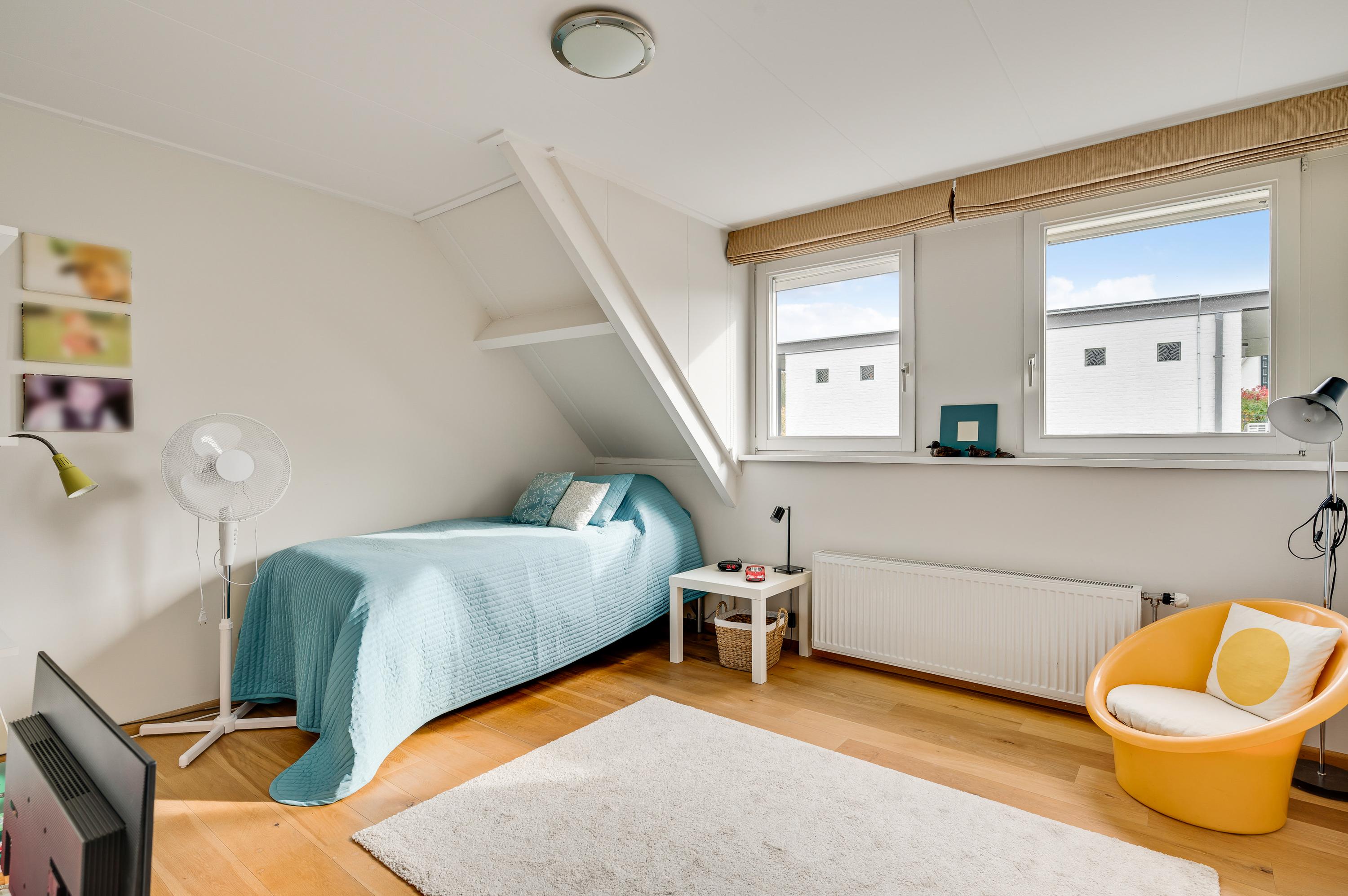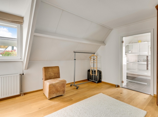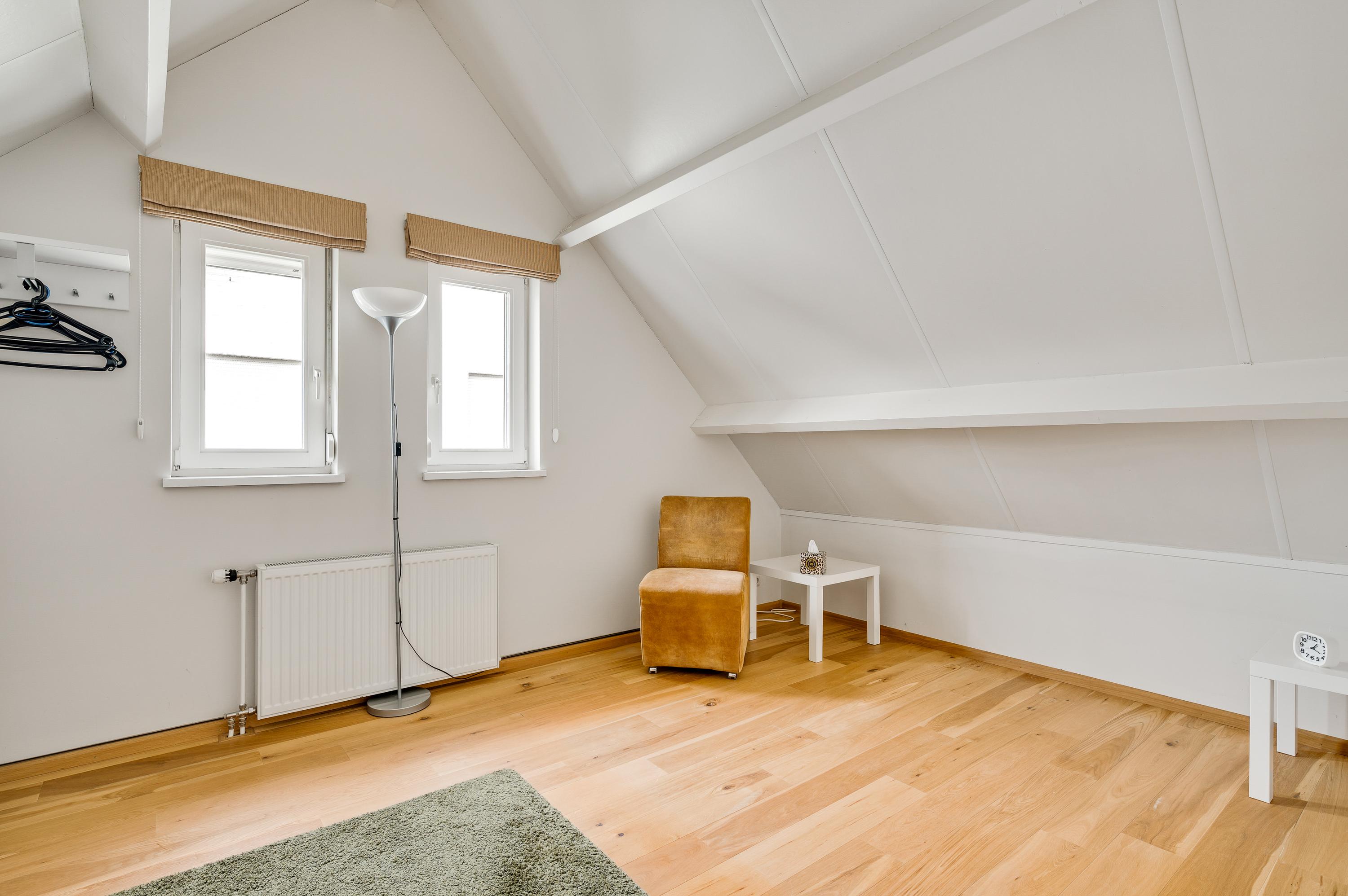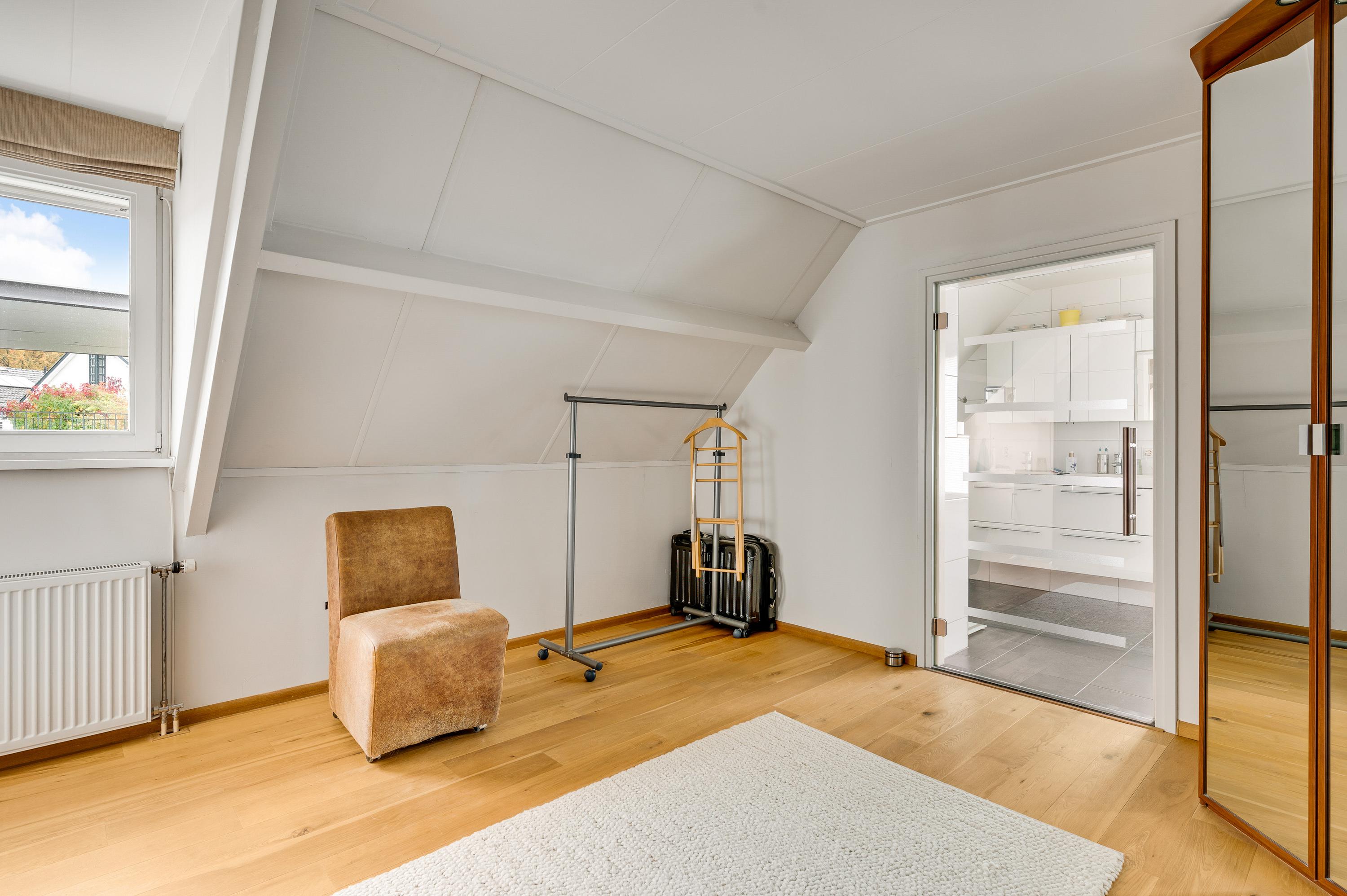 De dubbele overloop met vide is groot genoeg voor een grote thuiswerkplek, met uitzicht om in te lijsten. Op de overloop en in de slaapkamers, vijf in totaal, ligt een parketvloer met toplaag en het schuine dak, met mooie balken en twee dakkapellen, zorgt voor een aangename sfeer.