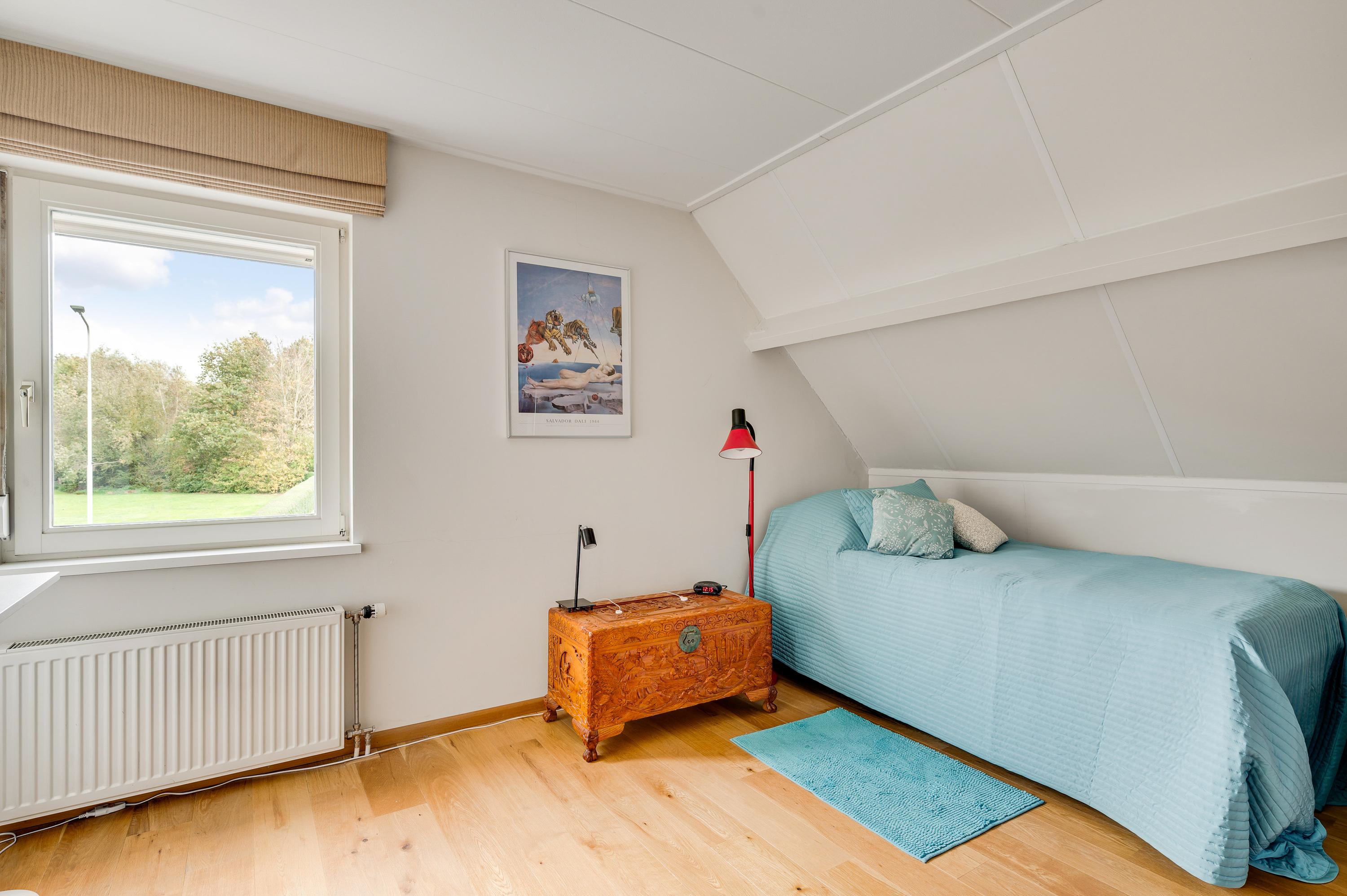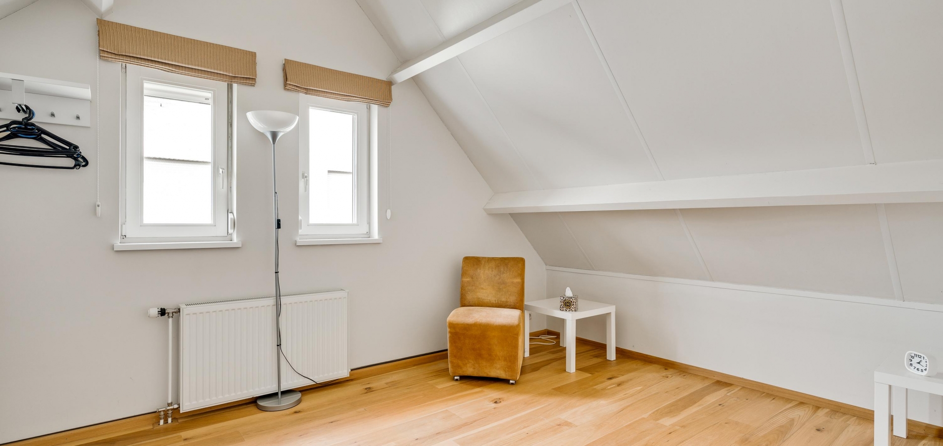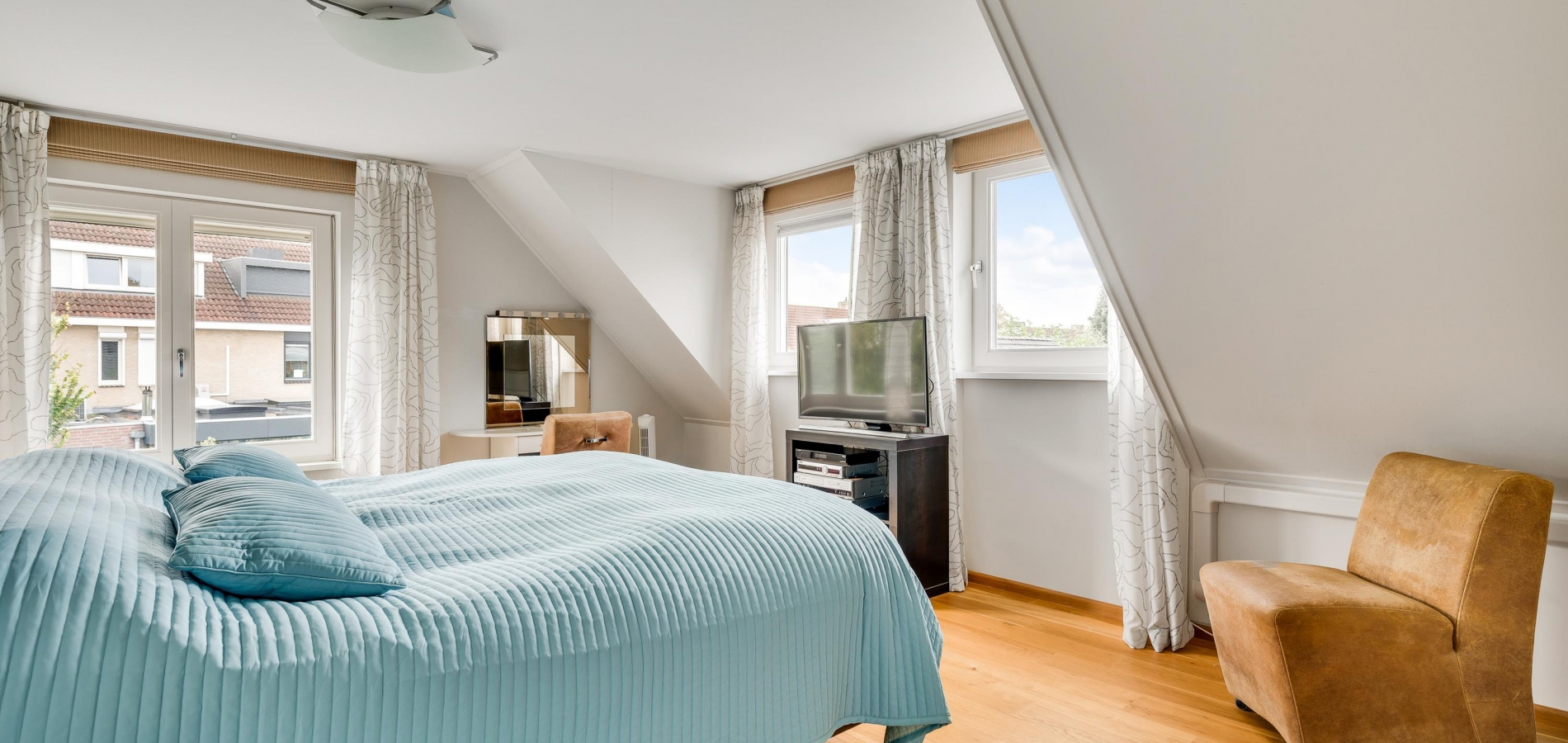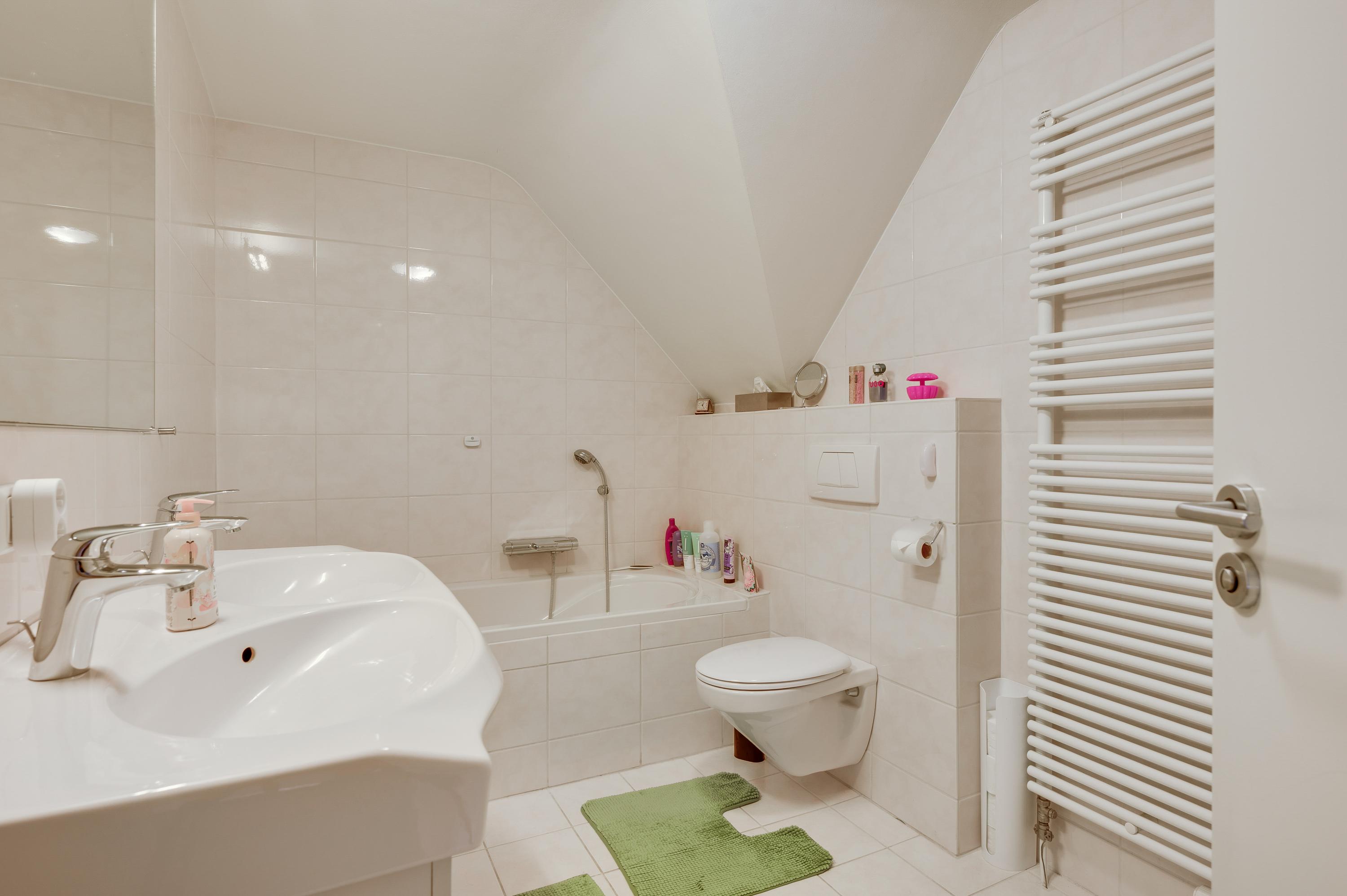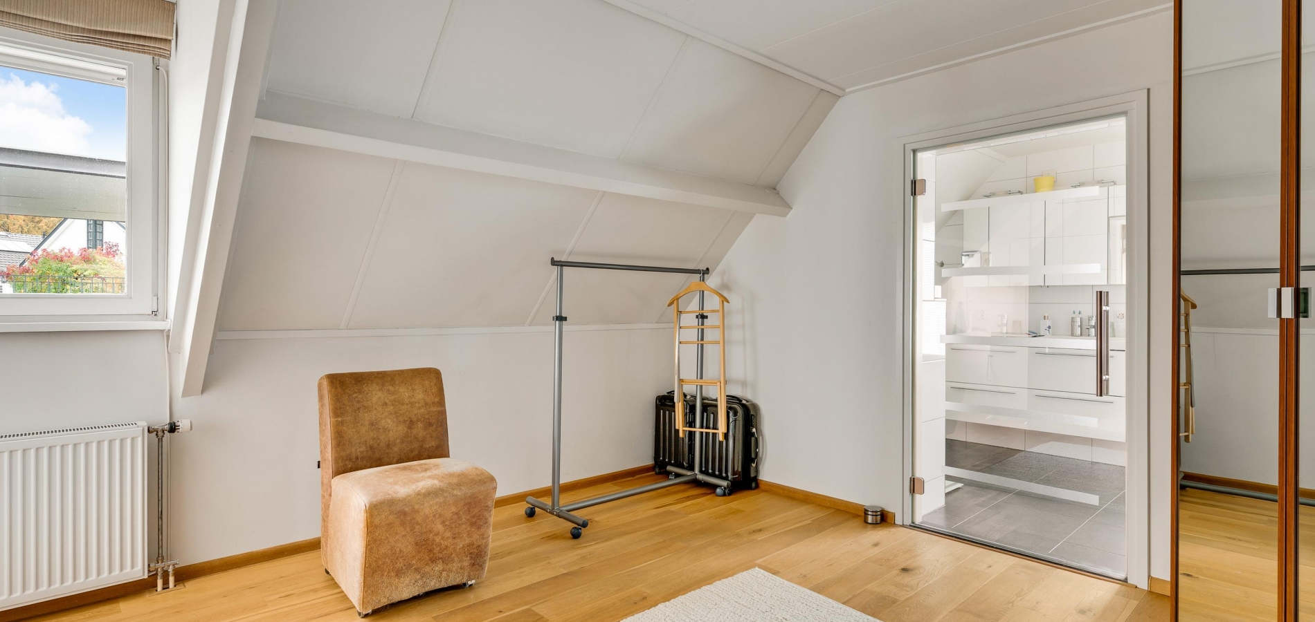 De dubbele overloop met vide is groot genoeg voor een grote thuiswerkplek, met uitzicht om in te lijsten. Op de overloop en in de slaapkamers, vijf in totaal, ligt een parketvloer met toplaag en het schuine dak, met mooie balken en twee dakkapellen, zorgt voor een aangename sfeer.