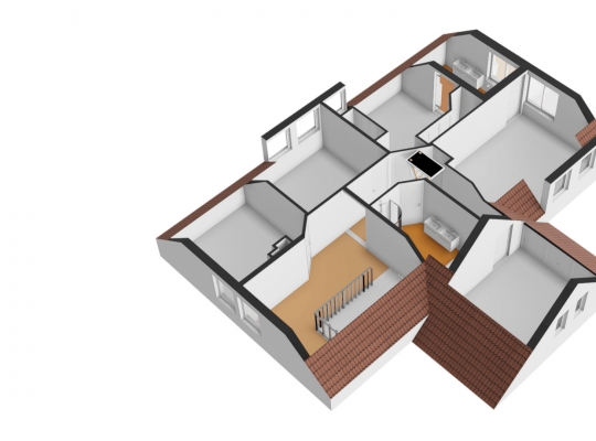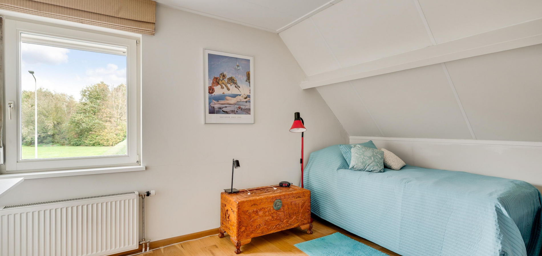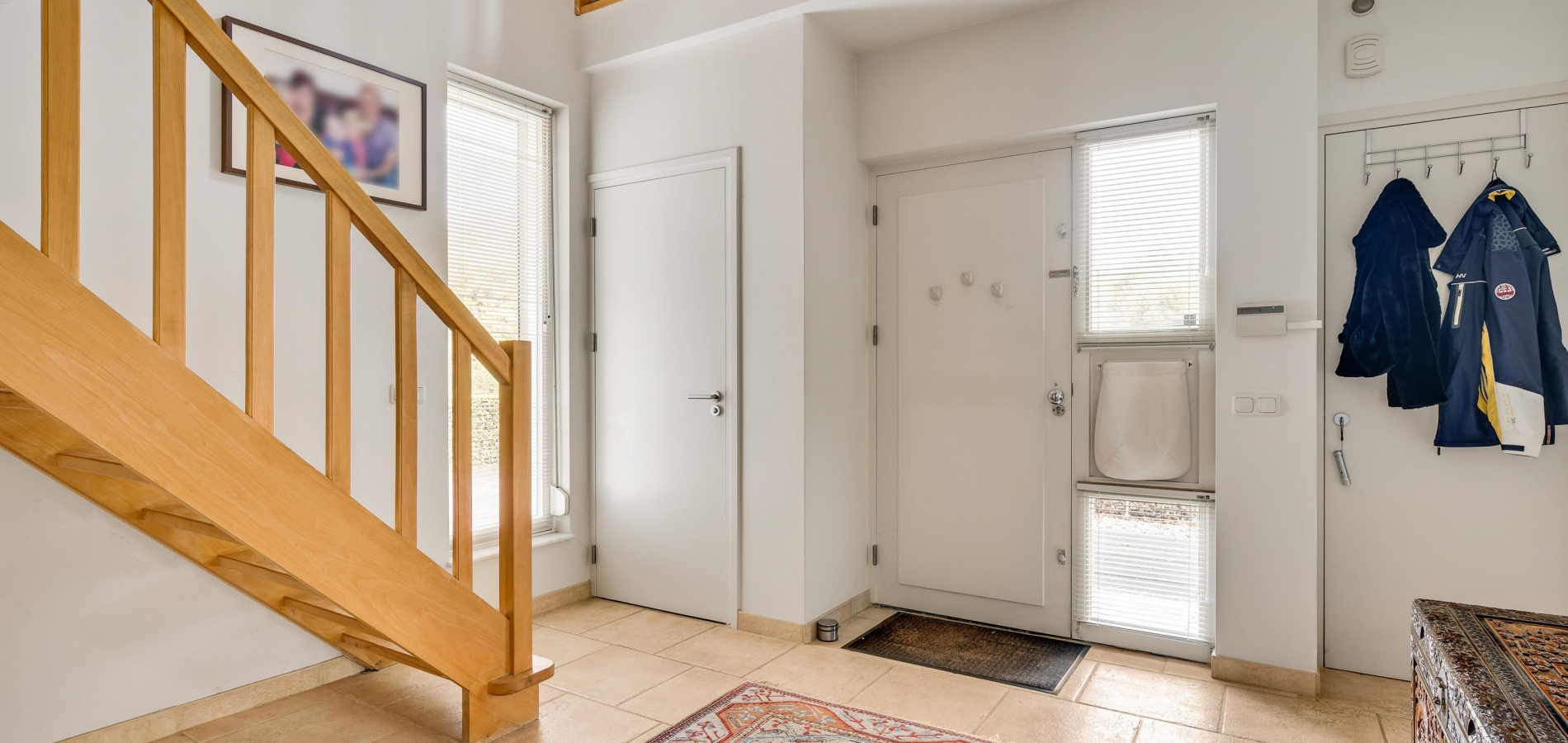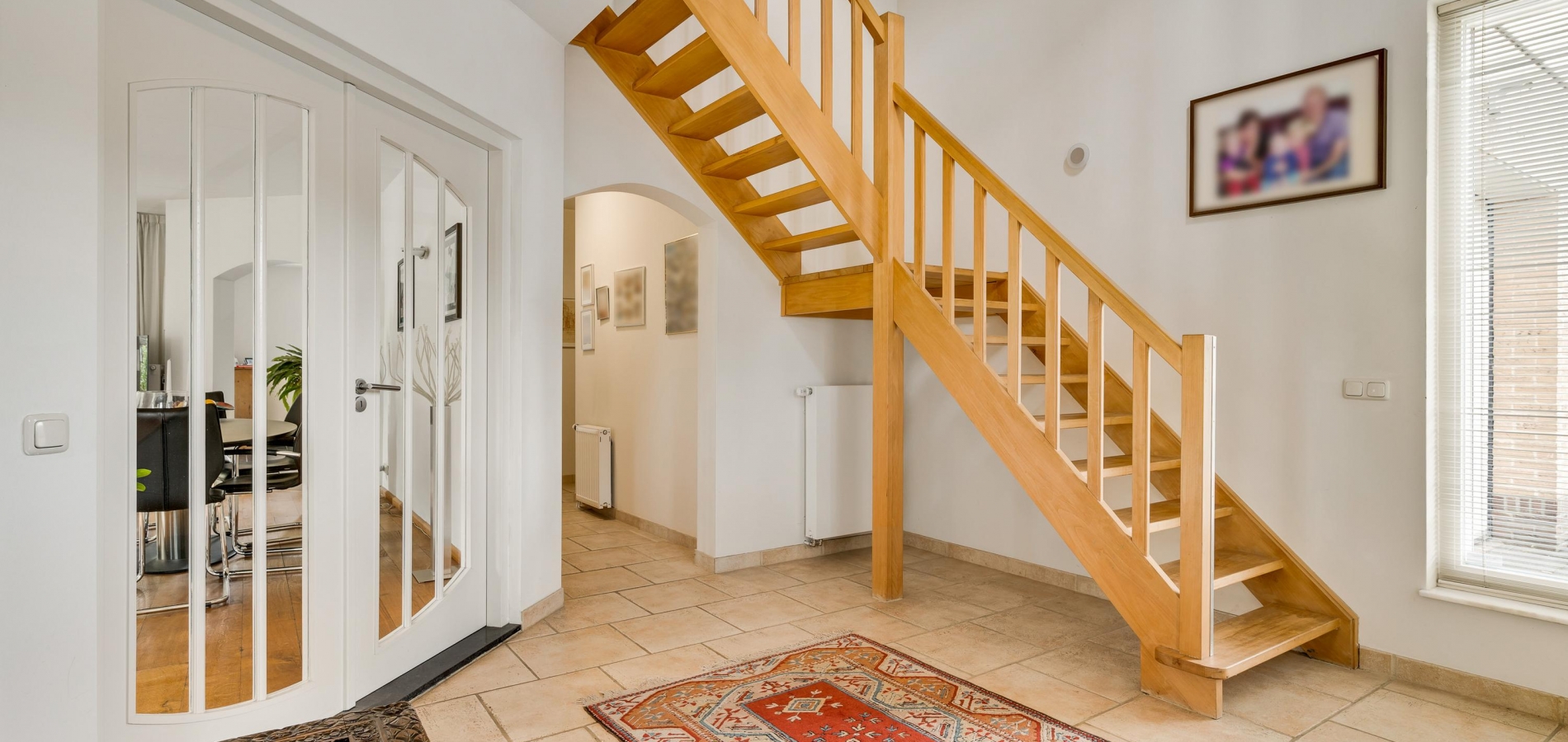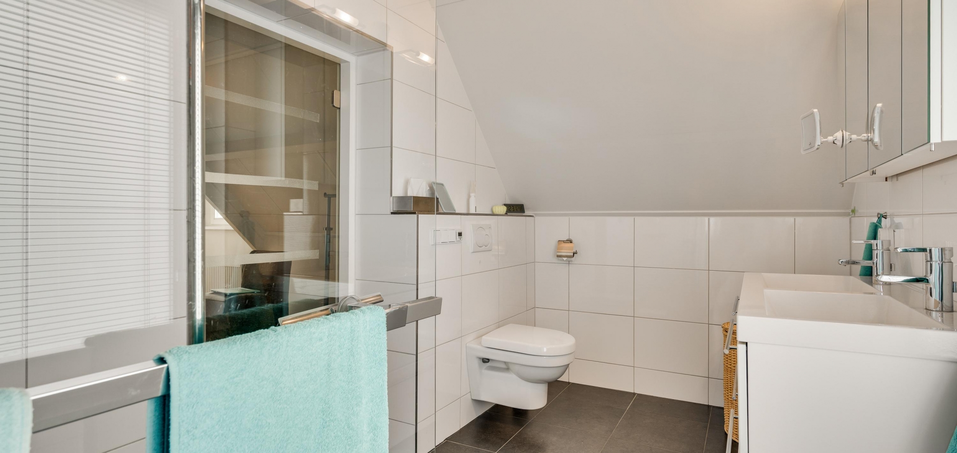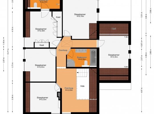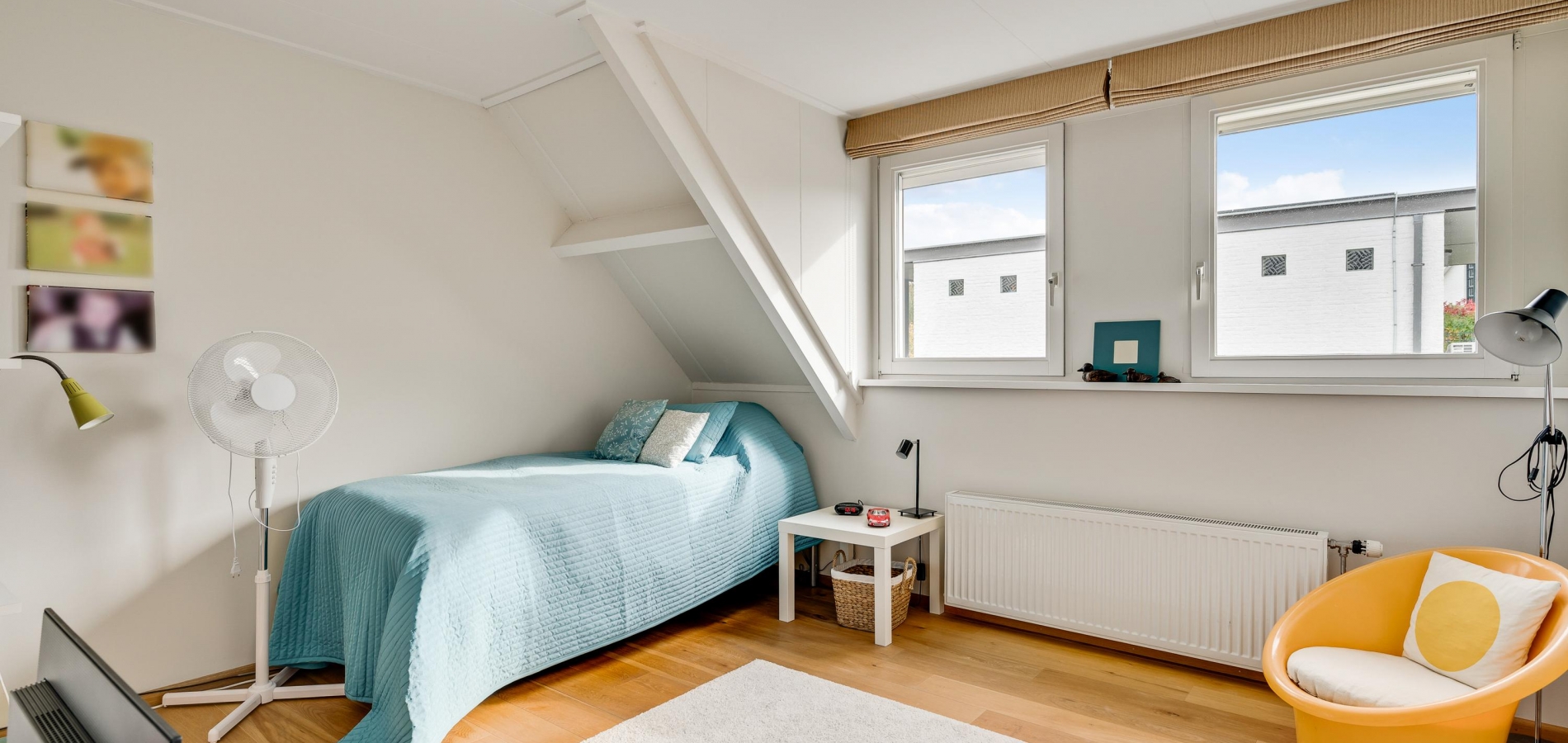 De dubbele overloop met vide is groot genoeg voor een grote thuiswerkplek, met uitzicht om in te lijsten. Op de overloop en in de slaapkamers, vijf in totaal, ligt een parketvloer met toplaag en het schuine dak, met mooie balken en twee dakkapellen, zorgt voor een aangename sfeer.