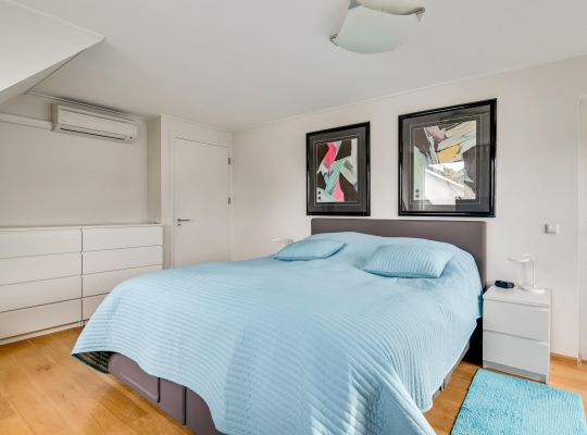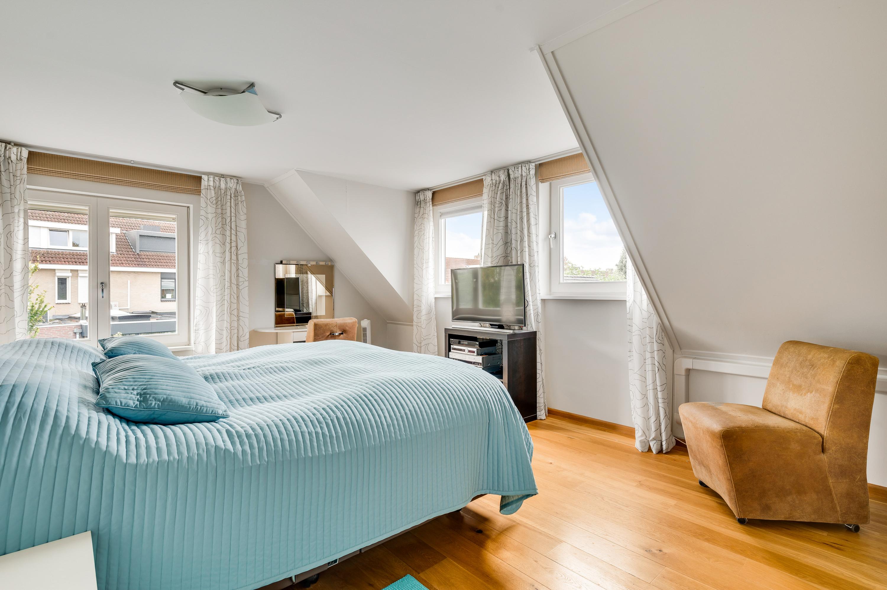 Aan de voorzijde is slaapkamer I (circa 13,2 m2) en de naastgelegen slaapkamer II is circa 12,5 m2. Slaapkamer III (circa 16 m2), in gebruik als kleedruimte, geeft toegang tot een van de badkamers. Dit geldt ook voor slaapkamer IV (circa 21 m2), met een airco-unit die kan koelen en verwarmen. Boven de garage is slaapkamer V (circa 15 m2) met een berging in de schuinte van het dak.