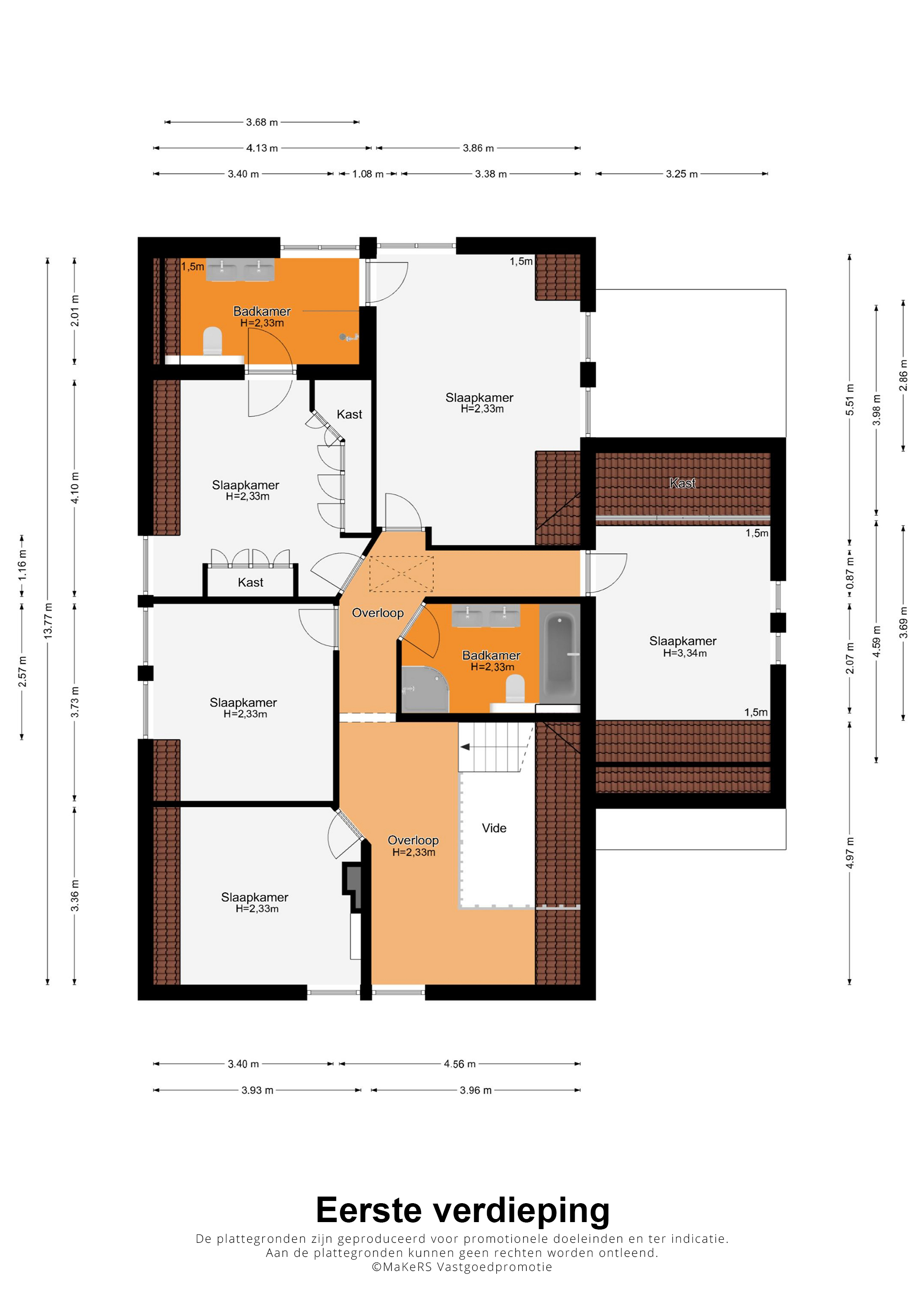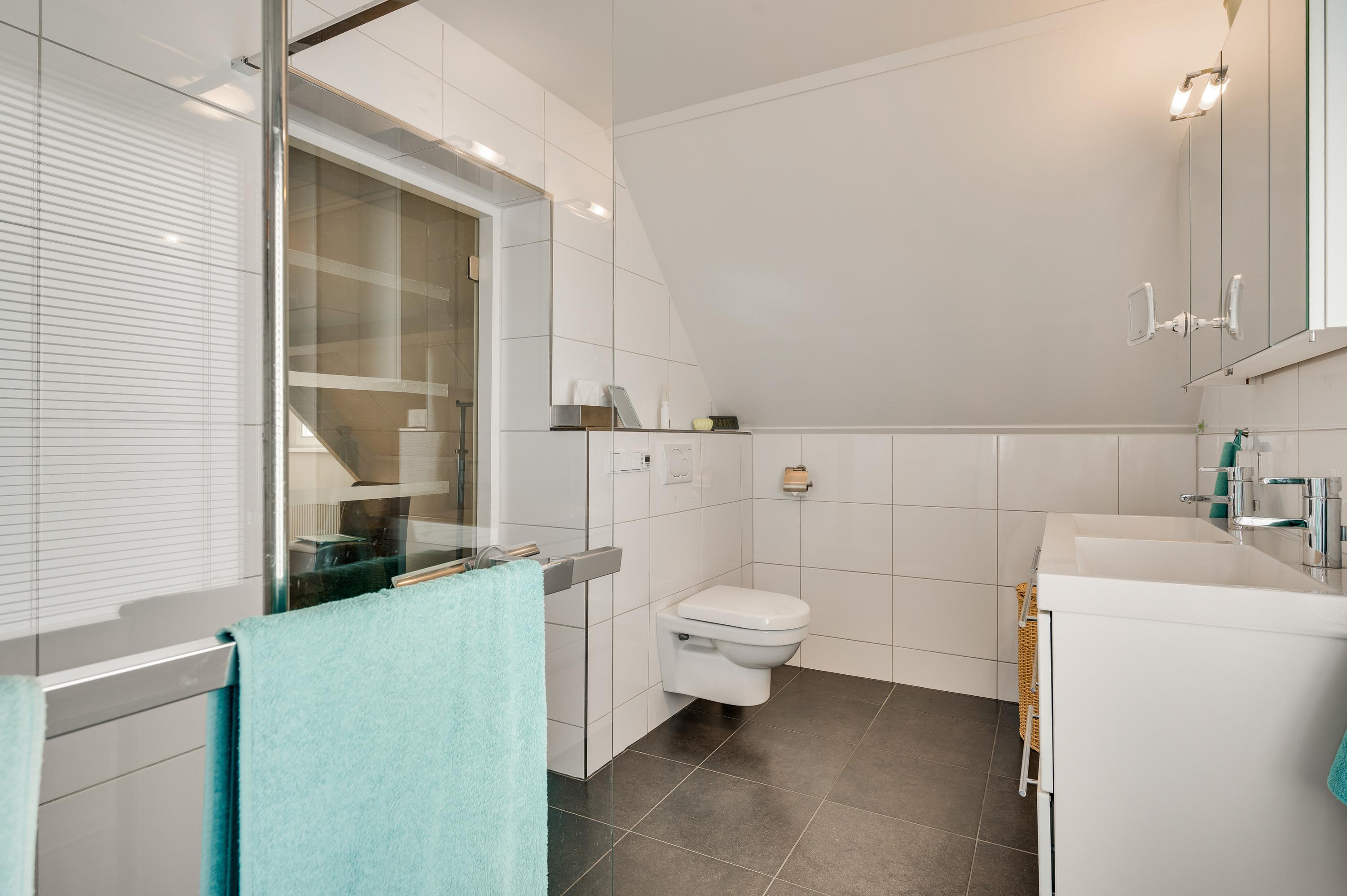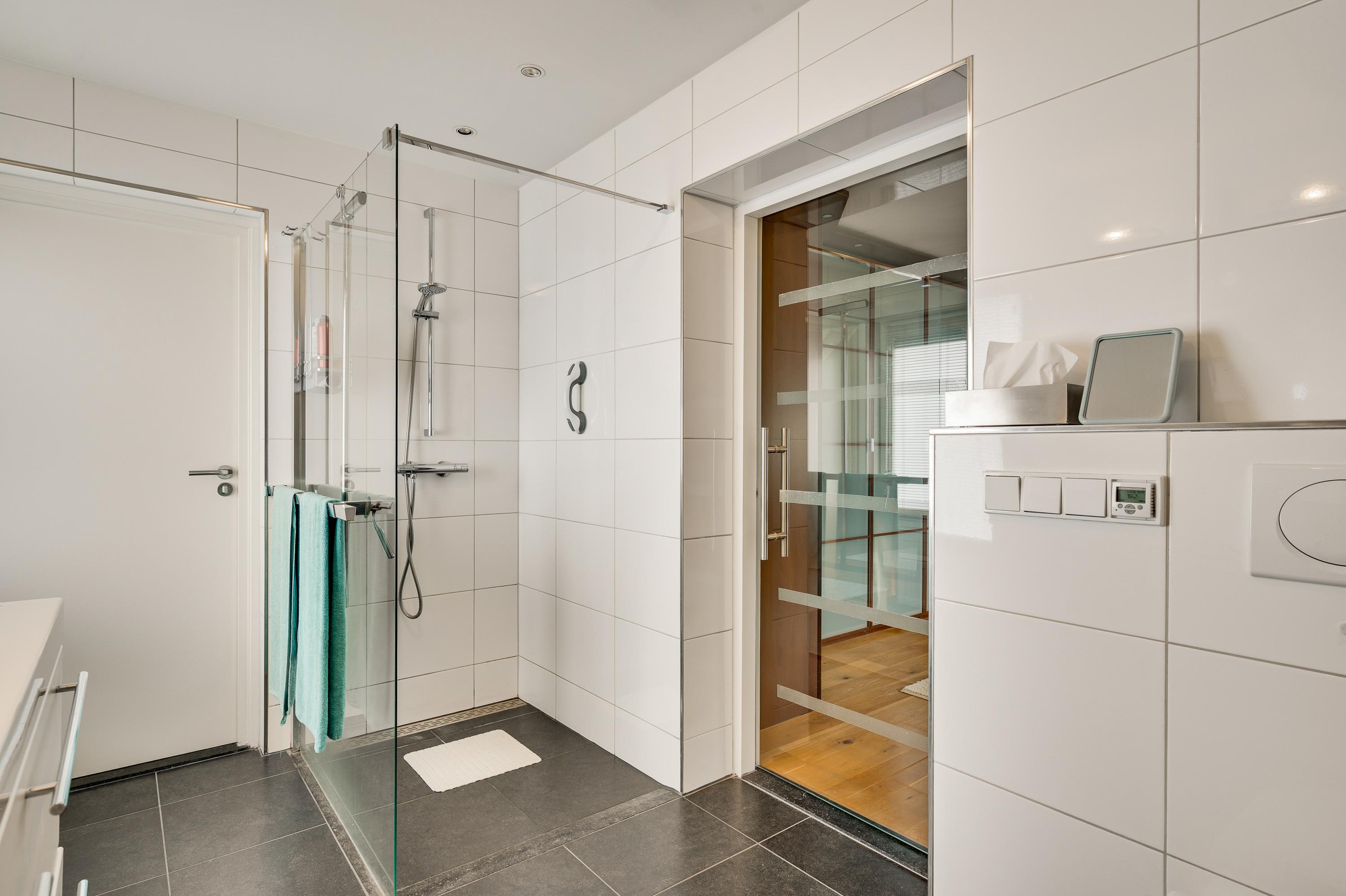 Badkamer I (circa 4,13 x 2,01), vernieuwd in 2008, is ingedeeld met een inloopdouche, toilet en een dubbele wastafel met meubel. Vanaf de overloop is badkamer II (circa 3,96 x 2,07) te bereiken. Hier heeft u de beschikking over een ligbad, aparte douche, toilet en een dubbele wastafel met meubel.