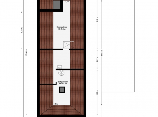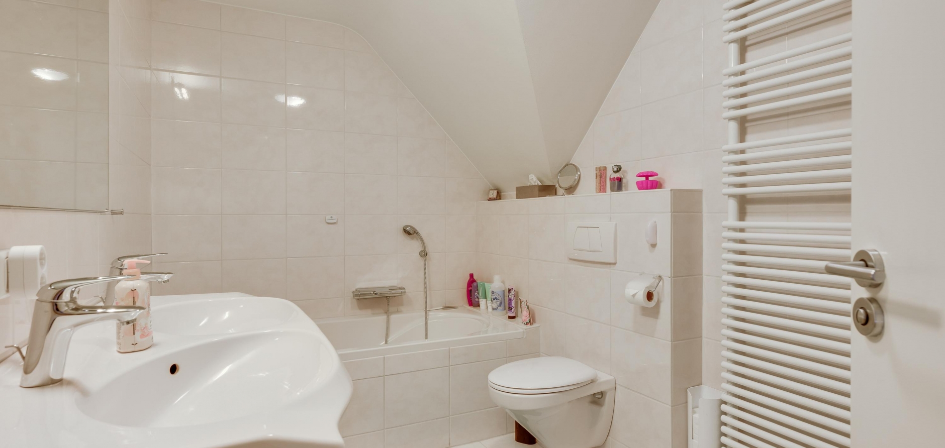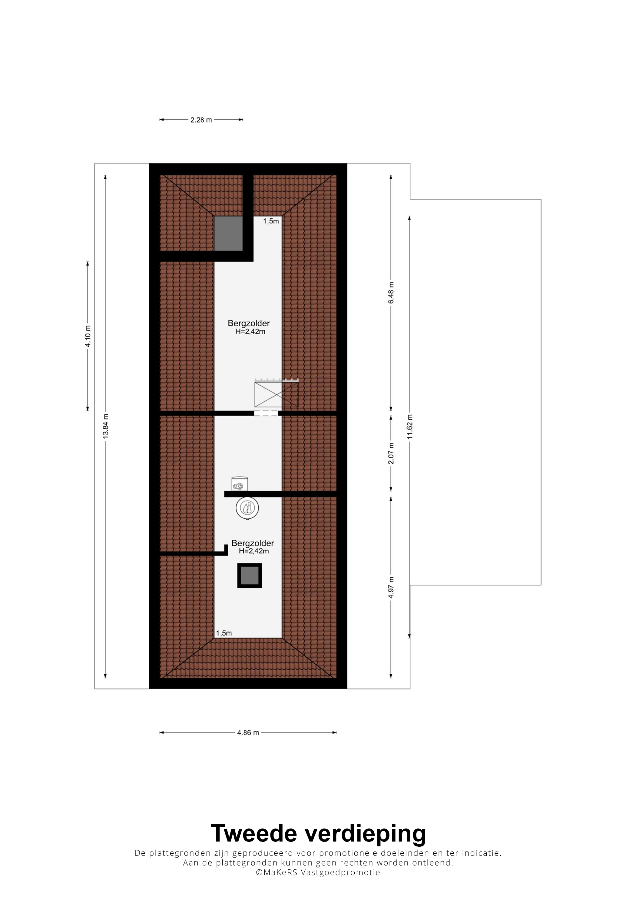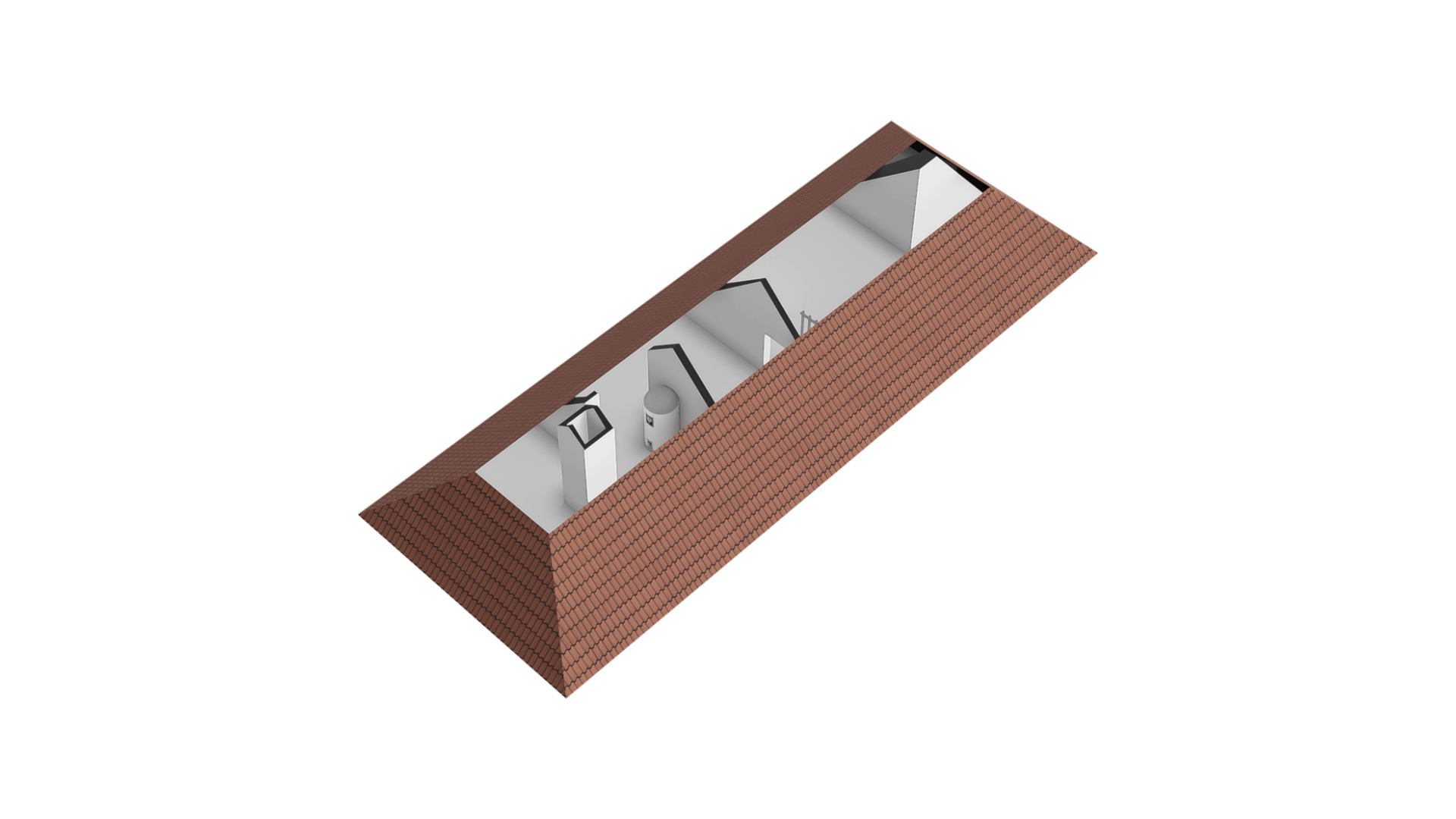 Vanaf de overloop heeft u toegang tot een dubbele zolder, over de hele lengte van de villa. Op deze etage ziet u de hybride HR-ketel en de elektrische boiler van 160 liter, die beide badkamers van warm water voorziet.