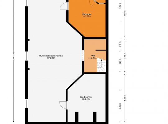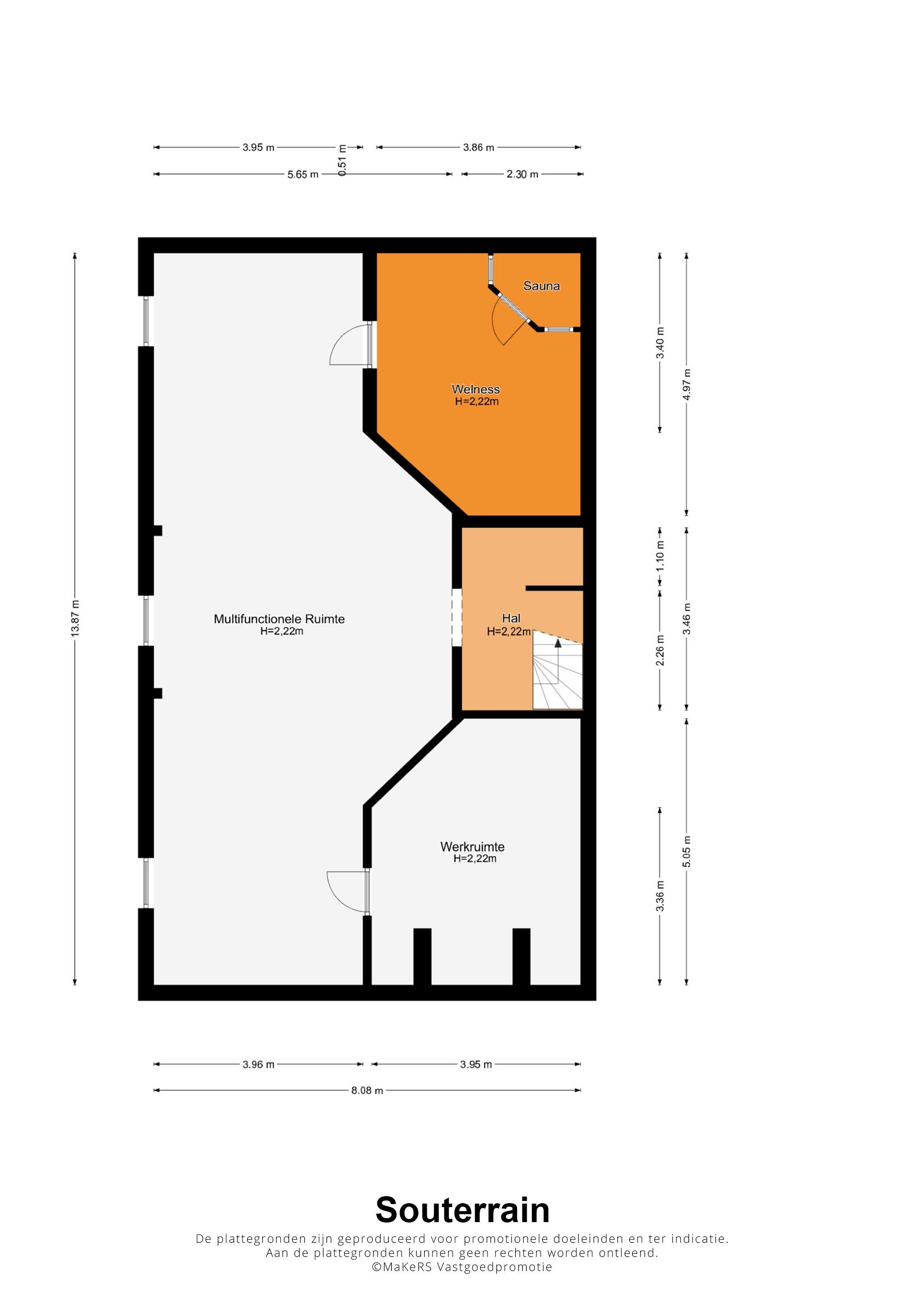 Wat u aan de buitenzijde niet ziet, is het circa 110 m2 grote souterrain dat voor diverse doeleinden geschikt is. Vanuit de hal op de begane grond leidt een vaste trap naar een portaal, dat toegang biedt tot een ruimte van circa 63 m2. Voorzieningen als elektra, verlichting, verwarming en drie ramen in de zijgevel zorgen ervoor dat deze ruimte voor diverse doeleinden te gebruiken is.