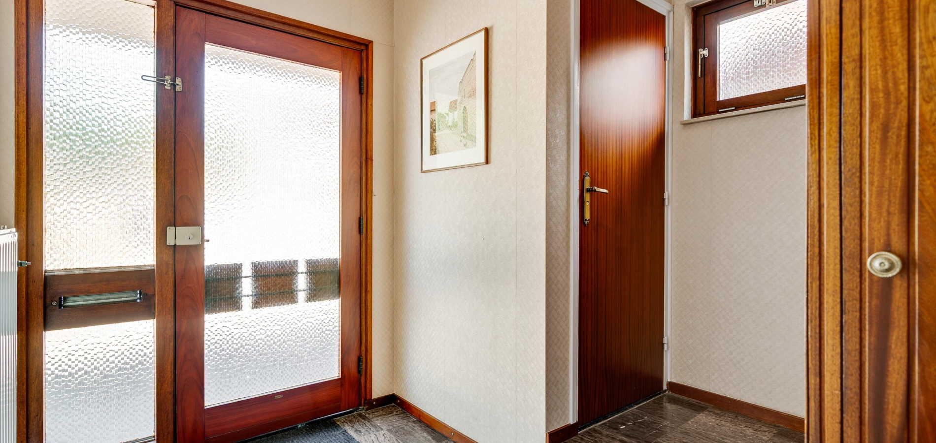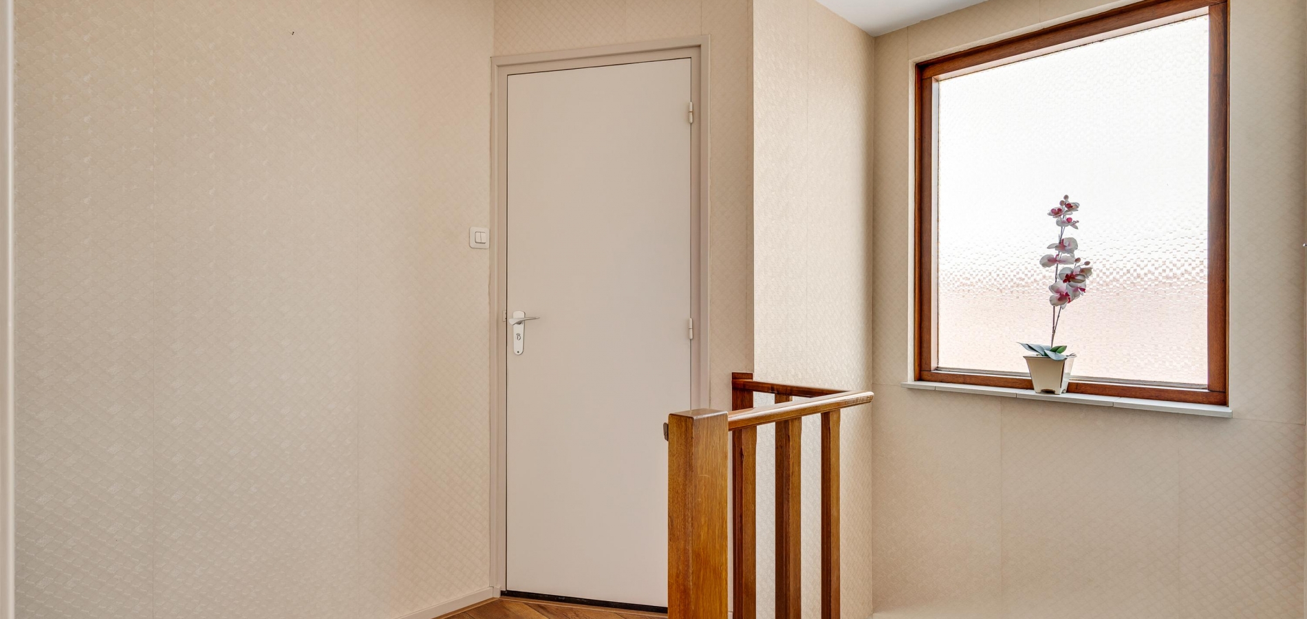 In de lange hal (circa 3,92 x 1,30) zijn de trappen naar het souterrain en de eerste verdieping, de meterkast en de nette toiletruimte met fonteintje. De tegelvloer en de woonkamerdeur geven de hal een karakteristieke uitstraling.