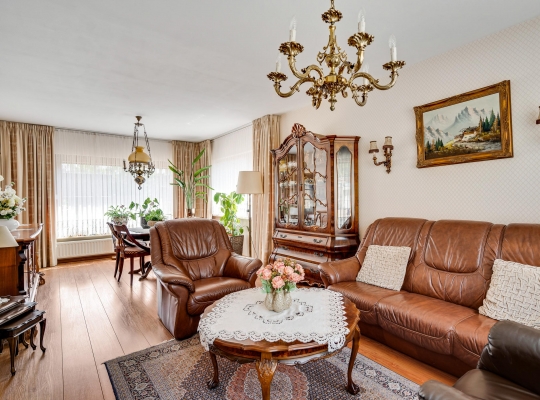 De woonkamer (circa 8,11 x 3,70) is een sfeervolle en lichte leefruimte, met het zitgedeelte aan de voorzijde en het eetgedeelte aan de achterzijde. Op de vloer ligt laminaat, de muren zijn behangen en grote ramen aan drie zijden maken de woonkamer heerlijk licht.