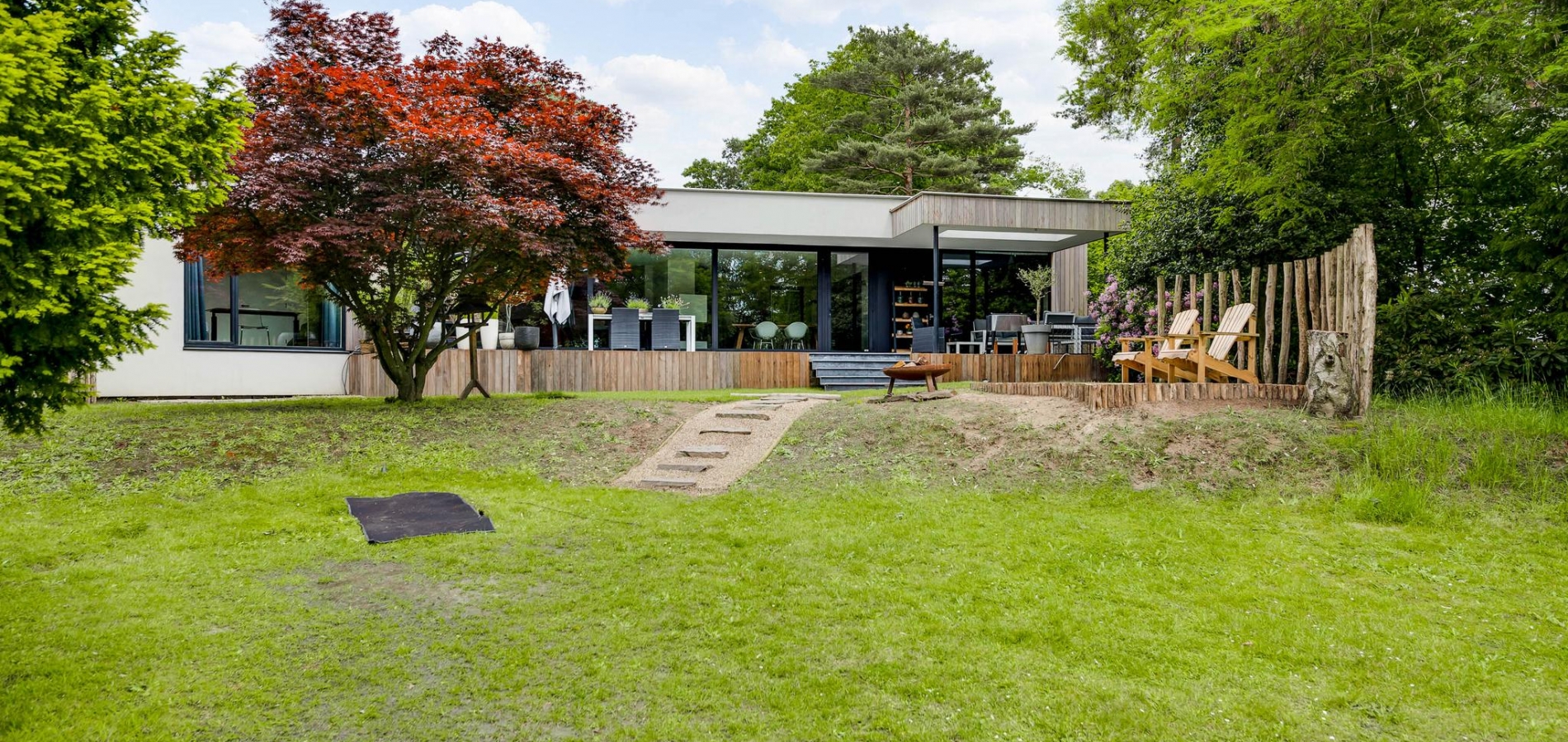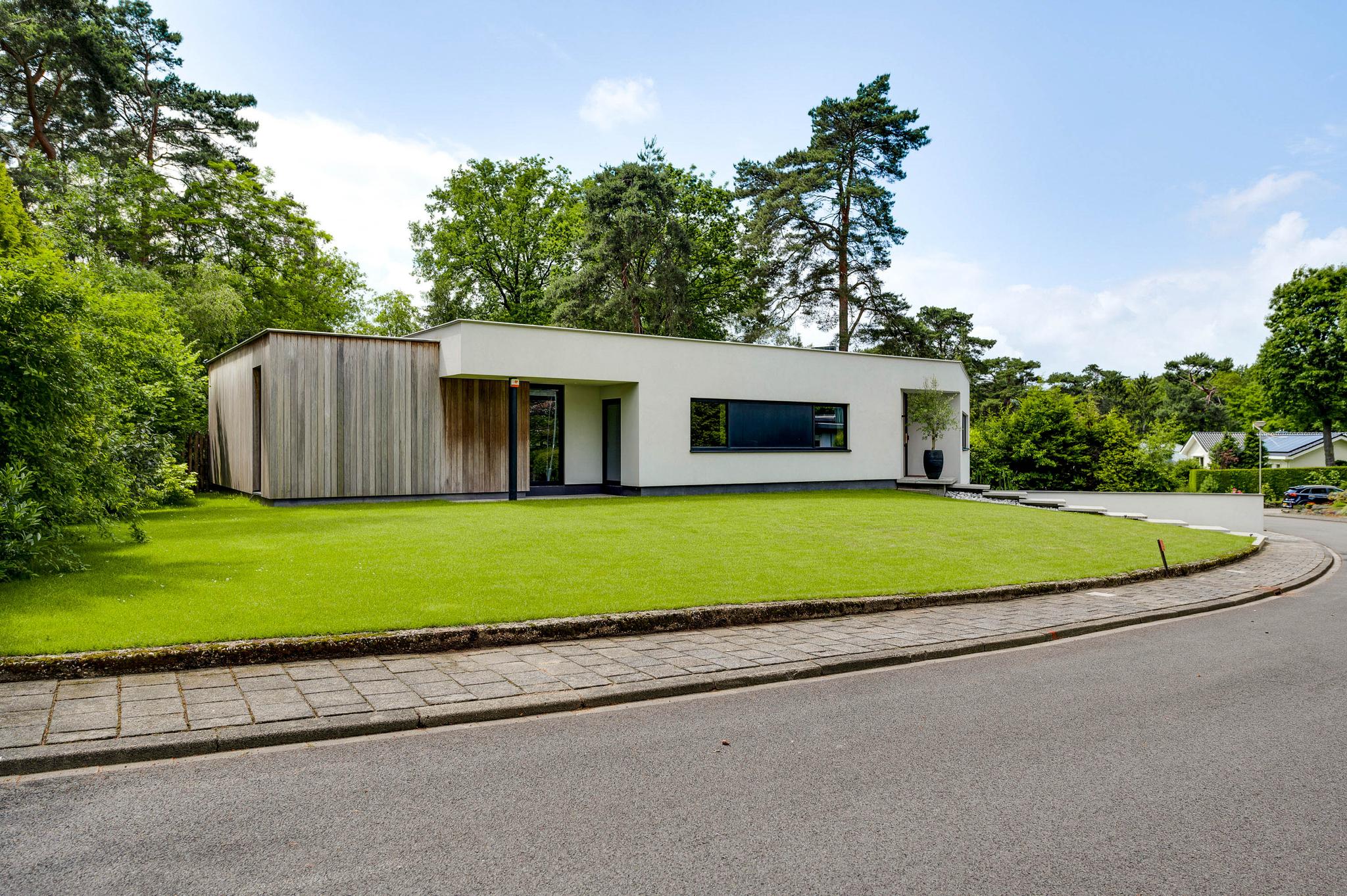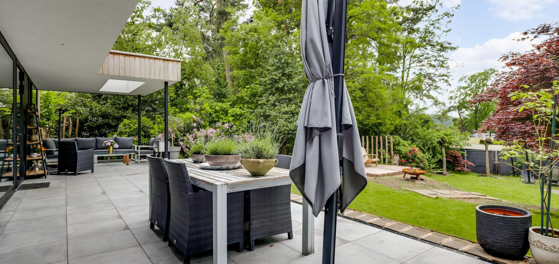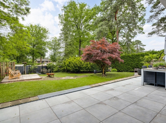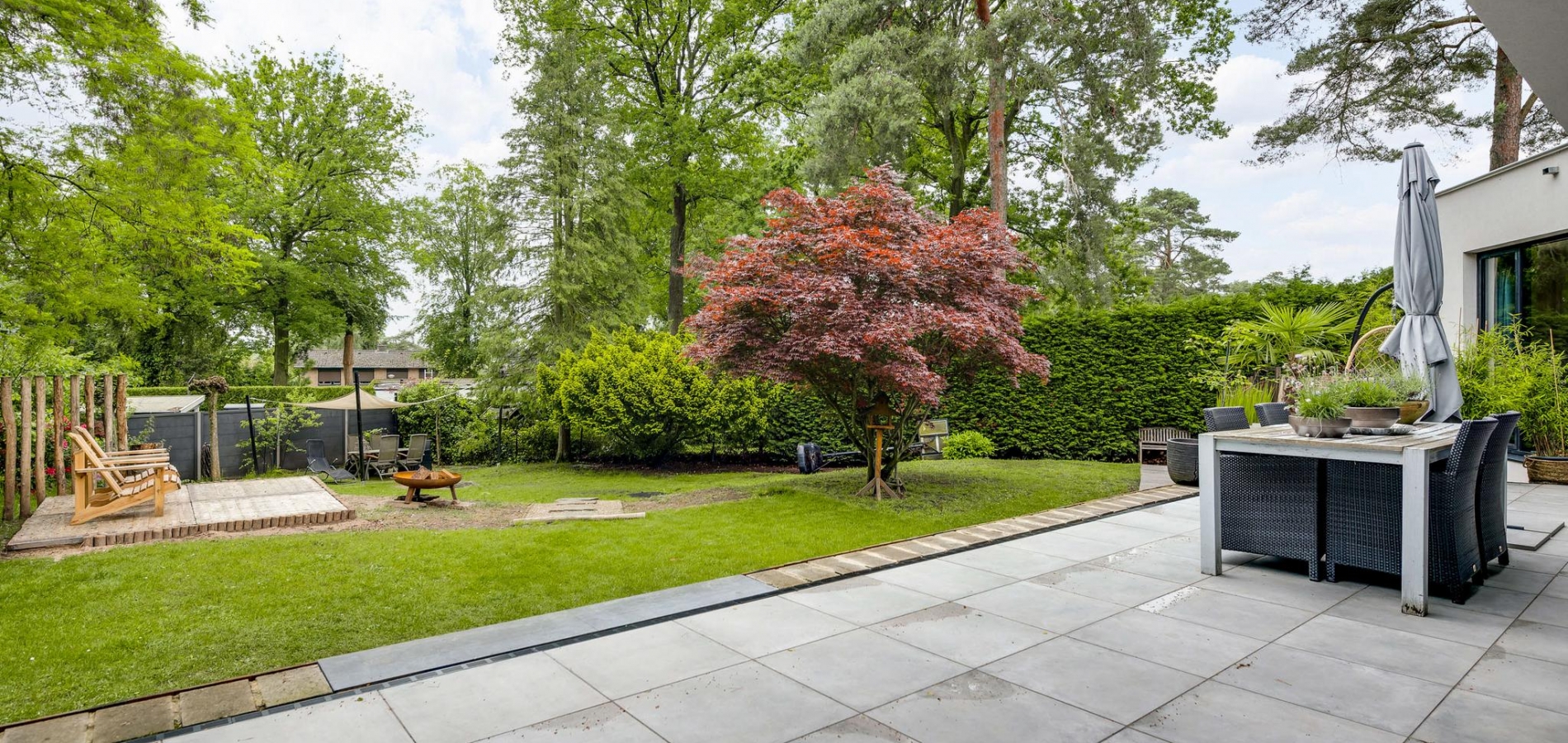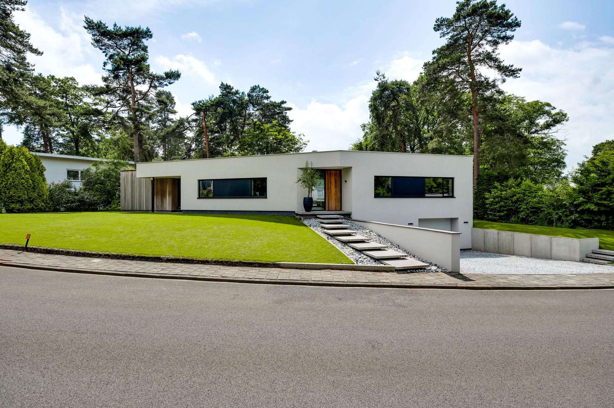 Deze designvilla staat op een fraai perceel van 1260 m2 met een royale frontbreedte en een uitstekende zonligging (zuiden). Het deels overdekte terras heeft een oppervlakte van ca. 65 m2 en de bostuin is fraai aangelegd met bomen, brede borders, een gazon en een zonneterras.