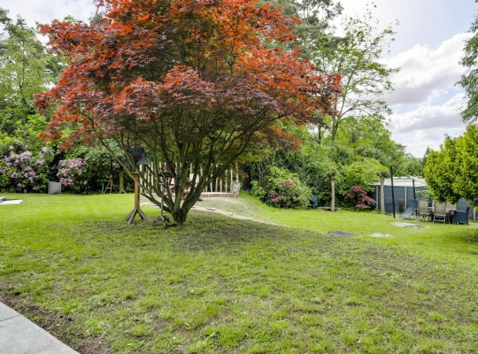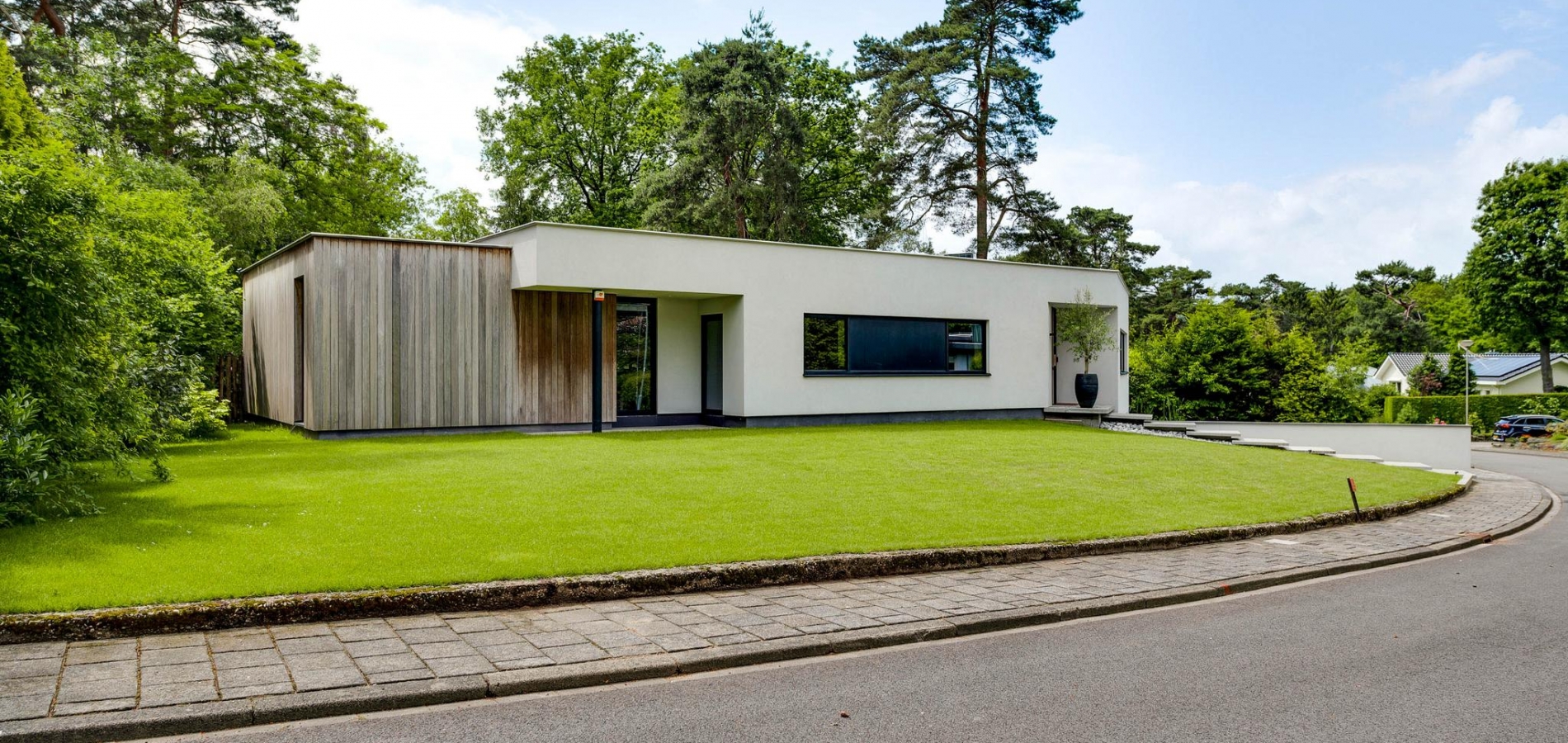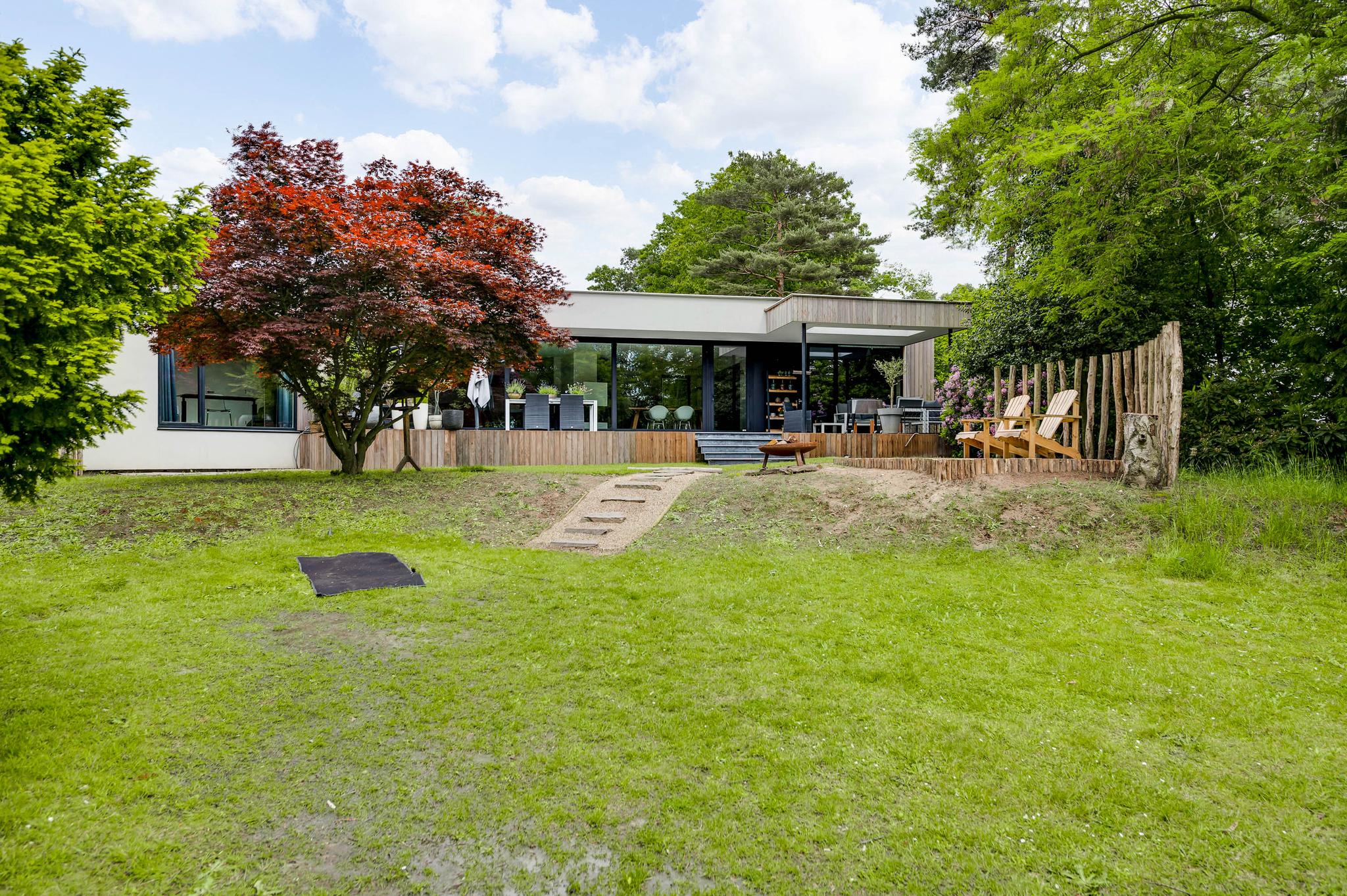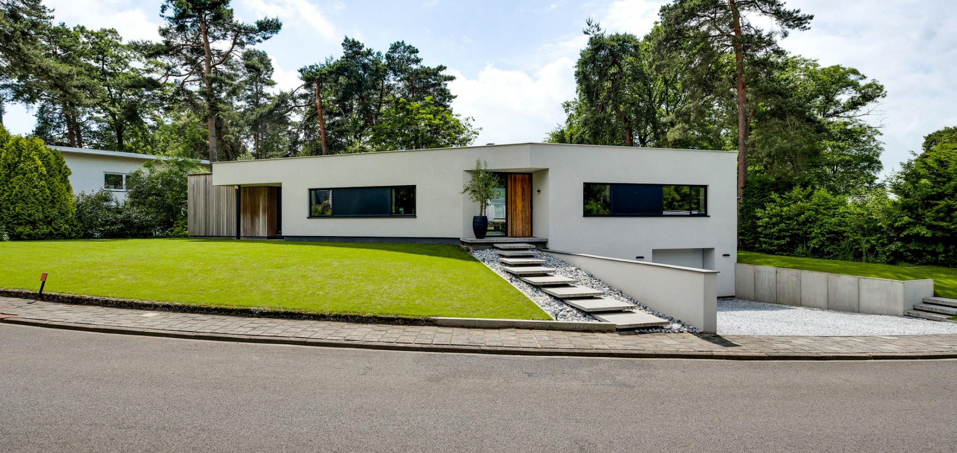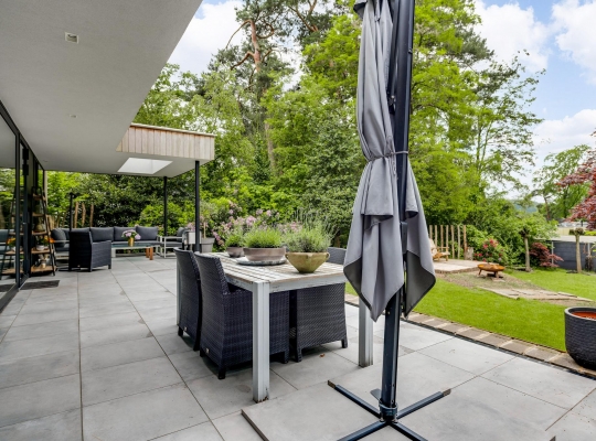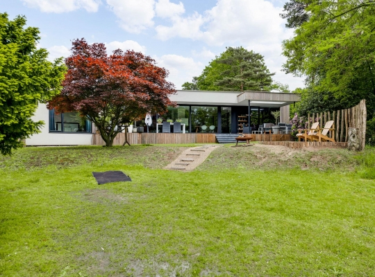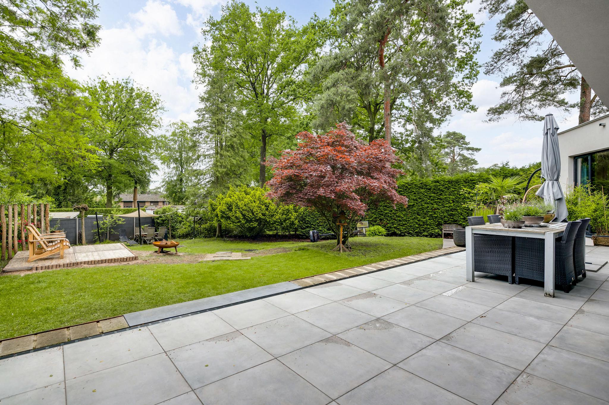 Deze designvilla staat op een fraai perceel van 1260 m2 met een royale frontbreedte en een uitstekende zonligging (zuiden). Het deels overdekte terras heeft een oppervlakte van ca. 65 m2 en de bostuin is fraai aangelegd met bomen, brede borders, een gazon en een zonneterras.