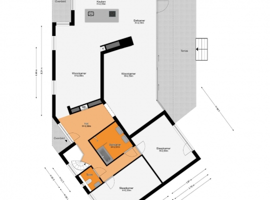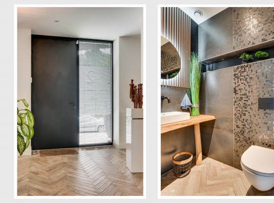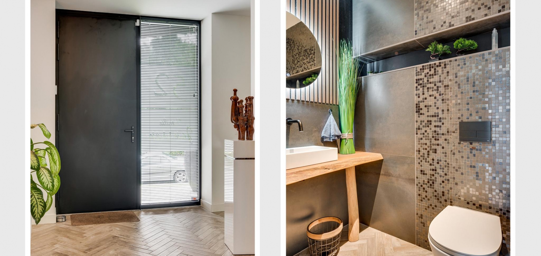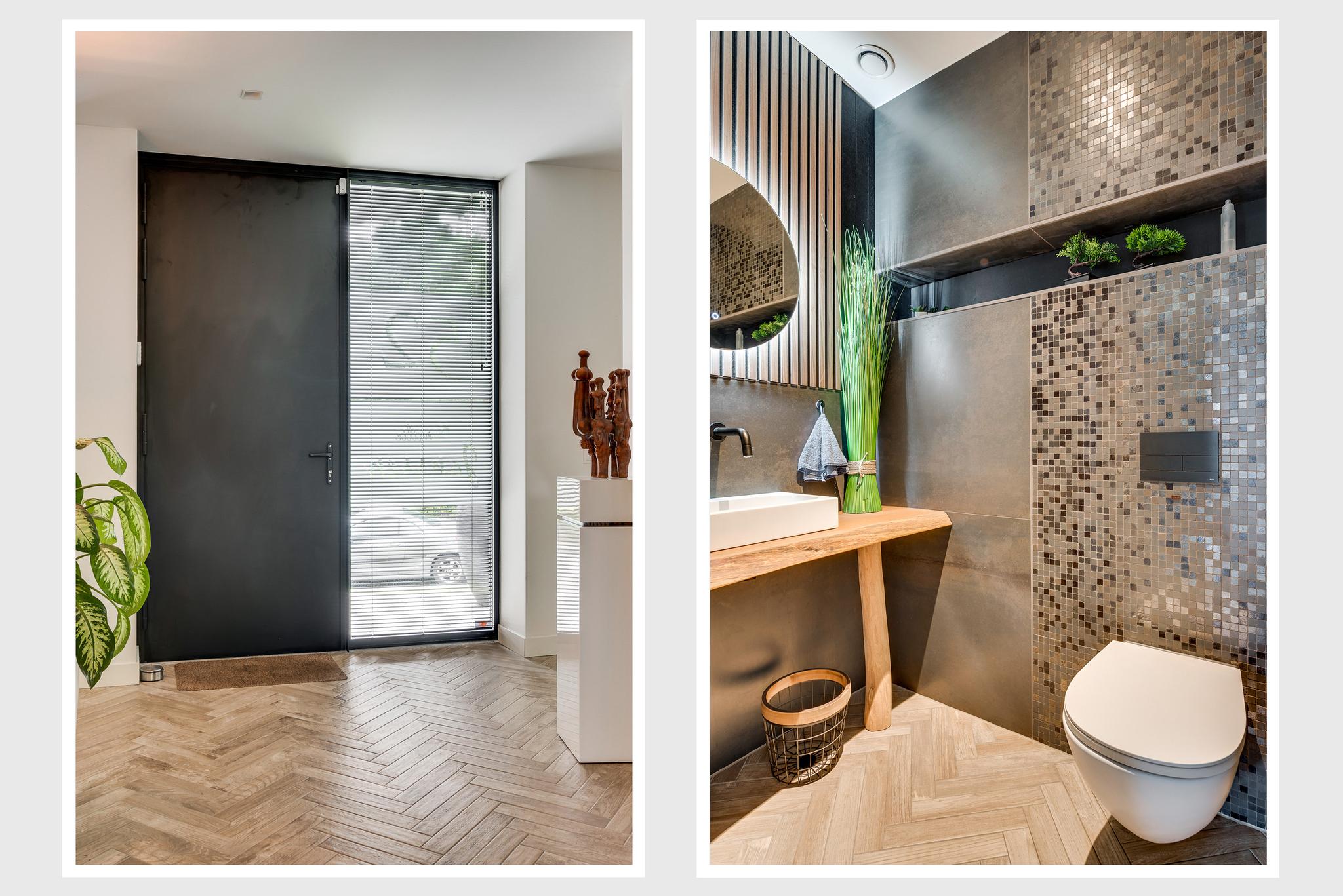Via de prachtige buitentrap, waarvan de treden lijken te zweven, loopt u naar de entree van deze prachtige villa. De royale ontvangsthal is het woonbeeld van luxe en sfeer, waar het daglicht op een fraaie wijze naar binnen valt. Aan de linkerzijde loopt u de eerste woonkamer (tv-kamer) in en aan de rechterzijde bevinden zich het luxe gastentoilet en de trap naar het souterrain. Als u rechtdoor loopt, komt u in de tweede woonkamer (tuinkamer) uit die in direct contact staat met de tuin. Fraai element is de visgraatvloer met houtlook, voorzien van vloerverwarming.