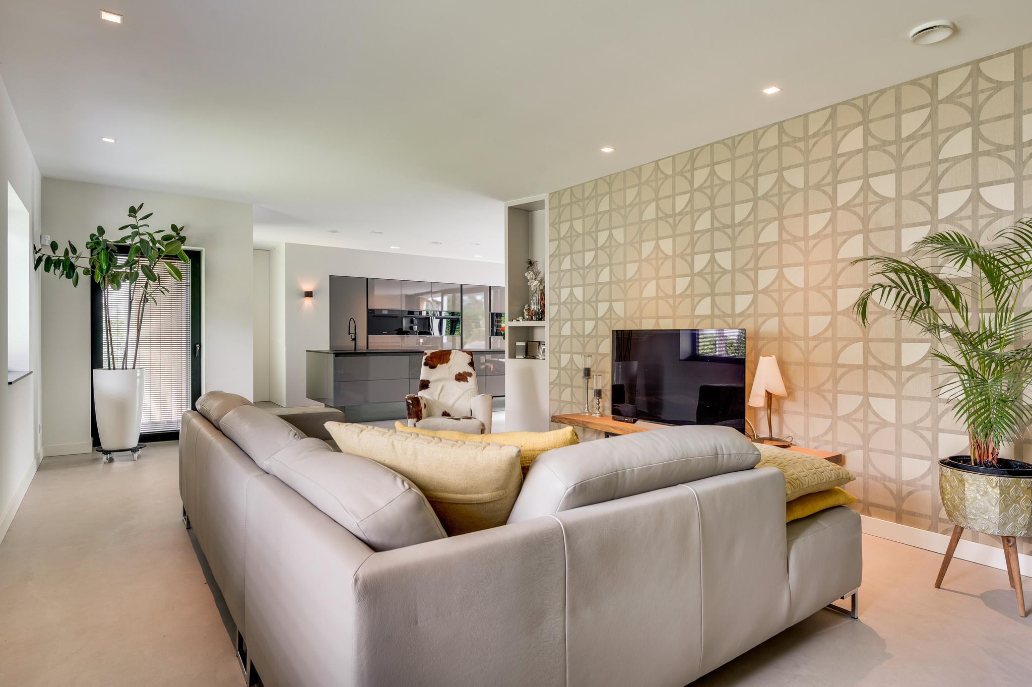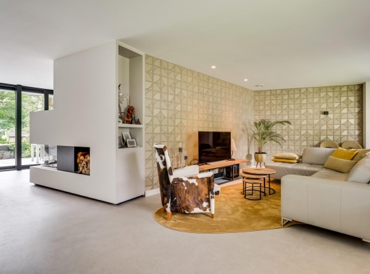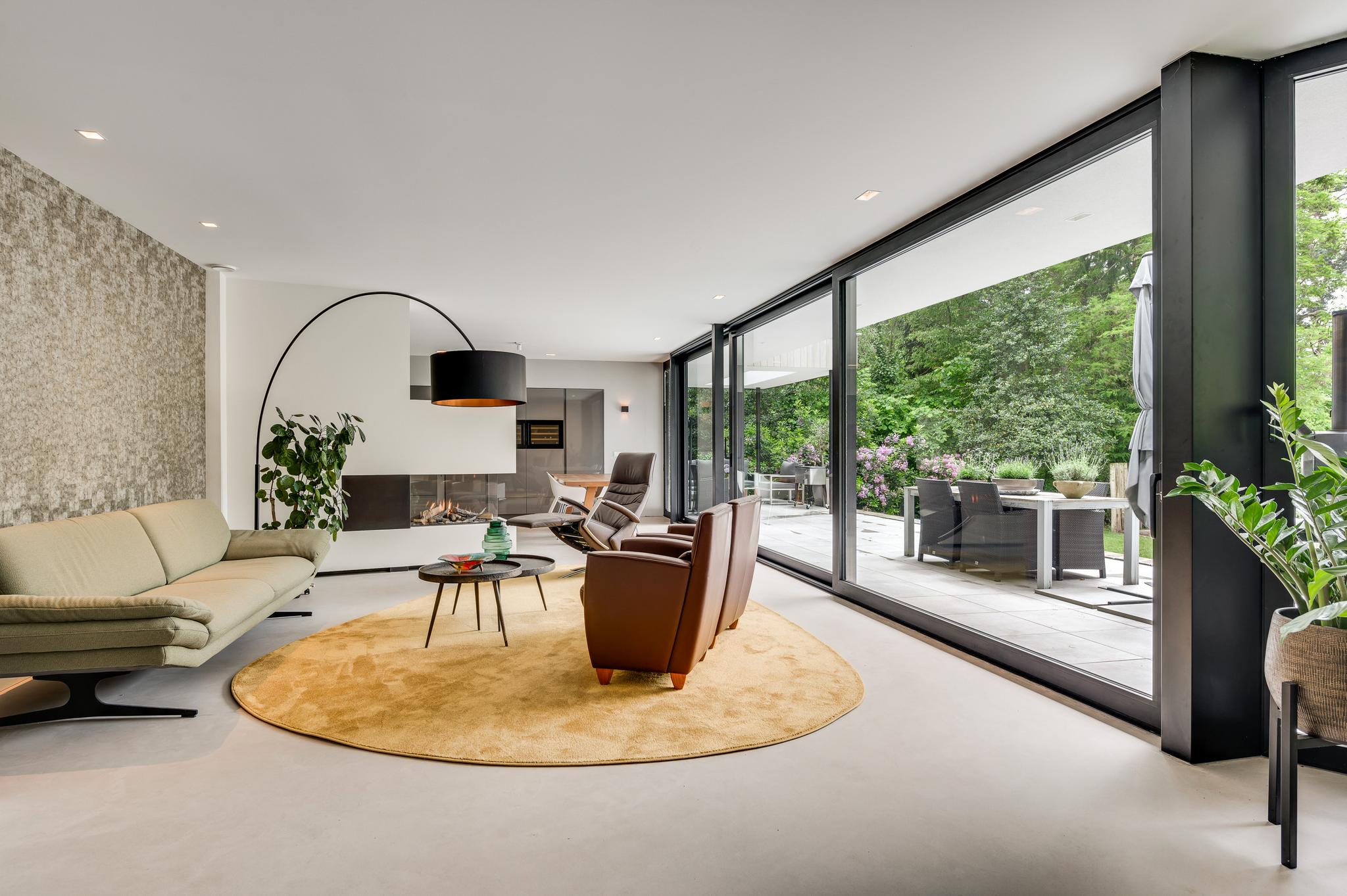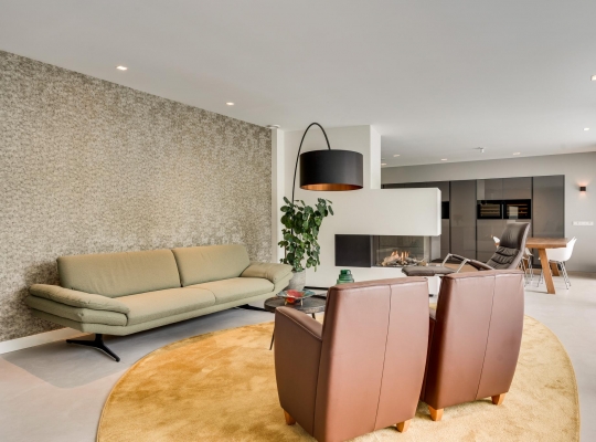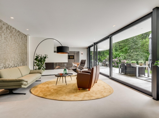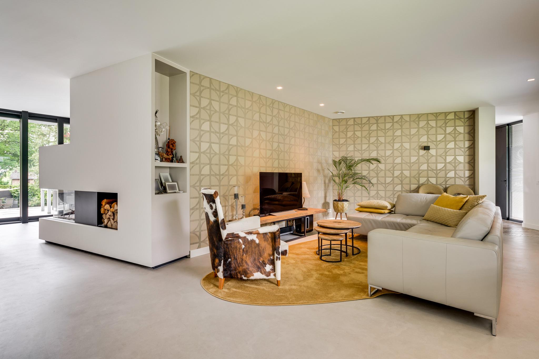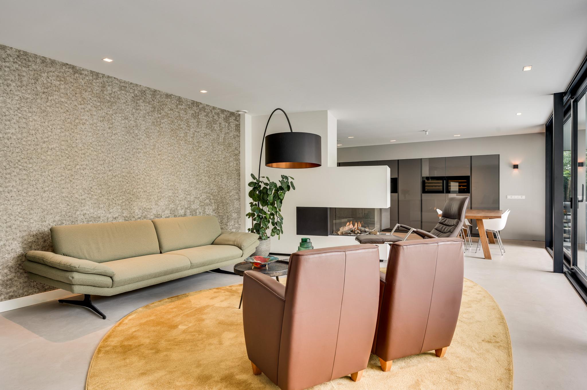 De tv-kamer (ca. 28 m2) staat in verbinding met de leefkeuken van ca. 37 m2. Achter de doorkijk gashaard bevindt zich de tuingerichte zitkamer (ca. 33 m2) met een grote schuifpui naar het deels overdekte terras. Zo heeft u de beschikking over een leef- en kookruimte van bijna 100 m2, met ramen van vloer tot plafond en een stijlvolle gevlinderde betonvloer. Stucwerk is gecombineerd met fraai patroonbehang en het plafond is voorzien van luxe inbouwspots.