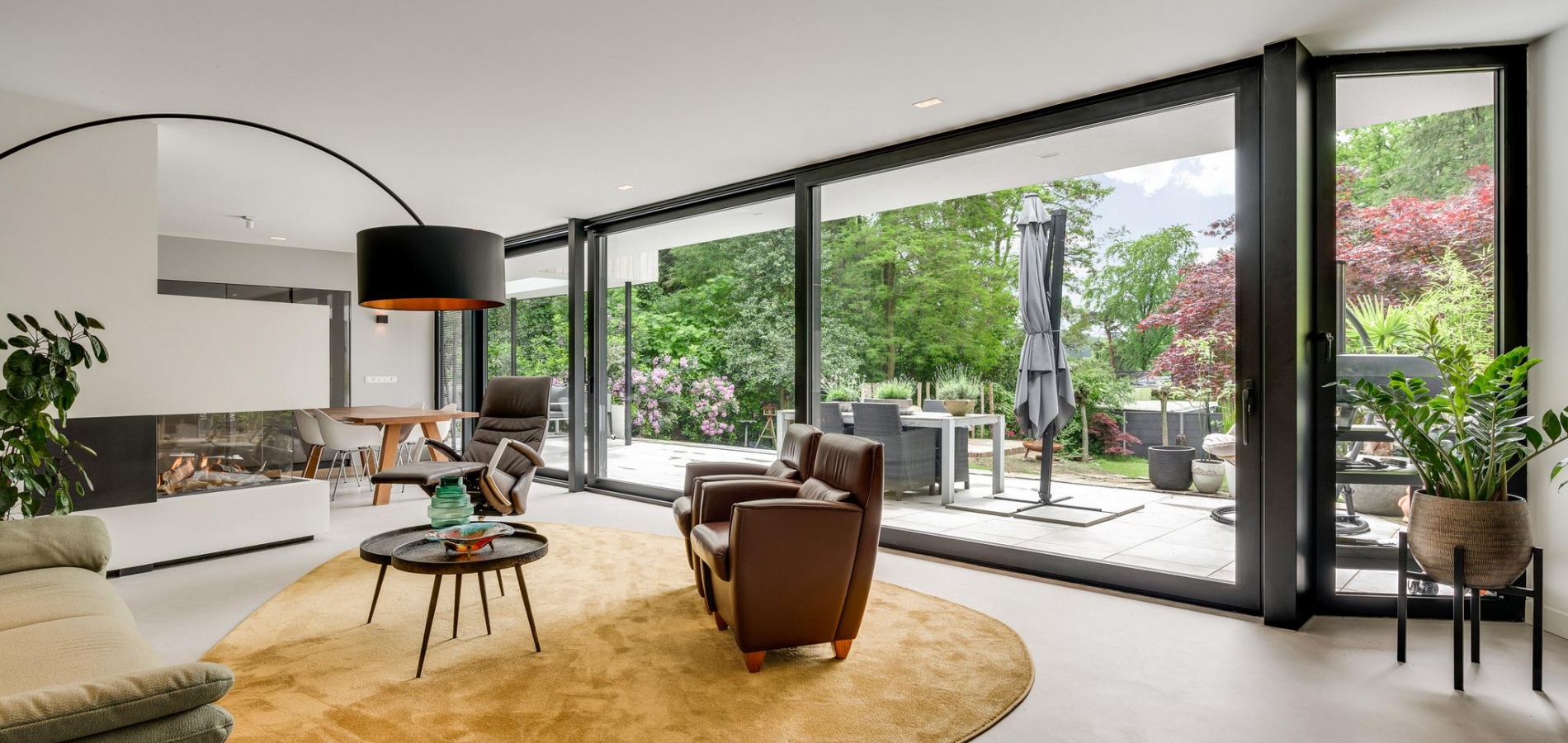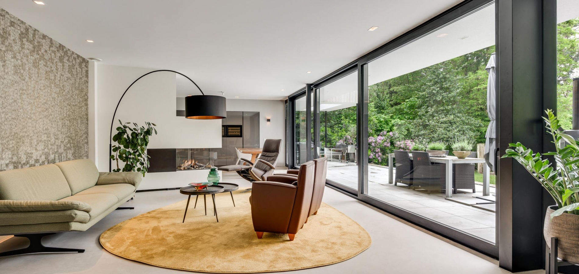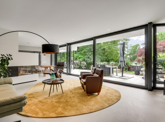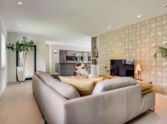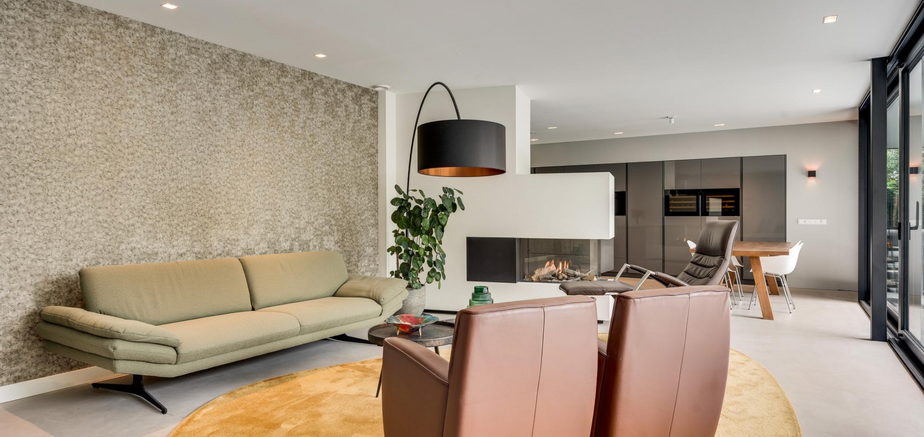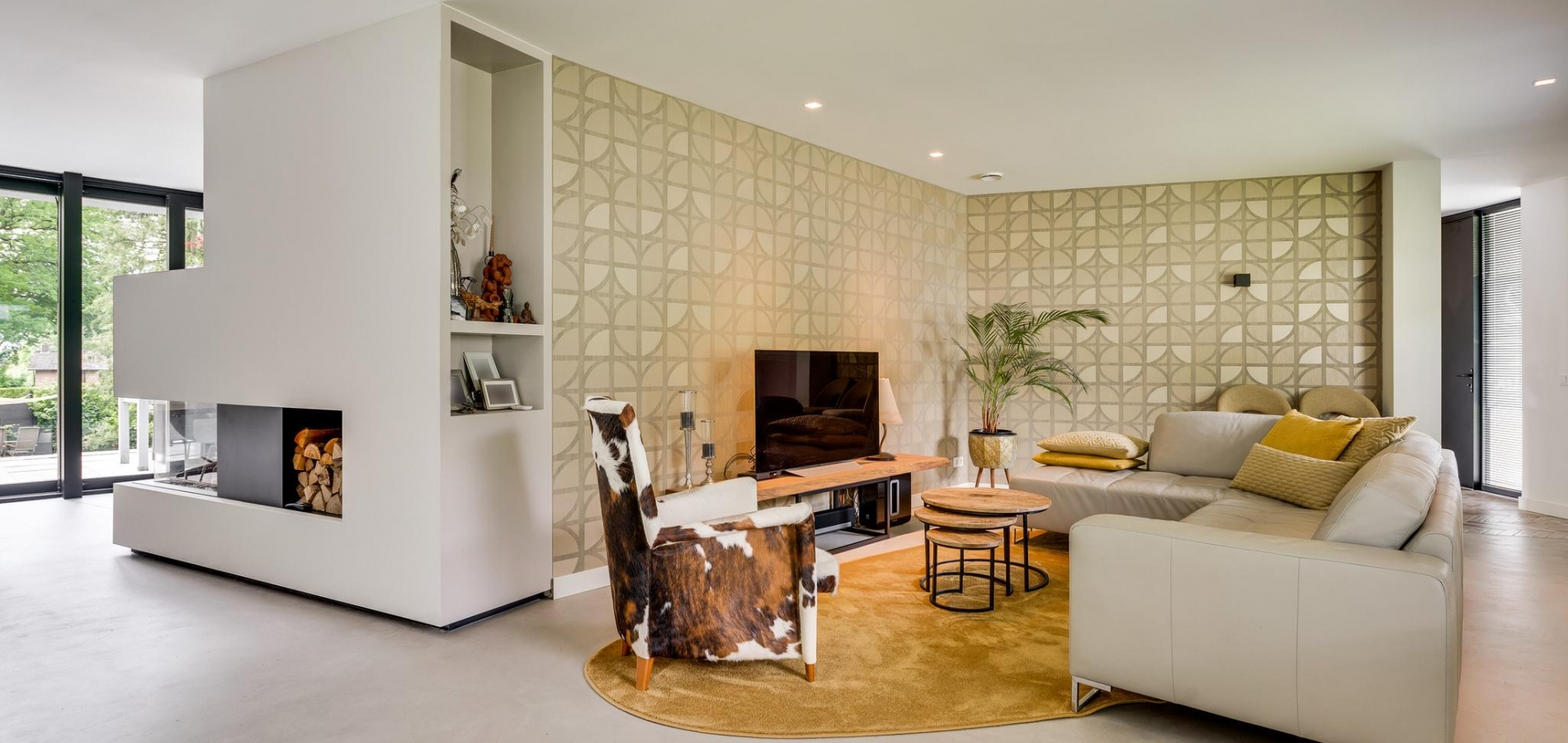 De tv-kamer (ca. 28 m2) staat in verbinding met de leefkeuken van ca. 37 m2. Achter de doorkijk gashaard bevindt zich de tuingerichte zitkamer (ca. 33 m2) met een grote schuifpui naar het deels overdekte terras. Zo heeft u de beschikking over een leef- en kookruimte van bijna 100 m2, met ramen van vloer tot plafond en een stijlvolle gevlinderde betonvloer. Stucwerk is gecombineerd met fraai patroonbehang en het plafond is voorzien van luxe inbouwspots.
