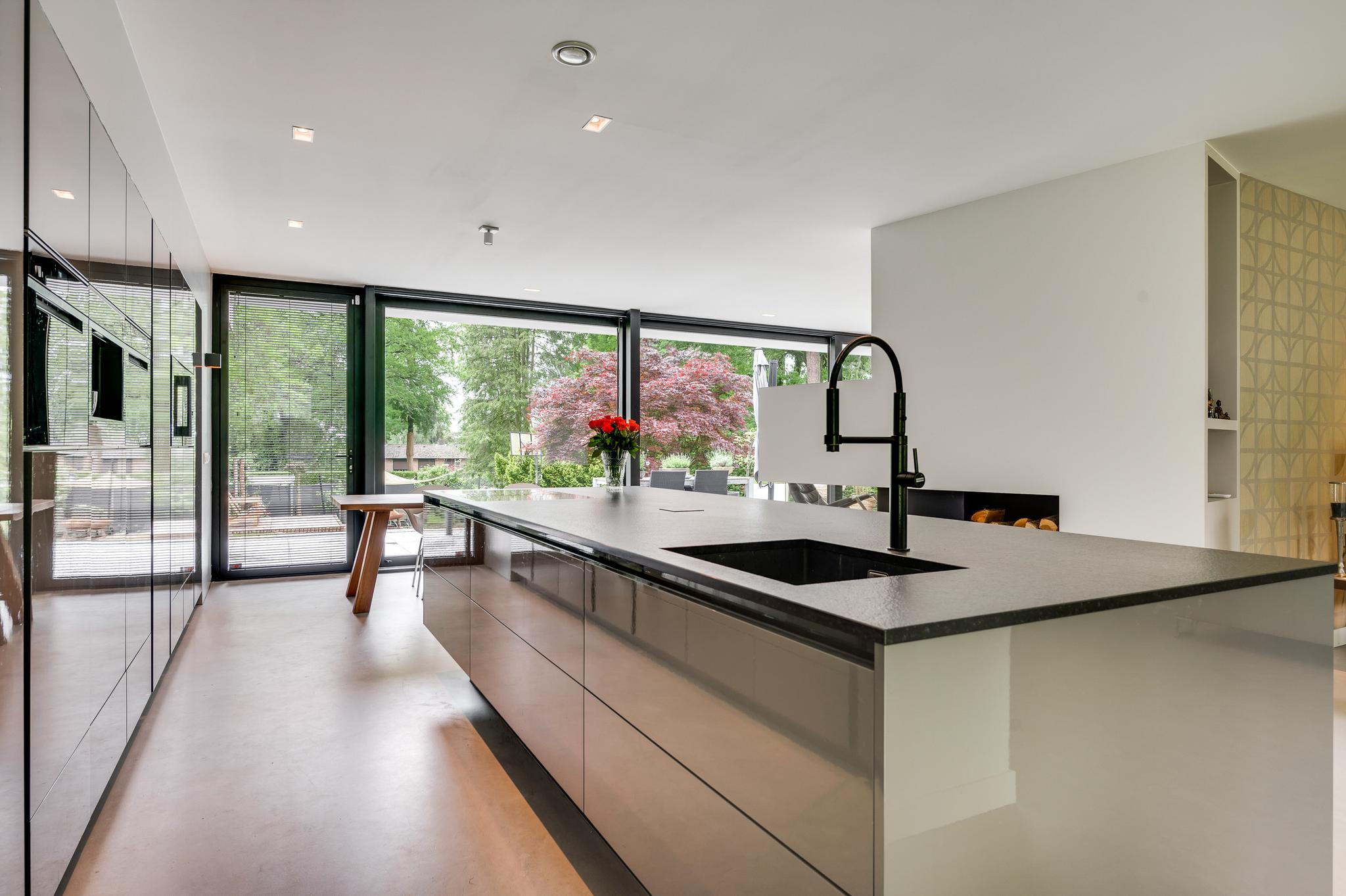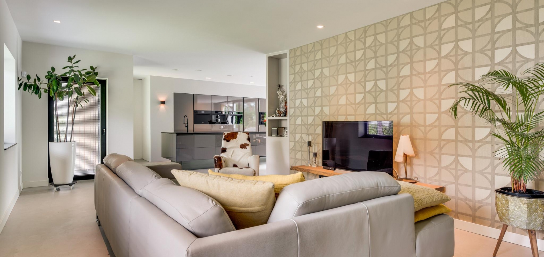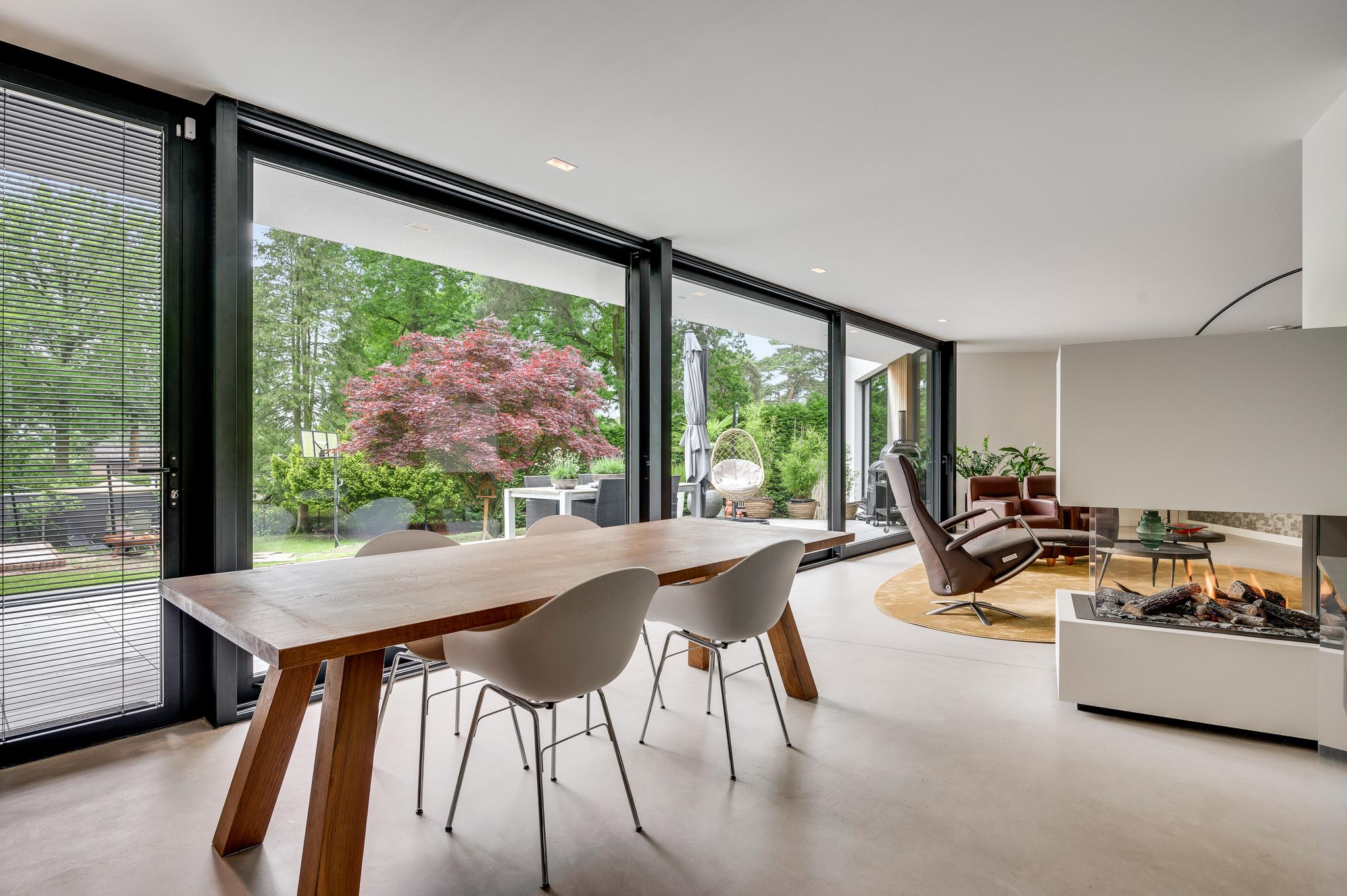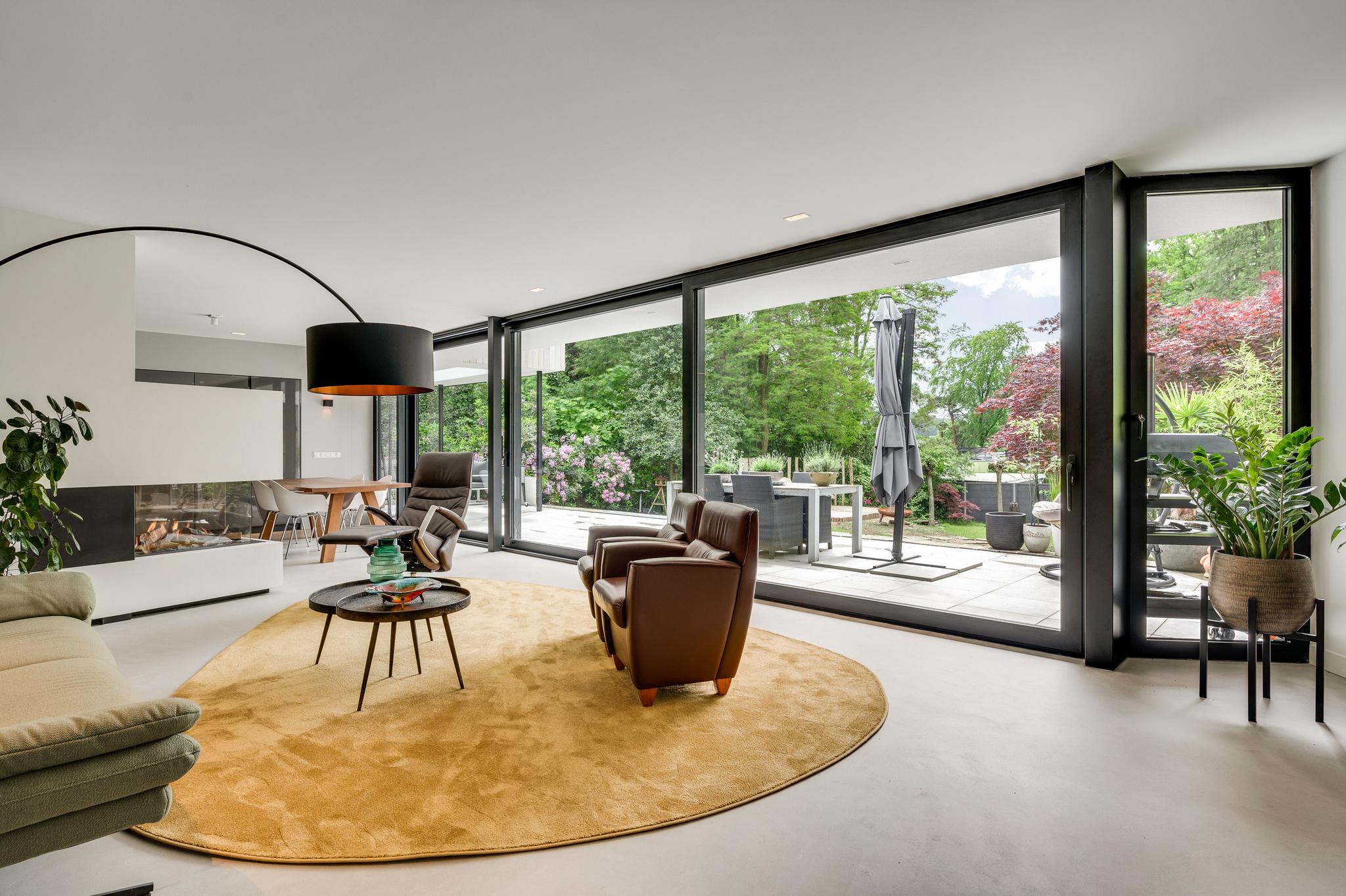 De tv-kamer (ca. 28 m2) staat in verbinding met de leefkeuken van ca. 37 m2. Achter de doorkijk gashaard bevindt zich de tuingerichte zitkamer (ca. 33 m2) met een grote schuifpui naar het deels overdekte terras. Zo heeft u de beschikking over een leef- en kookruimte van bijna 100 m2, met ramen van vloer tot plafond en een stijlvolle gevlinderde betonvloer. Stucwerk is gecombineerd met fraai patroonbehang en het plafond is voorzien van luxe inbouwspots.