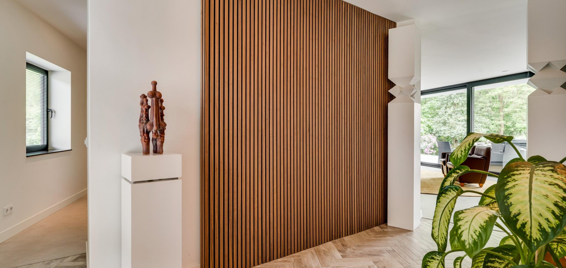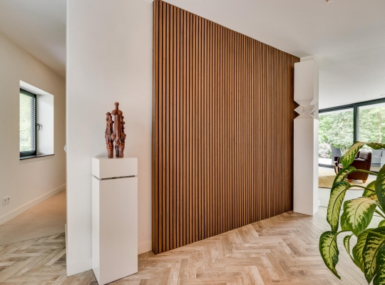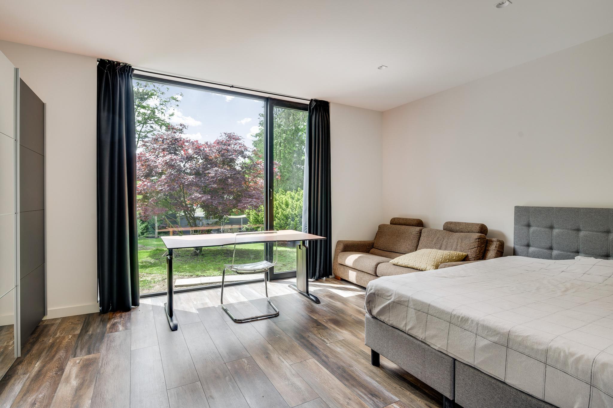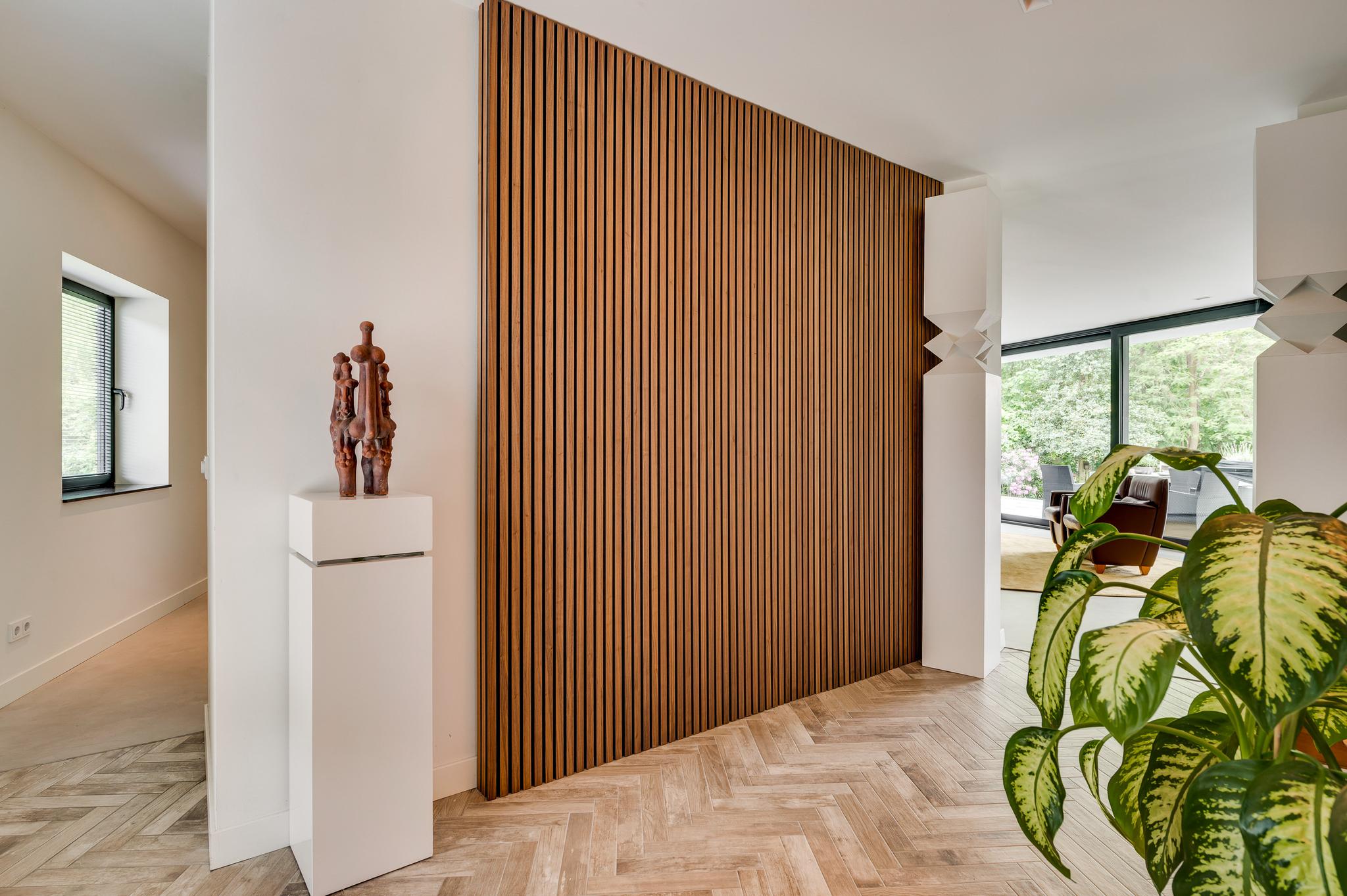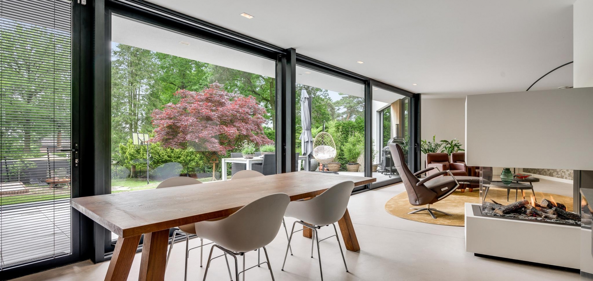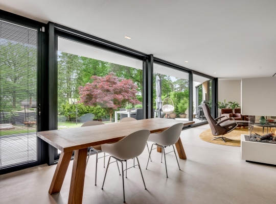 De tv-kamer (ca. 28 m2) staat in verbinding met de leefkeuken van ca. 37 m2. Achter de doorkijk gashaard bevindt zich de tuingerichte zitkamer (ca. 33 m2) met een grote schuifpui naar het deels overdekte terras. Zo heeft u de beschikking over een leef- en kookruimte van bijna 100 m2, met ramen van vloer tot plafond en een stijlvolle gevlinderde betonvloer. Stucwerk is gecombineerd met fraai patroonbehang en het plafond is voorzien van luxe inbouwspots.