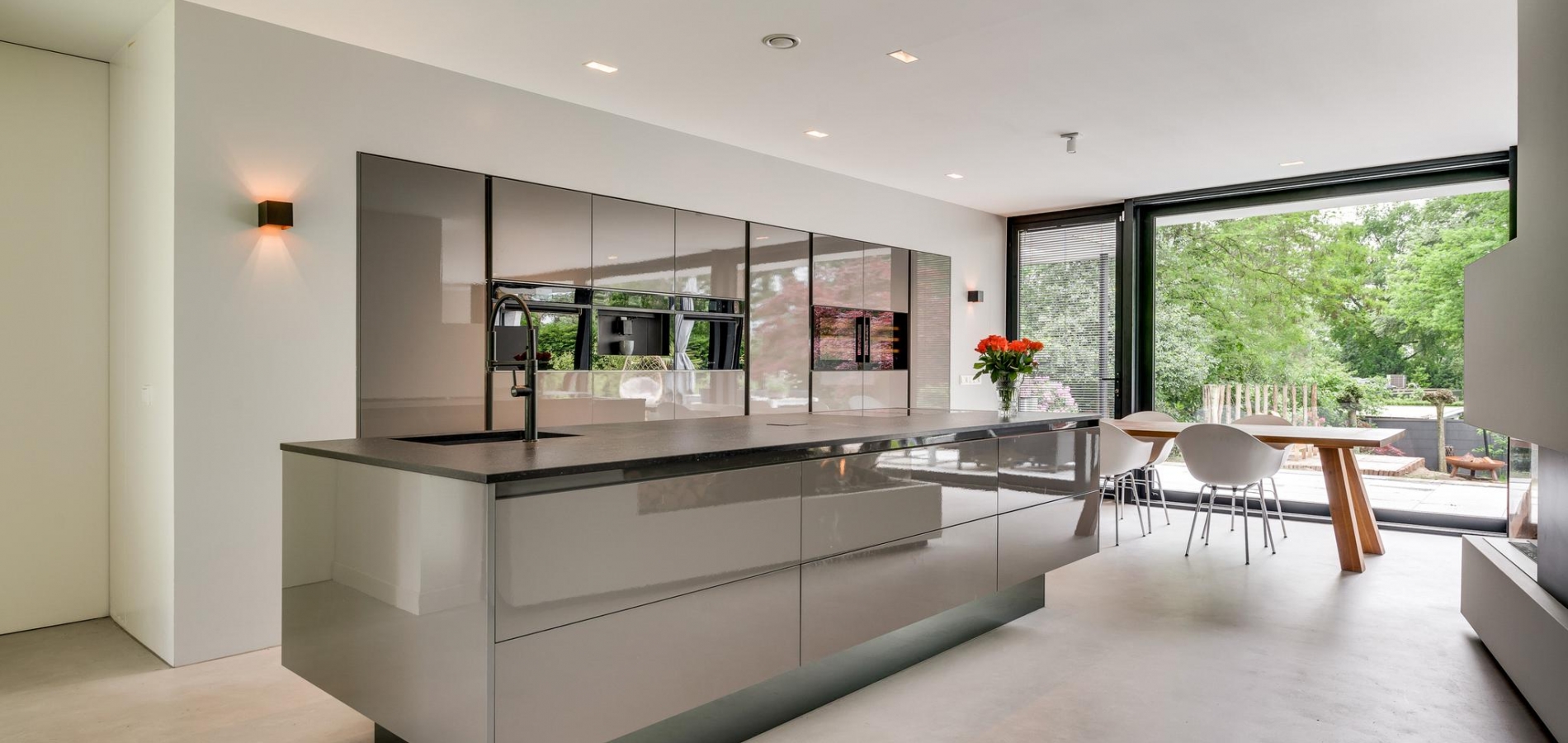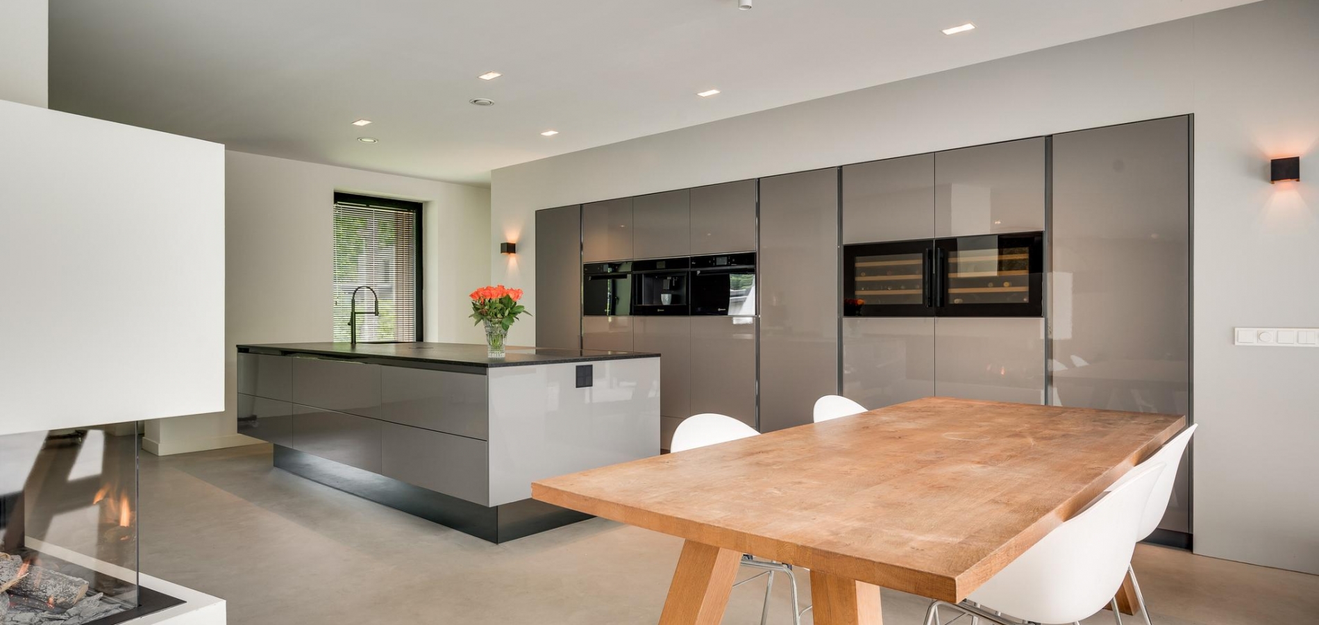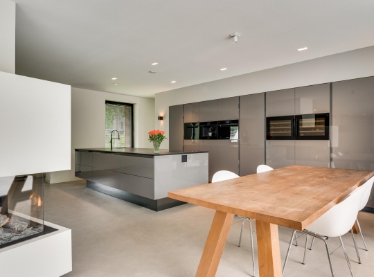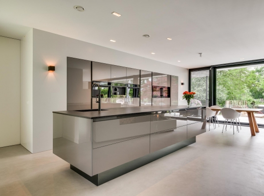 Keukenzinnig, een design keukenontwerper uit Geleen, heeft een unieke designkeuken ontworpen met een groot kook-/spoeleiland en een grote kastenwand, die in de muur is verzonken. De grijze kleur past perfect bij het granieten blad en alle denkbare inbouwapparatuur van topkwaliteit is ingebouwd: een inductiekookplaat met afzuiging, twee combi-ovens, een koelkast, vriezer, vaatwasser, koffiemachine en twee wijnkoelers.
