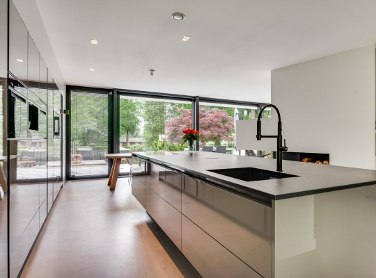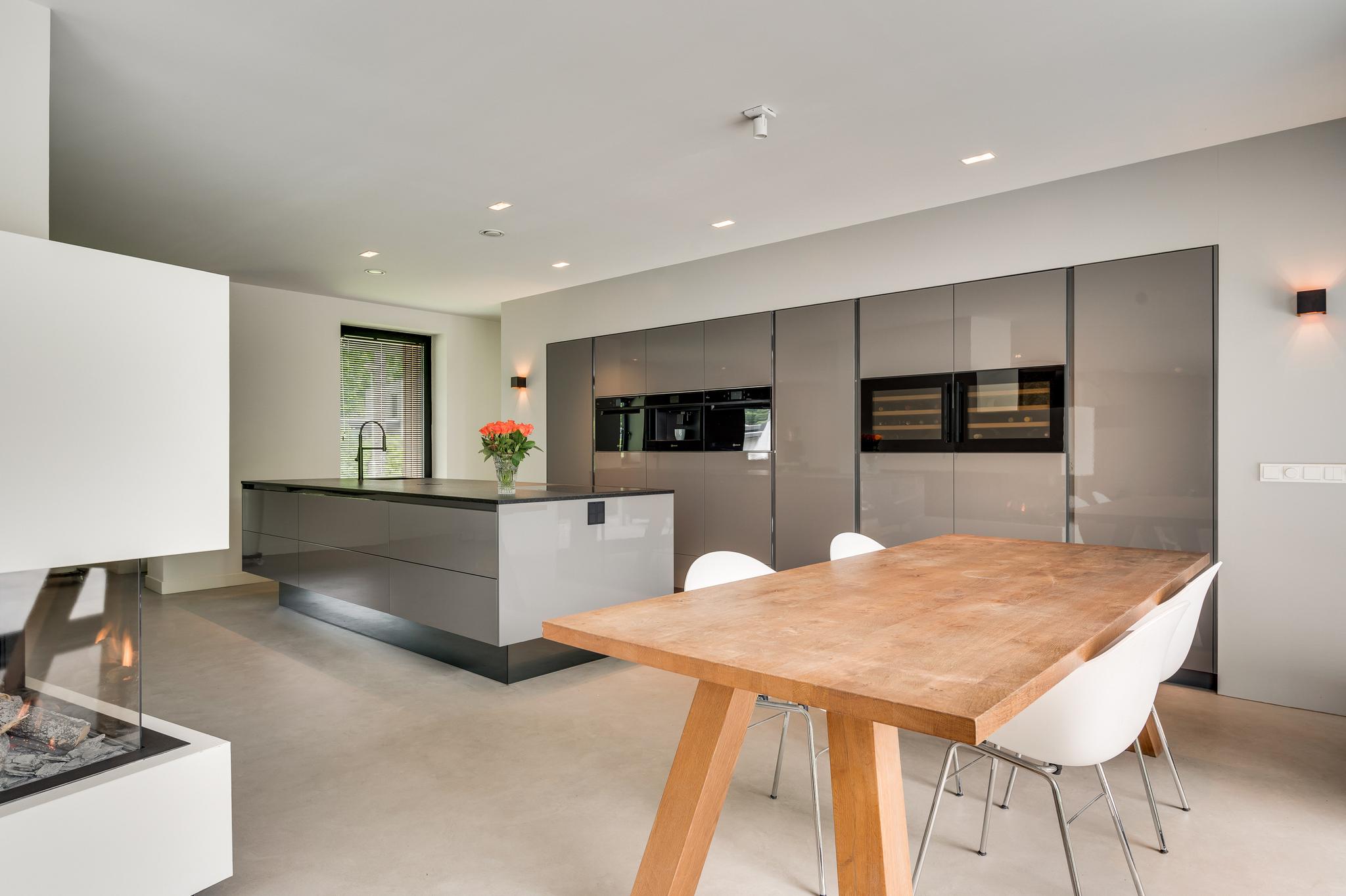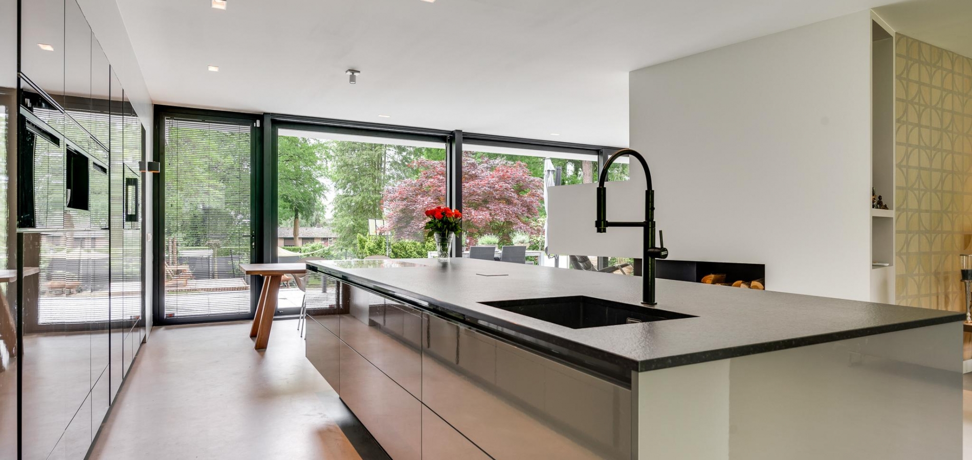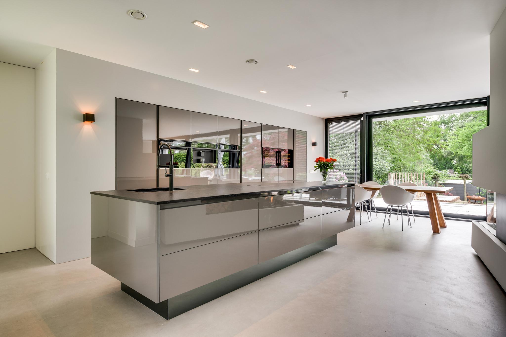 Keukenzinnig, een design keukenontwerper uit Geleen, heeft een unieke designkeuken ontworpen met een groot kook-/spoeleiland en een grote kastenwand, die in de muur is verzonken. De grijze kleur past perfect bij het granieten blad en alle denkbare inbouwapparatuur van topkwaliteit is ingebouwd: een inductiekookplaat met afzuiging, twee combi-ovens, een koelkast, vriezer, vaatwasser, koffiemachine en twee wijnkoelers.