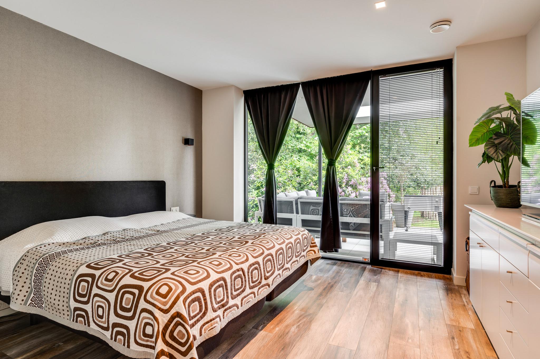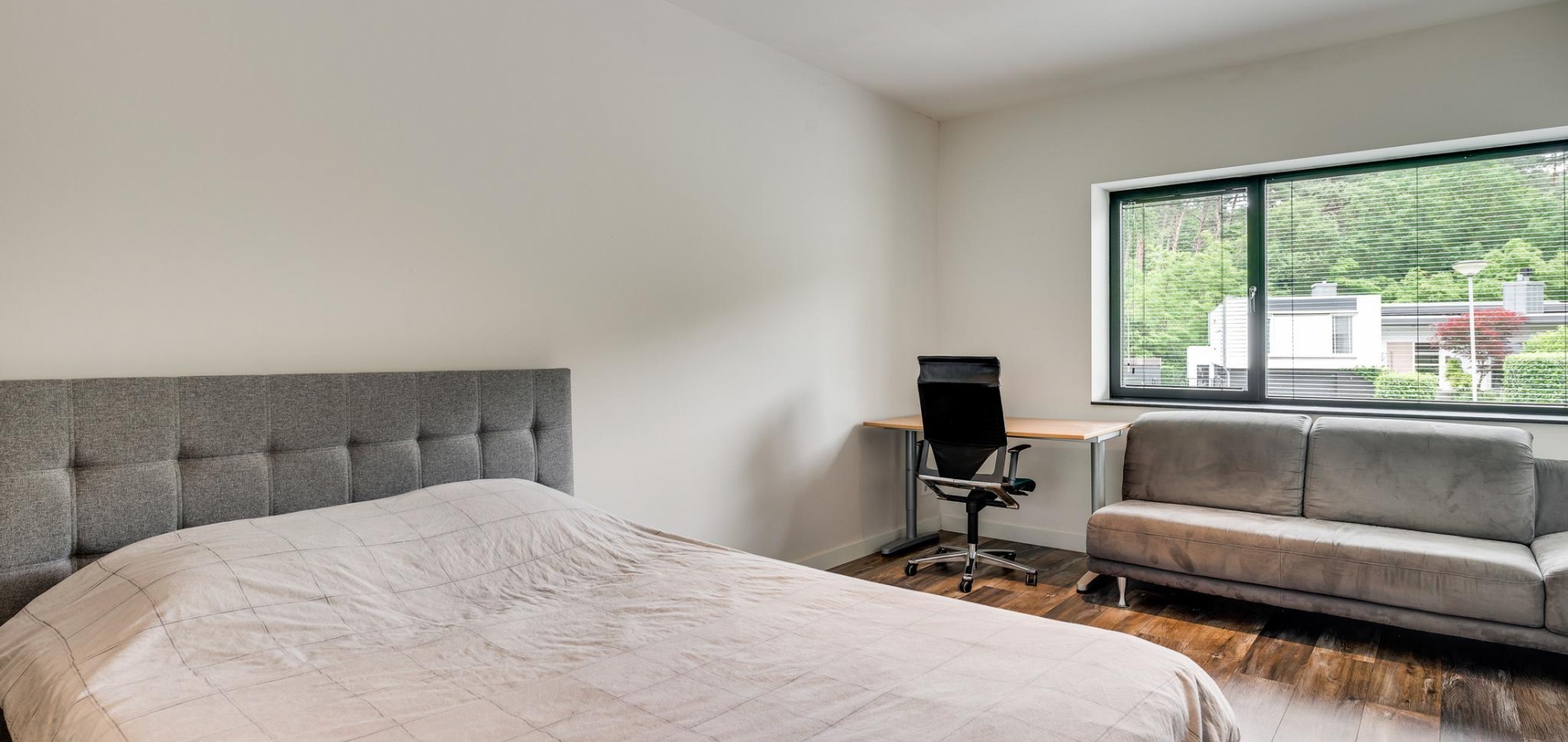 In het rechterdeel van de villa zijn twee ruime slaapkamers van ca. 19 m2. Beide slaapkamers bieden genoeg ruimte om een tweepersoonsbed, garderobekast, bureau en een bank neer te zetten. Het uitzicht naar de voortuin en brede laan is fraai, maar ook het uitzicht naar de achtertuin verdient uw aandacht. Aan deze zijde van de villa is de tweede badkamer (ca. 6 m2) met een ligbad, inloopdouche en twee wastafels op een houten blad. Qua luxe en materiaalgebruik is deze badkamer te vergelijken met badkamer I.