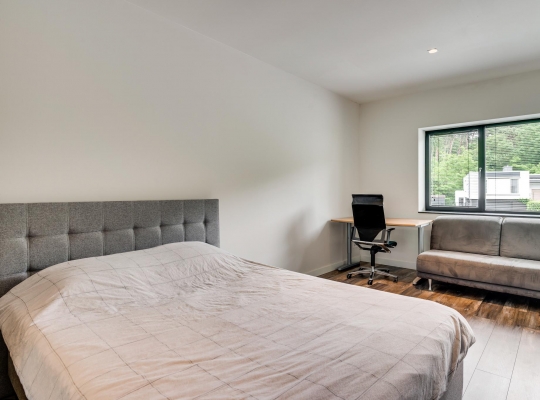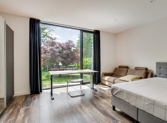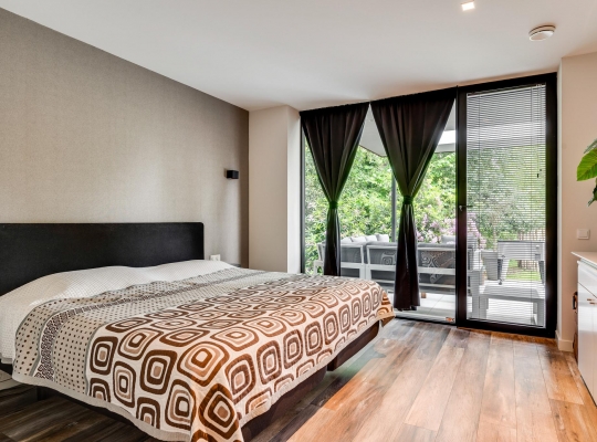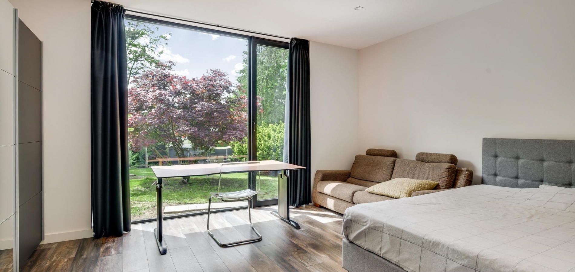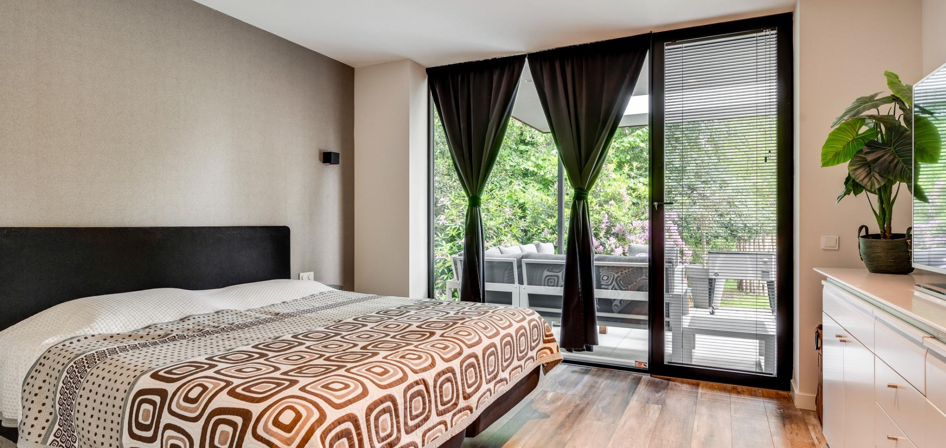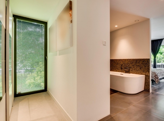 In het linkerdeel van de villa bevindt zich de master bedroom (ca. 13 m2) met een dressing (ca. 9 m2) en een privébadkamer (ca. 6 m2). De slaapkamer met fraai uitzicht naar de tuin is een oase van rust en geeft u de beleving van een luxe hotelkamer. In de dressing bieden de kasten volop ruimte voor uw kleding, schoenen en accessoires.