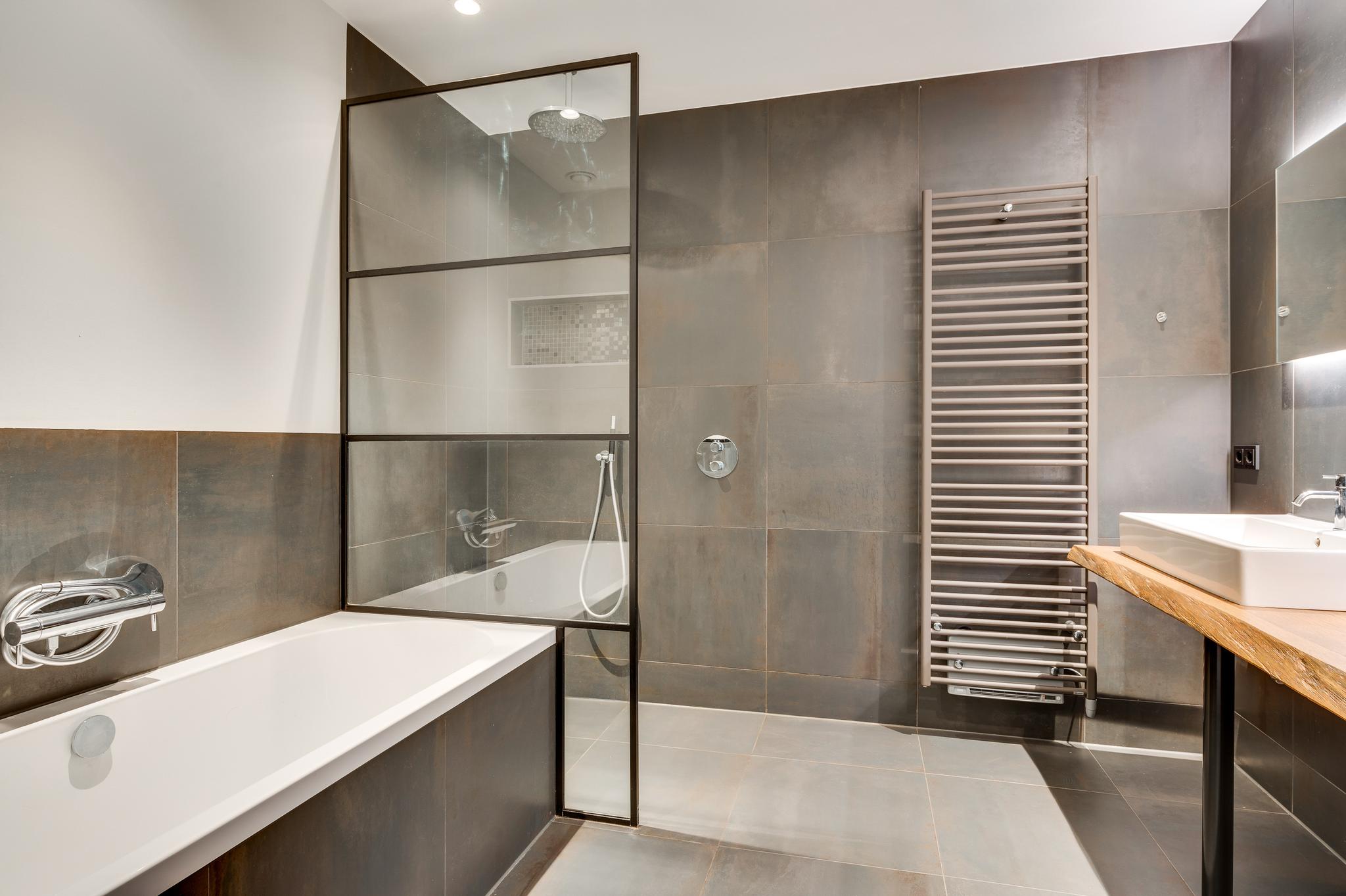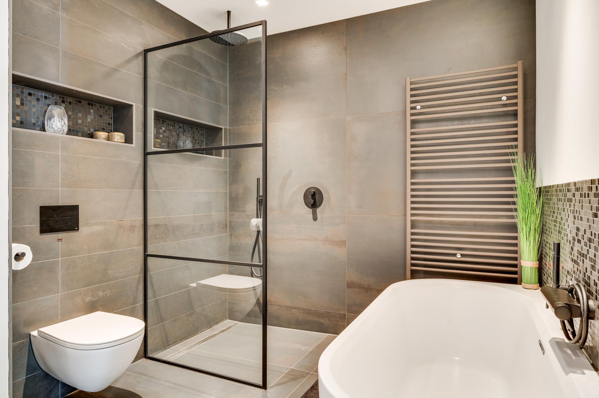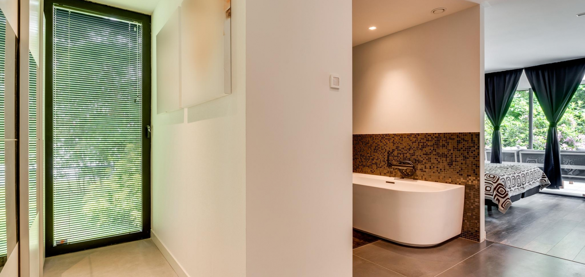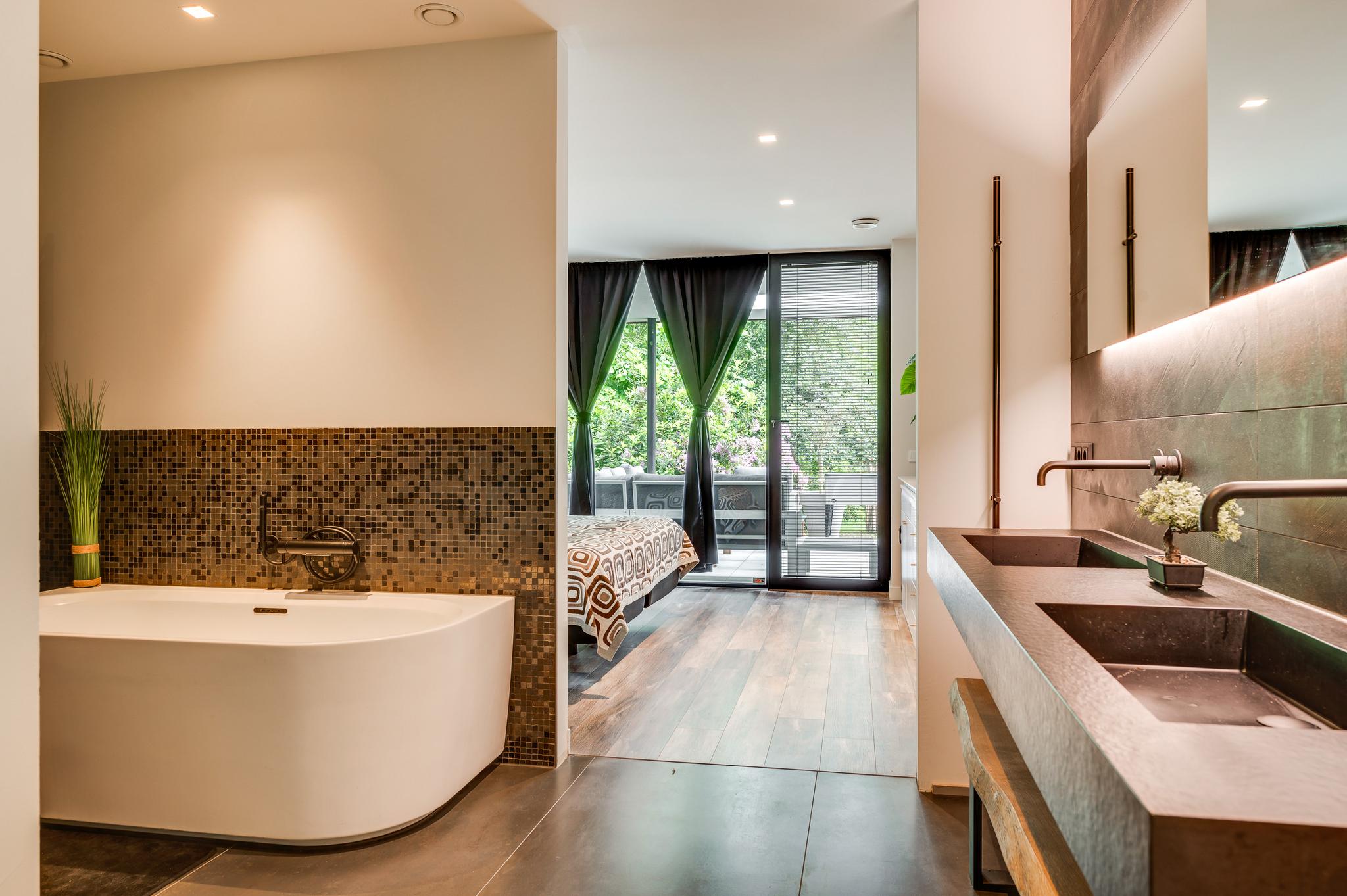 De badkamer met design sanitair is ingedeeld met een ligbad met watervalkraan, inloopdouche, wandcloset en een dubbele wastafel uit 1 stuk natuursteen. Fraaie elementen zijn de regendouche, verwarmde spiegel, twee handdoekwarmers, het tegelwerk en de elektrische radiator met afstandsbediening.