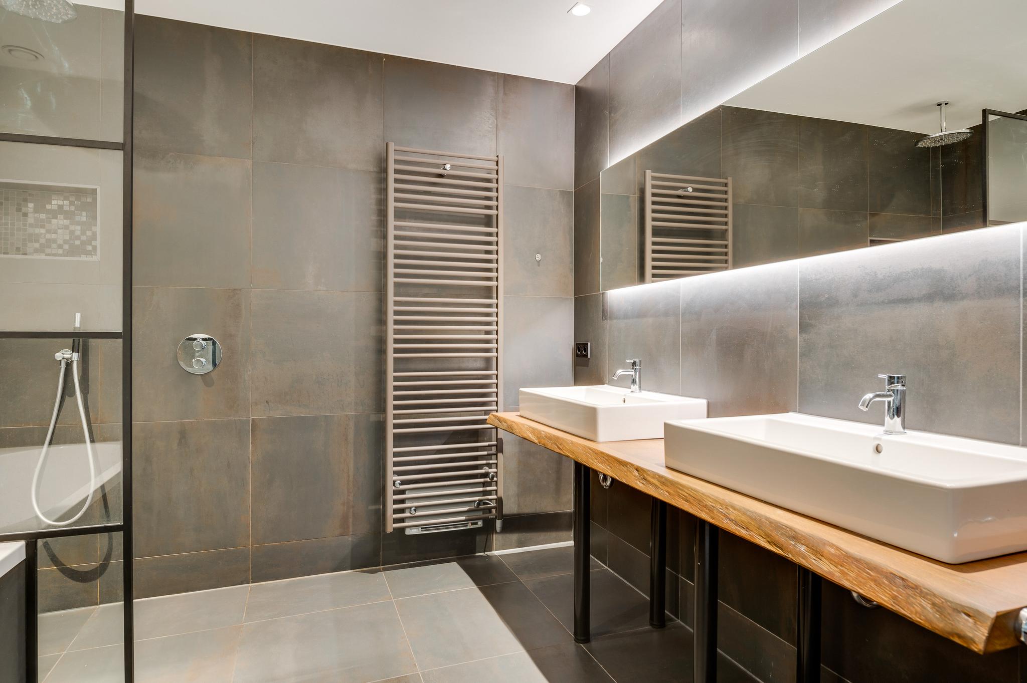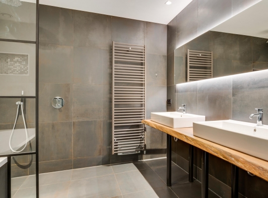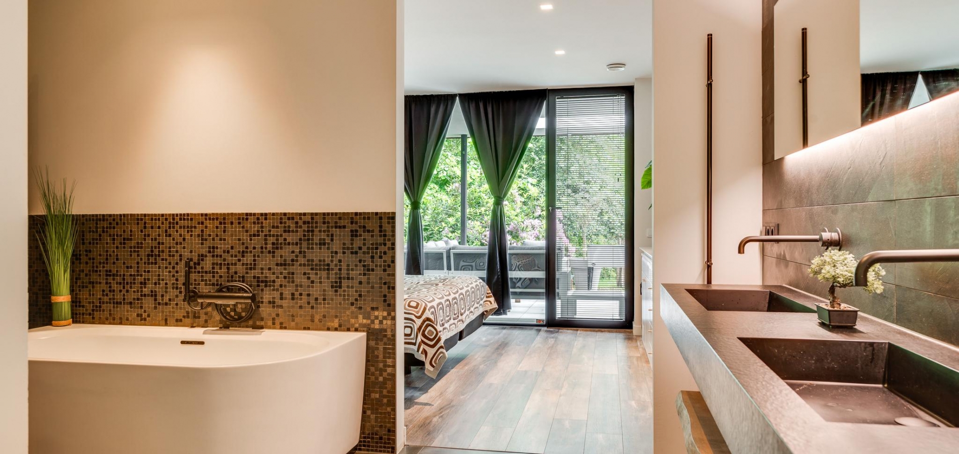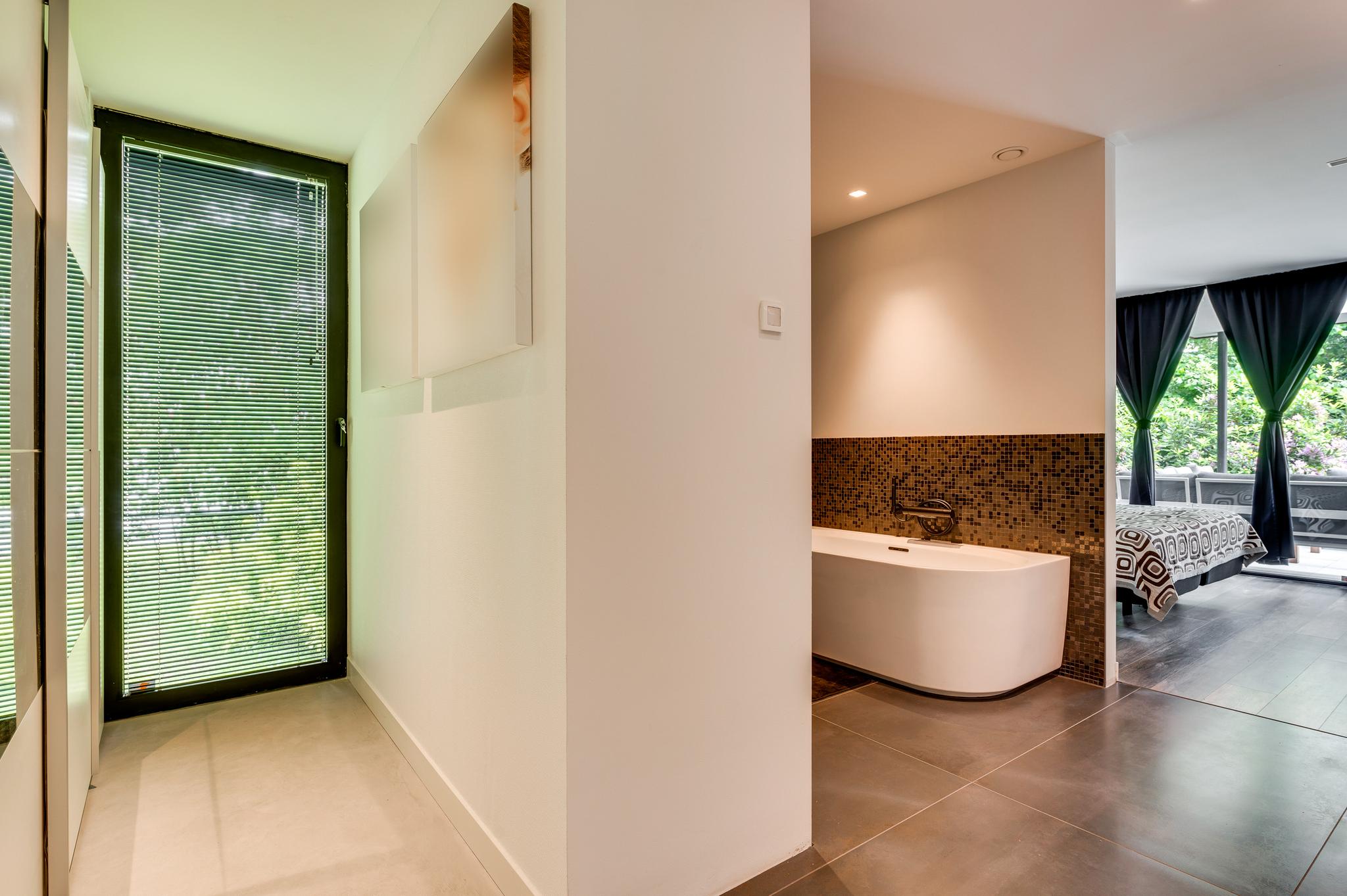 De badkamer met design sanitair is ingedeeld met een ligbad met watervalkraan, inloopdouche, wandcloset en een dubbele wastafel uit 1 stuk natuursteen. Fraaie elementen zijn de regendouche, verwarmde spiegel, twee handdoekwarmers, het tegelwerk en de elektrische radiator met afstandsbediening.