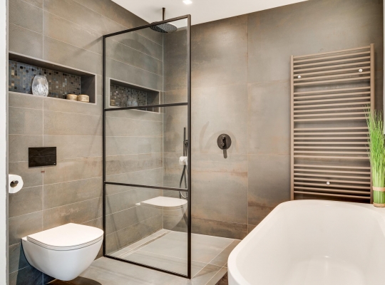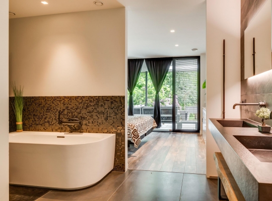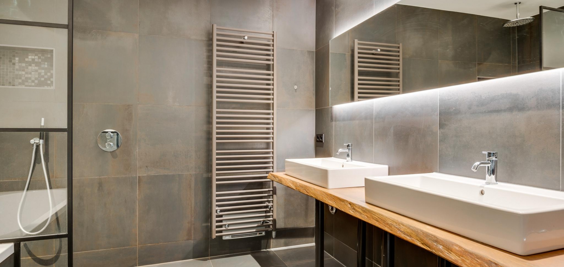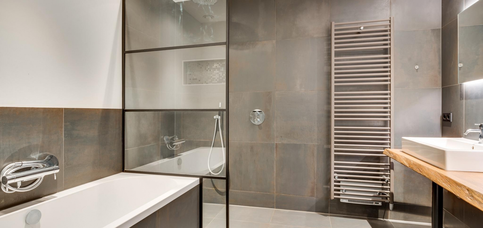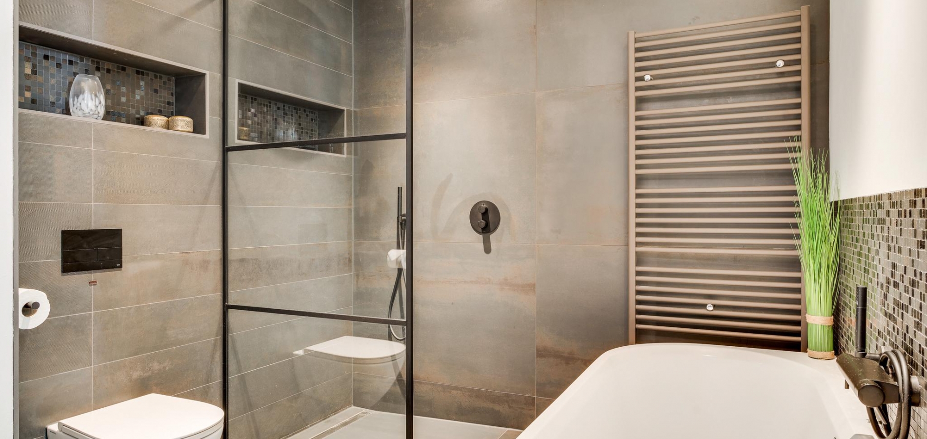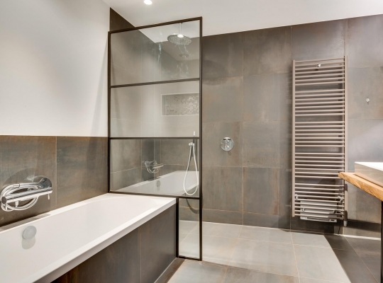 De badkamer met design sanitair is ingedeeld met een ligbad met watervalkraan, inloopdouche, wandcloset en een dubbele wastafel uit 1 stuk natuursteen. Fraaie elementen zijn de regendouche, verwarmde spiegel, twee handdoekwarmers, het tegelwerk en de elektrische radiator met afstandsbediening.