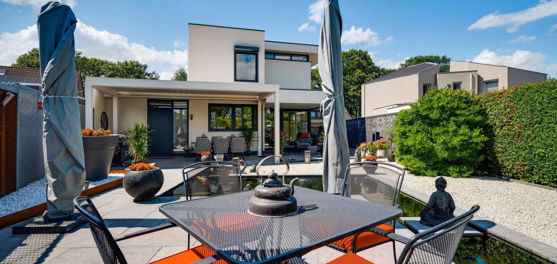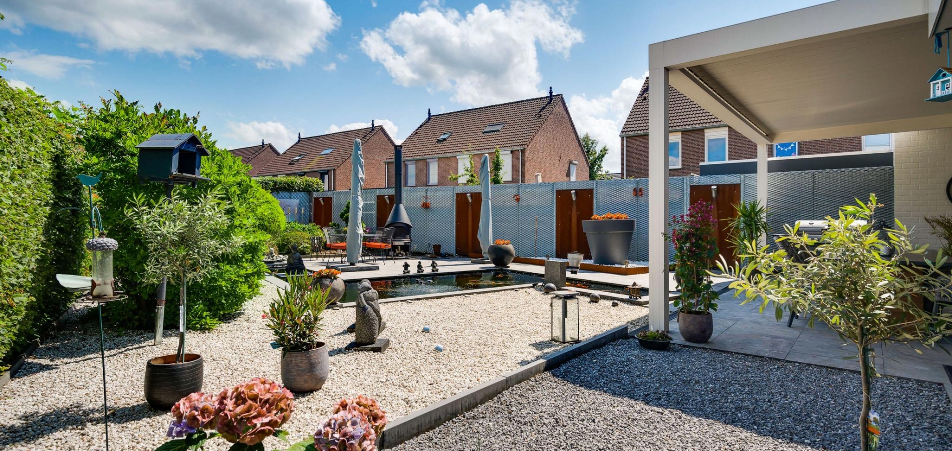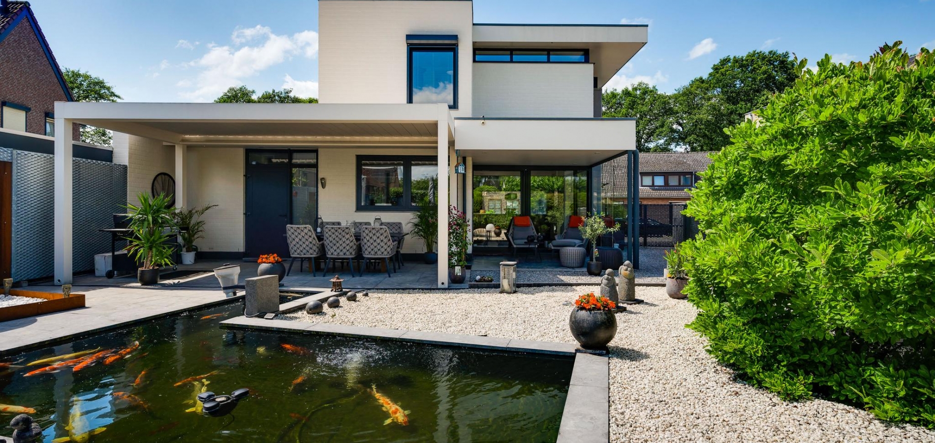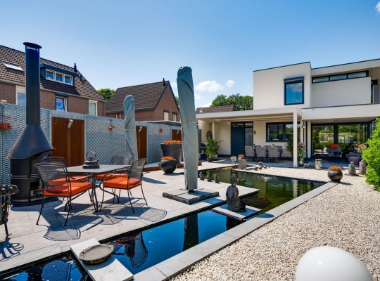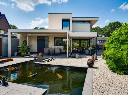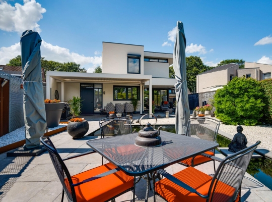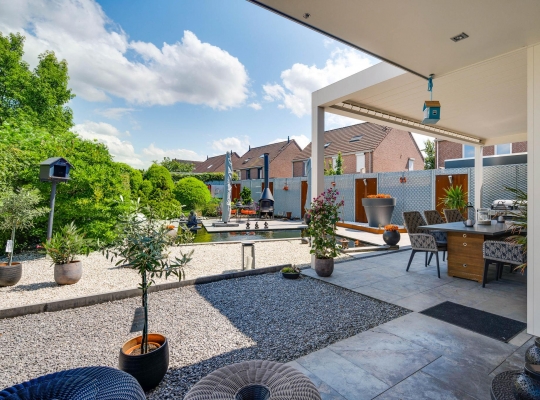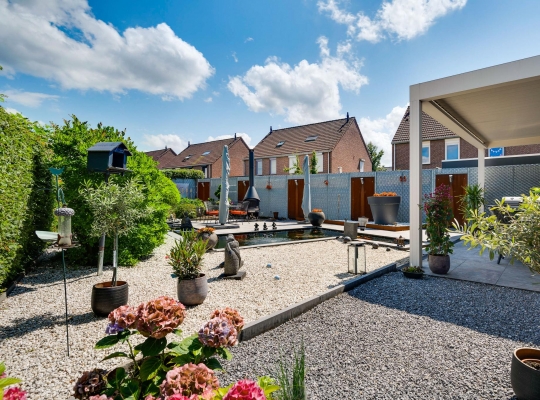 De diepe, onderhoudsvriendelijke achtertuin is gesitueerd op het oosten. Grind in verschillende kleuren is gecombineerd met een prachtige, moderne vijver en meerdere terrassen. Het terras met elektrisch bedienbaar lamellendak is de perfecte plek om de tuin te bewonderen en het terras naast de vijver is voor de zonliefhebber. Links van de villa is een eigen, brede achterom met dubbele poort. De voortuin en de oprit voor twee auto’s maken de villa meer dan af.