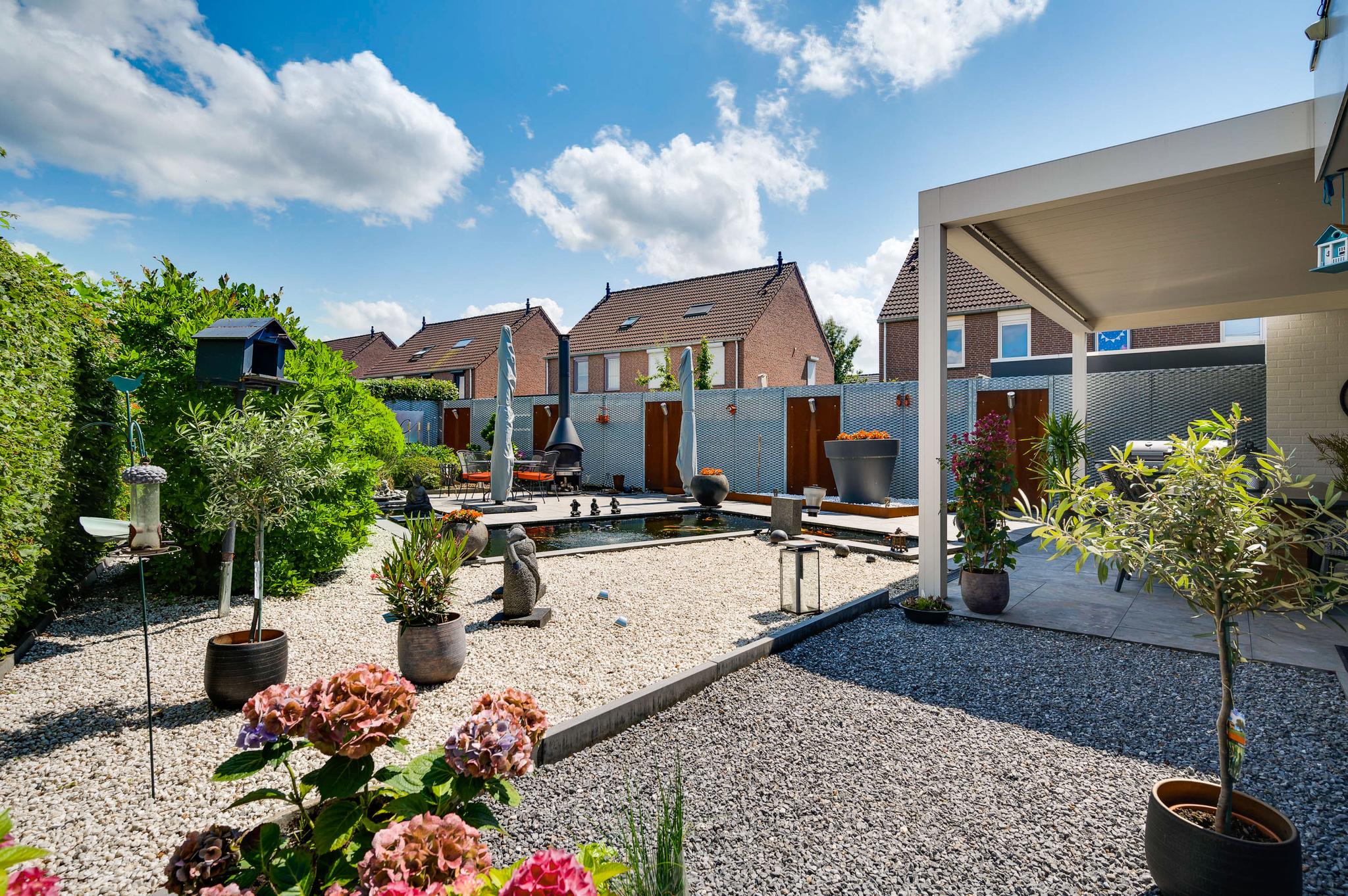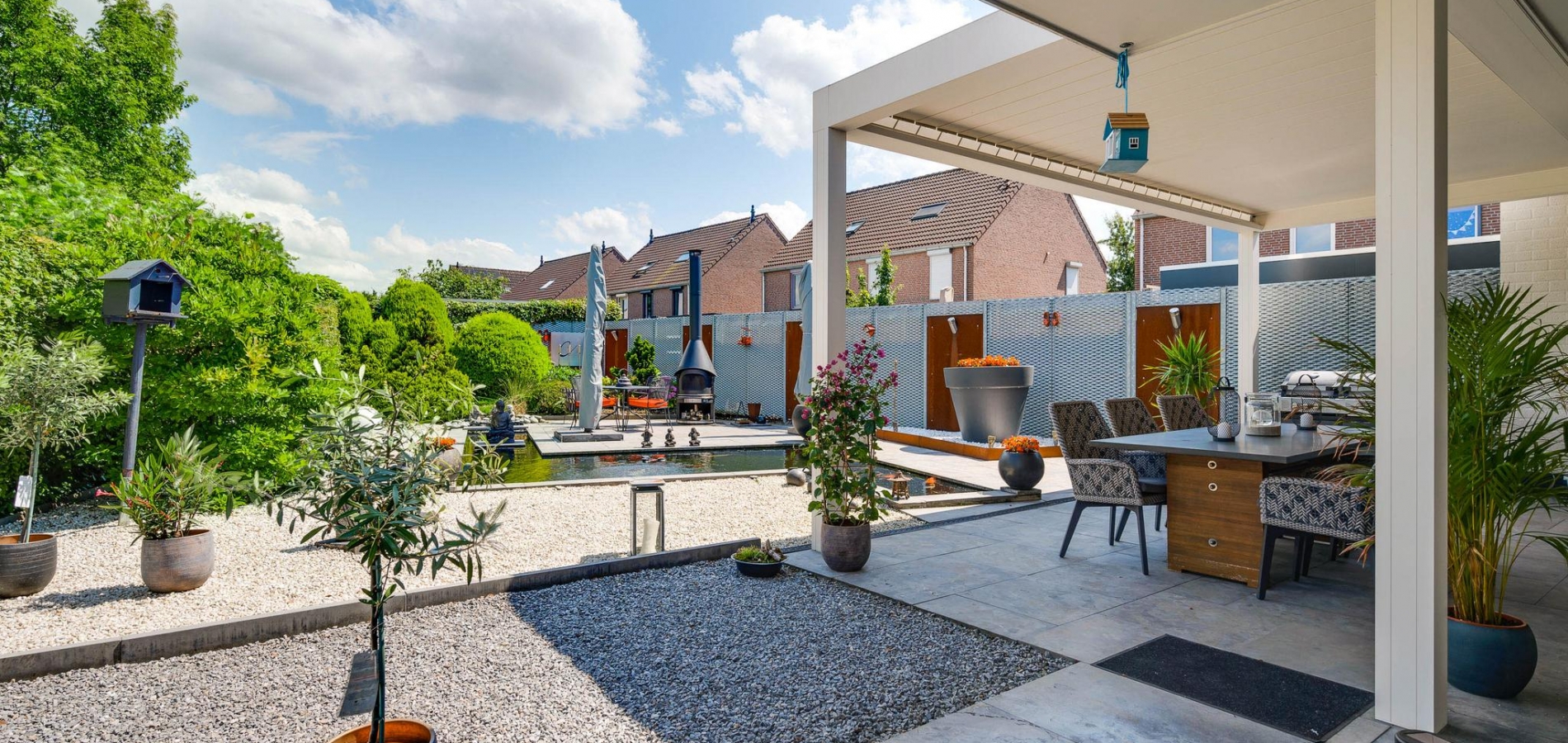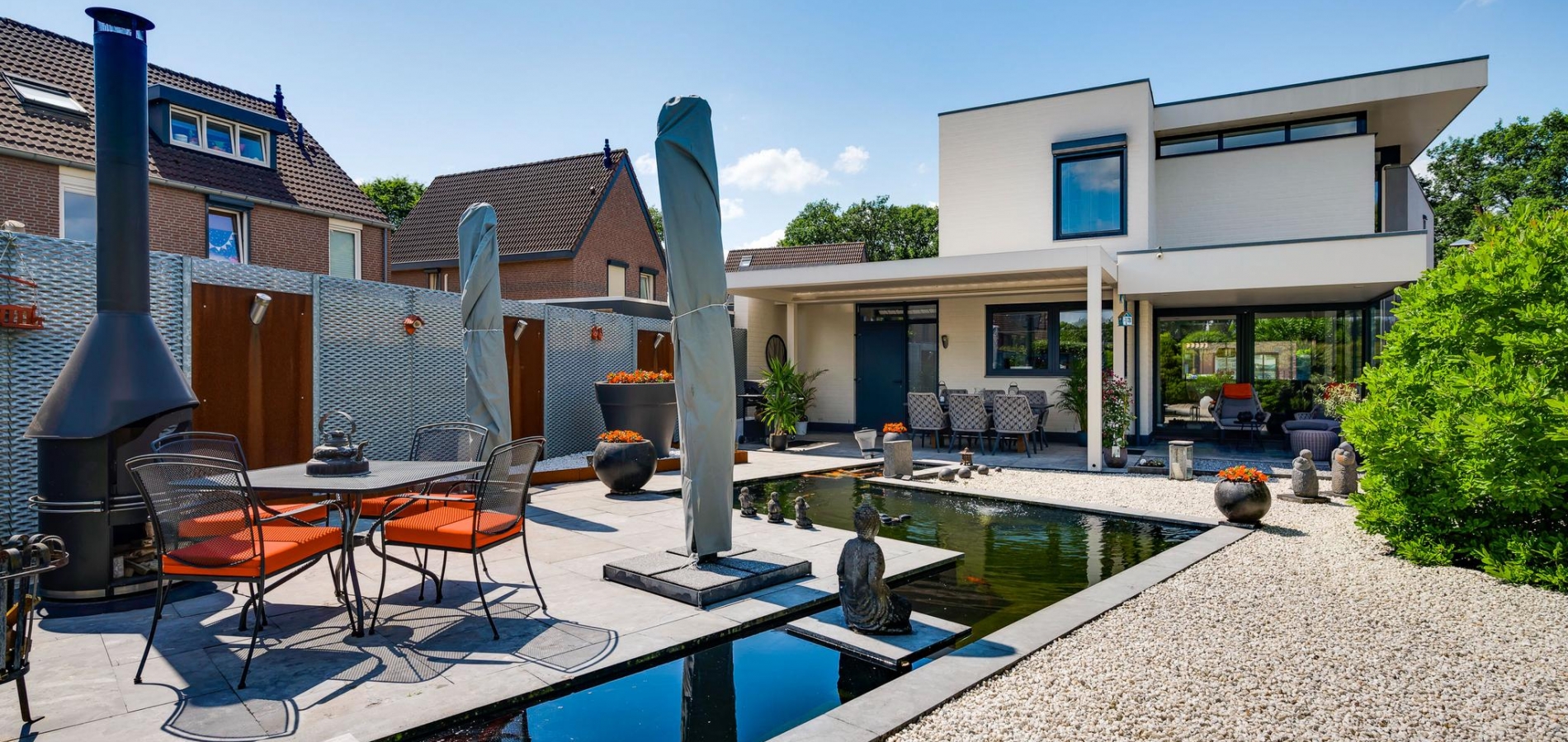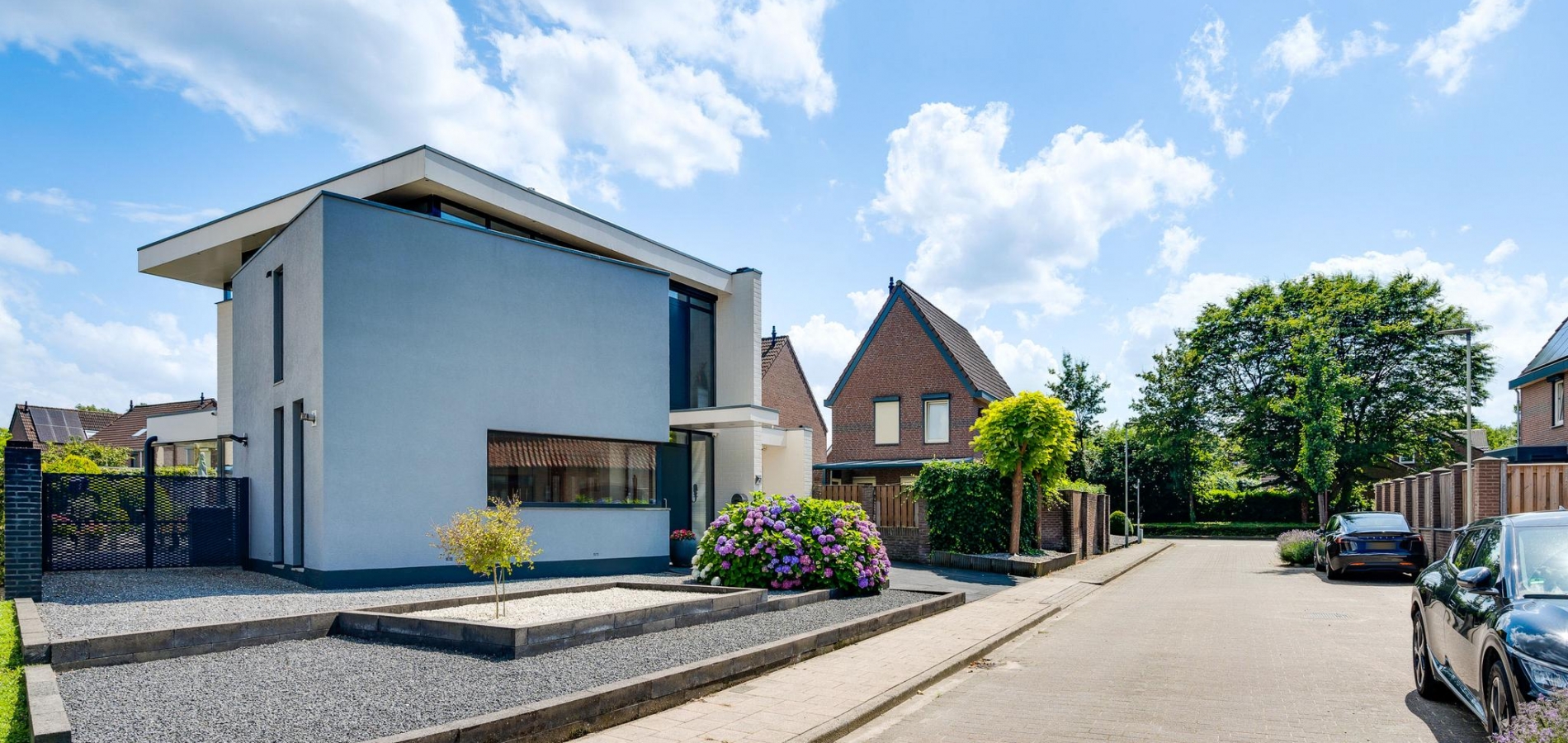 De diepe, onderhoudsvriendelijke achtertuin is gesitueerd op het oosten. Grind in verschillende kleuren is gecombineerd met een prachtige, moderne vijver en meerdere terrassen. Het terras met elektrisch bedienbaar lamellendak is de perfecte plek om de tuin te bewonderen en het terras naast de vijver is voor de zonliefhebber. Links van de villa is een eigen, brede achterom met dubbele poort. De voortuin en de oprit voor twee auto’s maken de villa meer dan af.