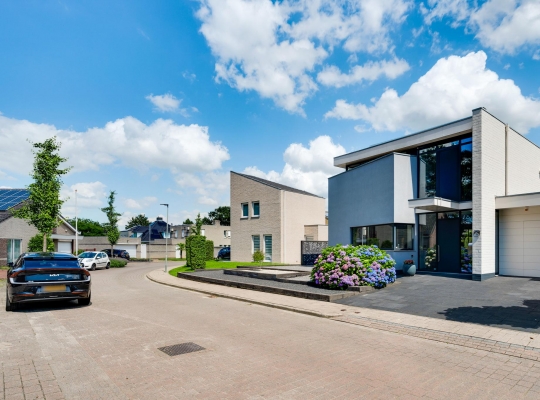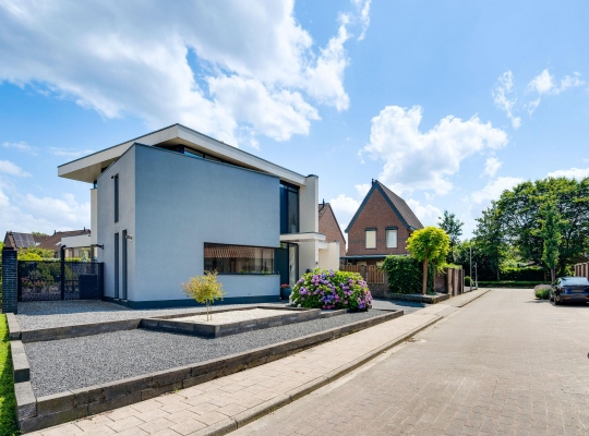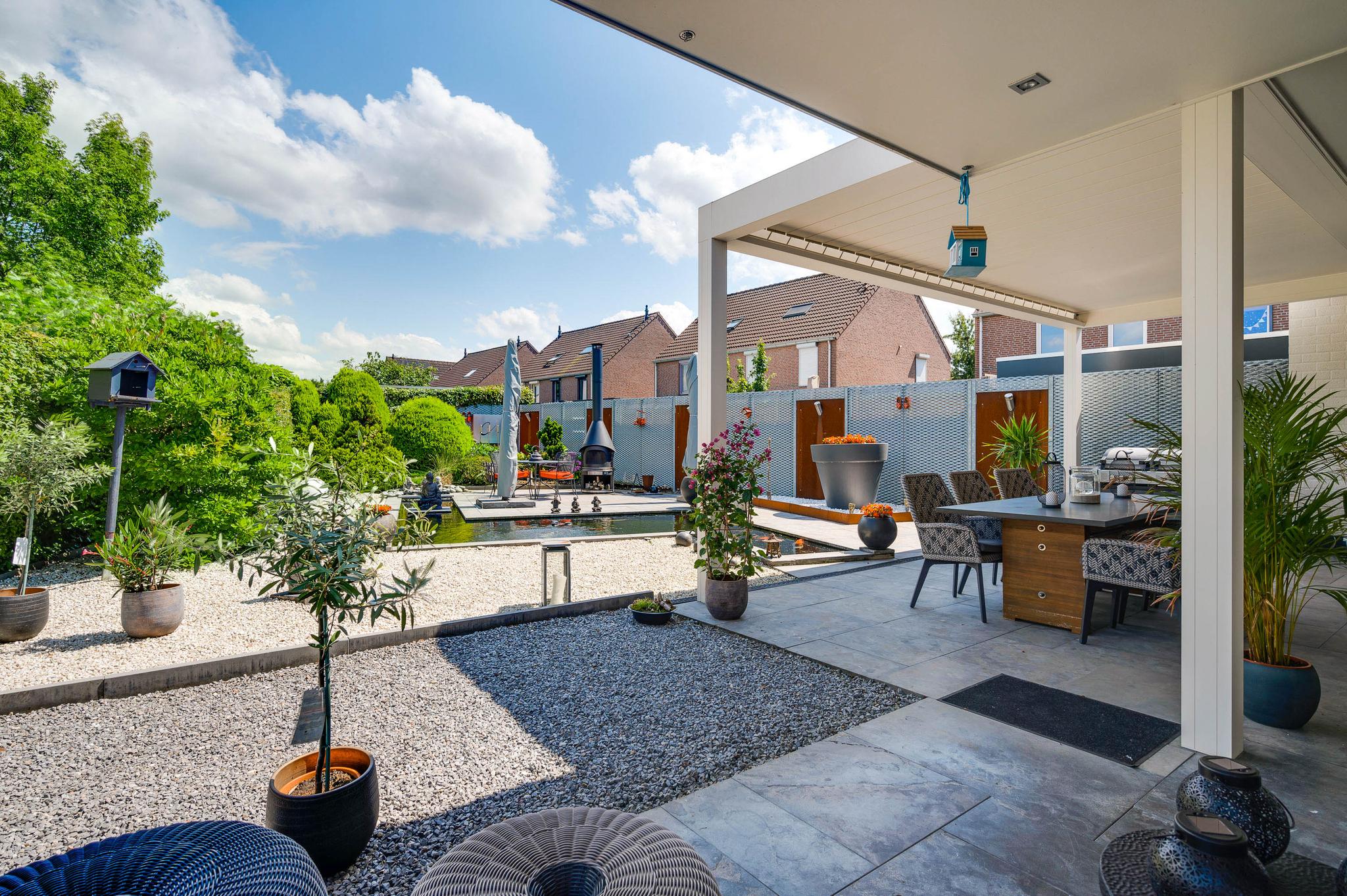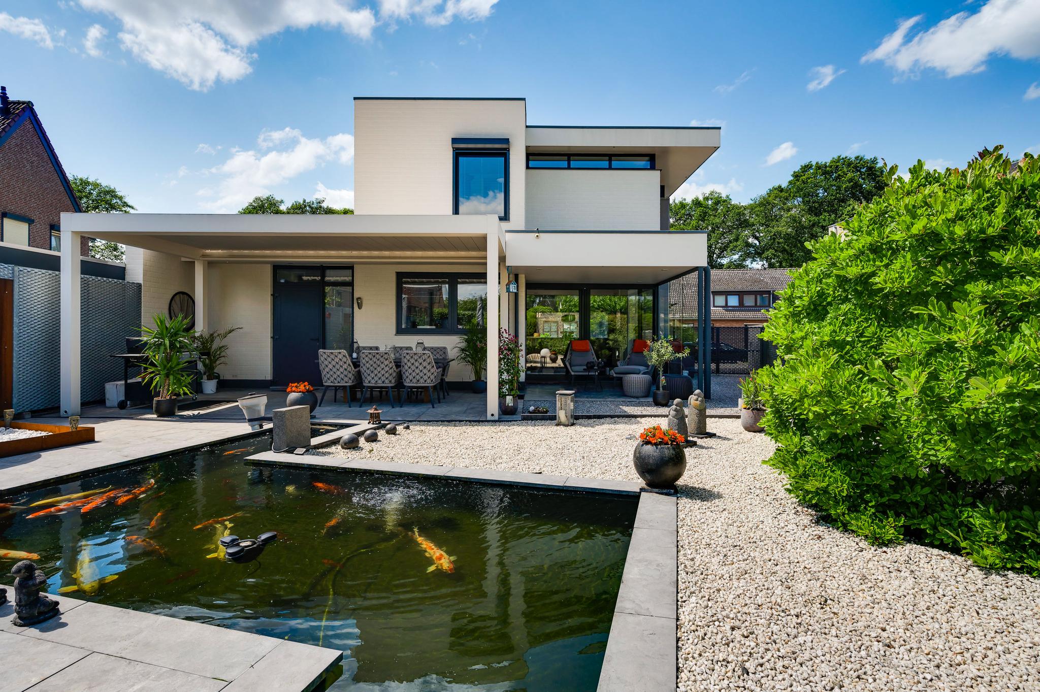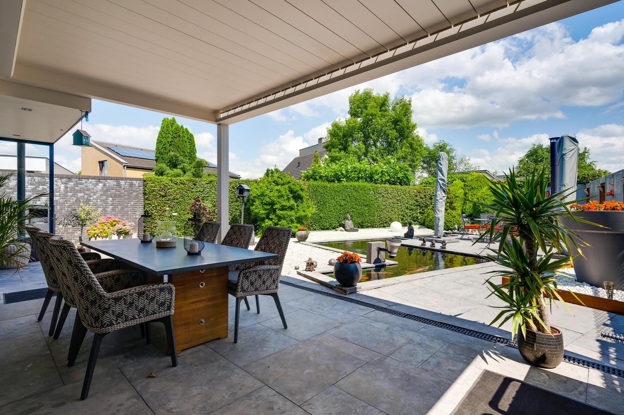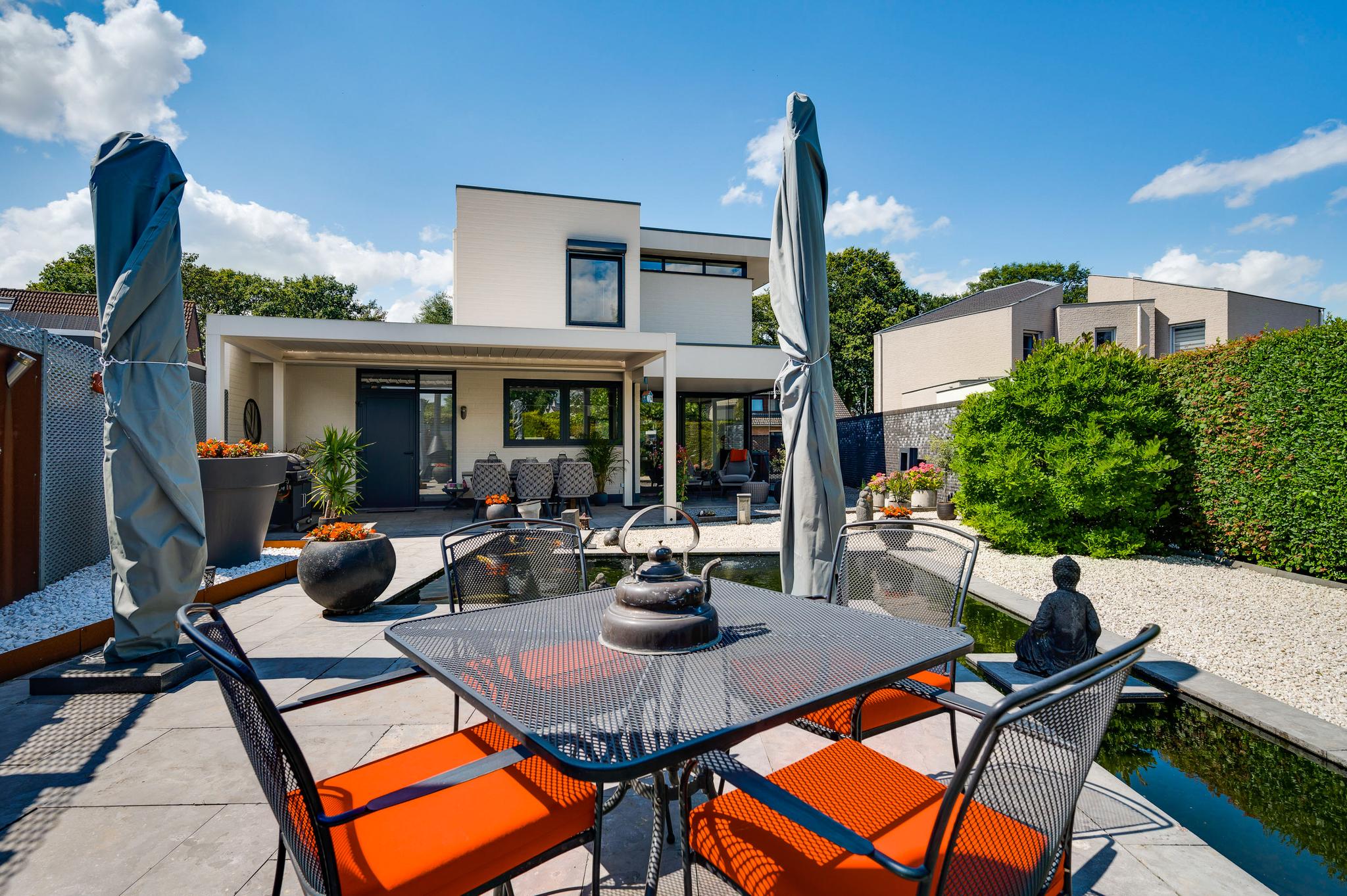 De diepe, onderhoudsvriendelijke achtertuin is gesitueerd op het oosten. Grind in verschillende kleuren is gecombineerd met een prachtige, moderne vijver en meerdere terrassen. Het terras met elektrisch bedienbaar lamellendak is de perfecte plek om de tuin te bewonderen en het terras naast de vijver is voor de zonliefhebber. Links van de villa is een eigen, brede achterom met dubbele poort. De voortuin en de oprit voor twee auto’s maken de villa meer dan af.