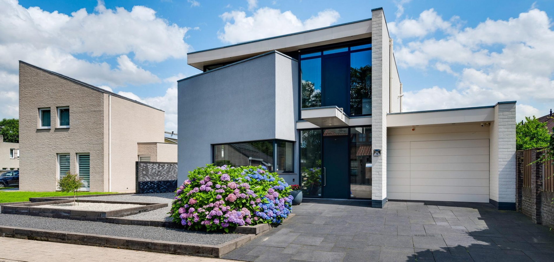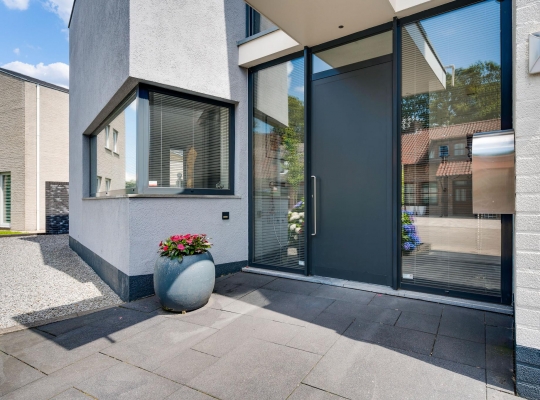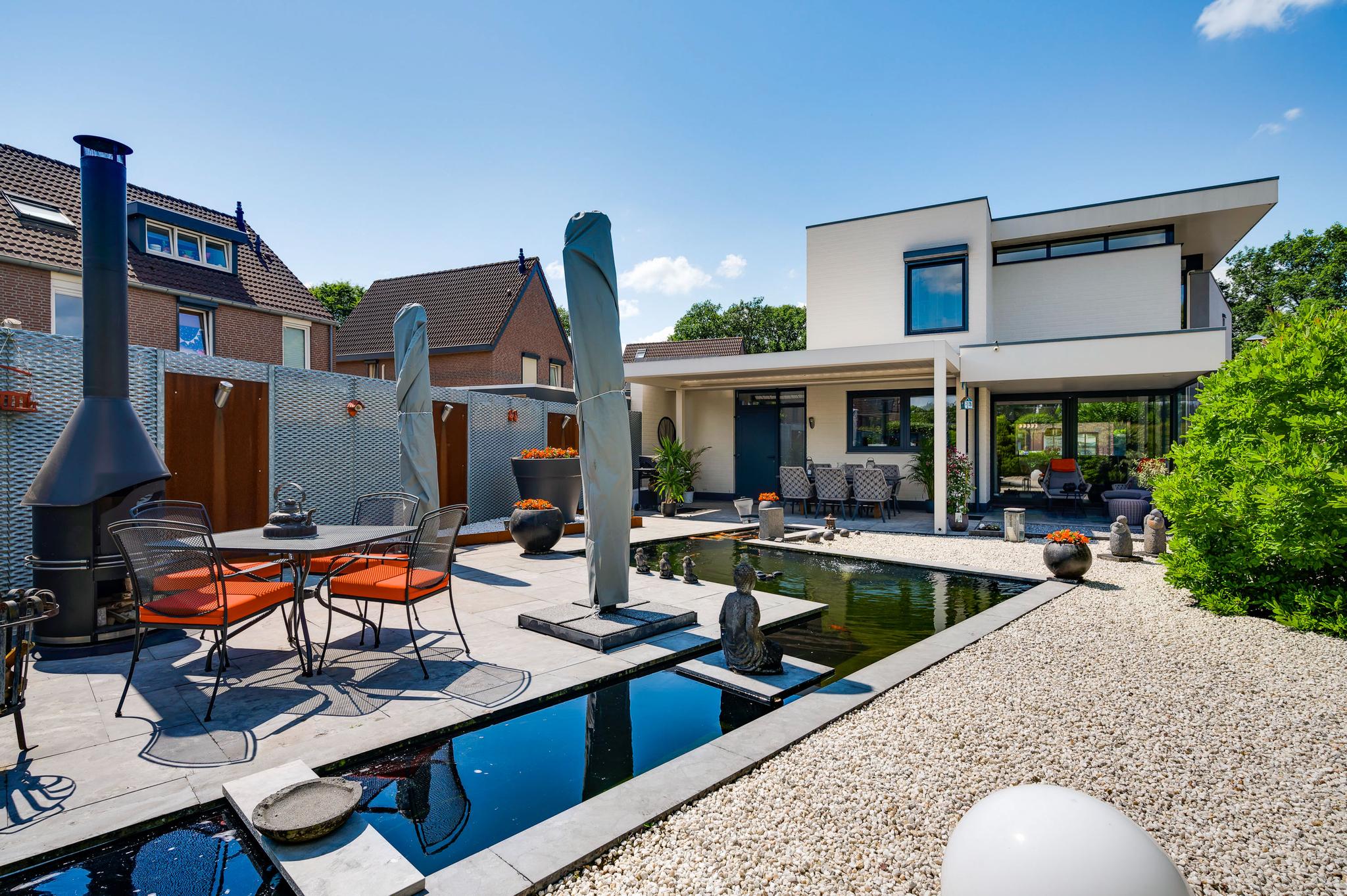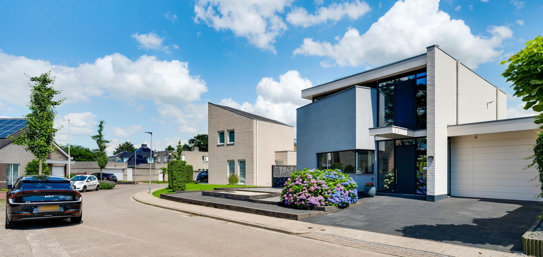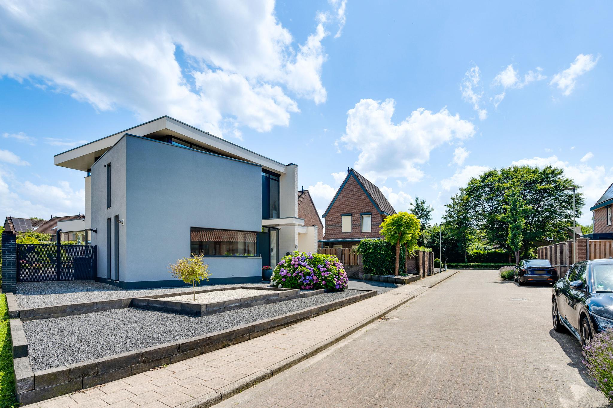 De diepe, onderhoudsvriendelijke achtertuin is gesitueerd op het oosten. Grind in verschillende kleuren is gecombineerd met een prachtige, moderne vijver en meerdere terrassen. Het terras met elektrisch bedienbaar lamellendak is de perfecte plek om de tuin te bewonderen en het terras naast de vijver is voor de zonliefhebber. Links van de villa is een eigen, brede achterom met dubbele poort. De voortuin en de oprit voor twee auto’s maken de villa meer dan af.