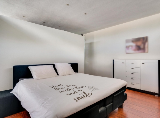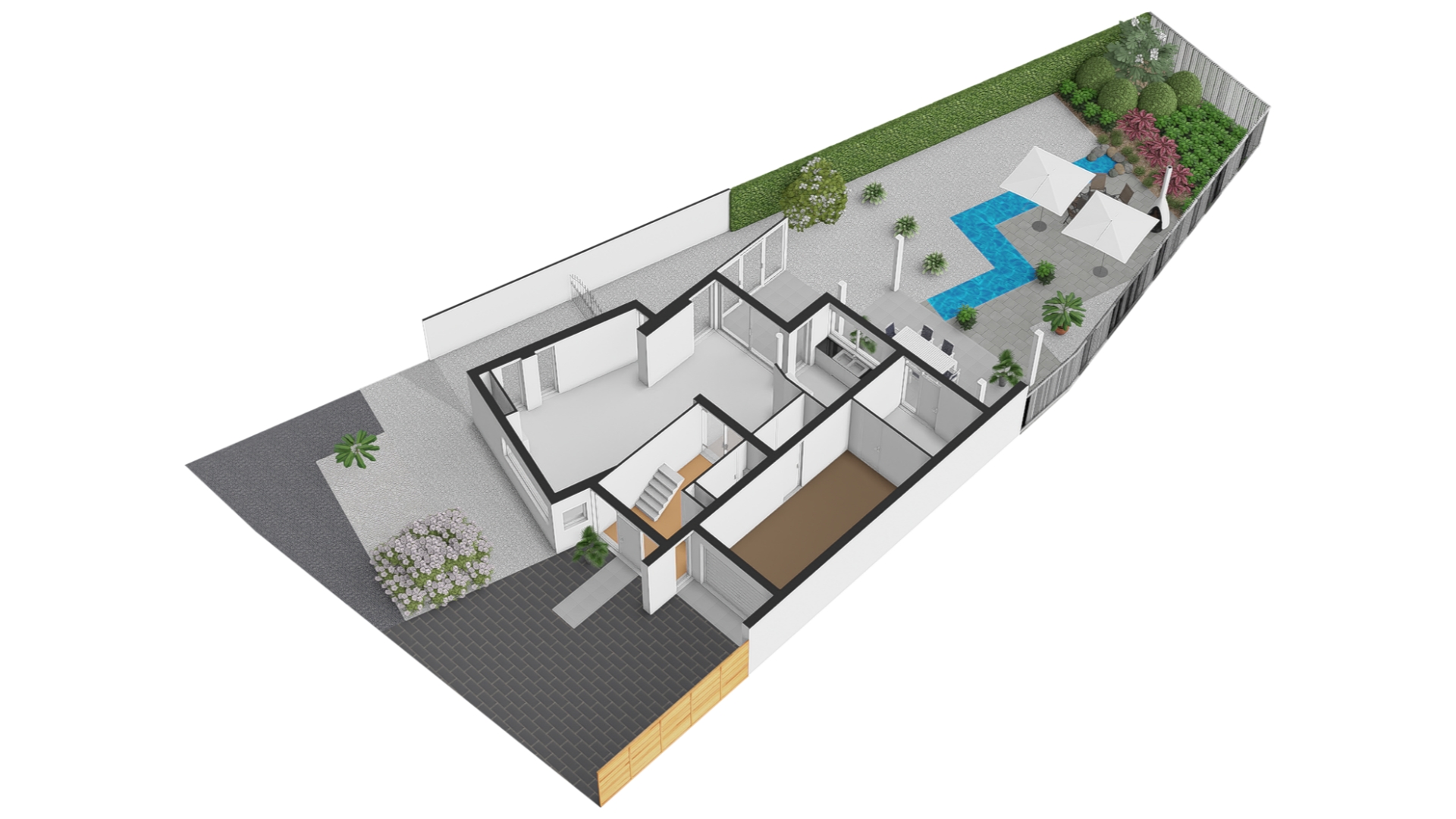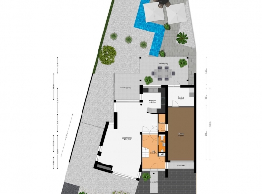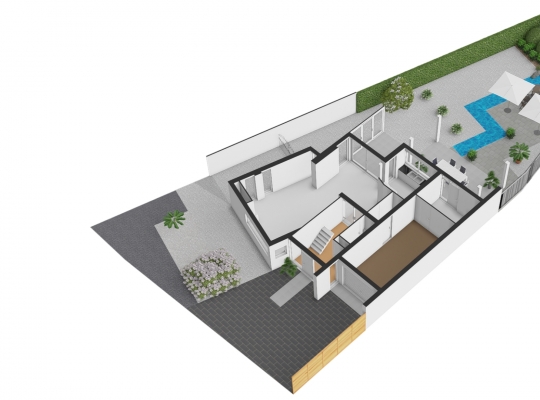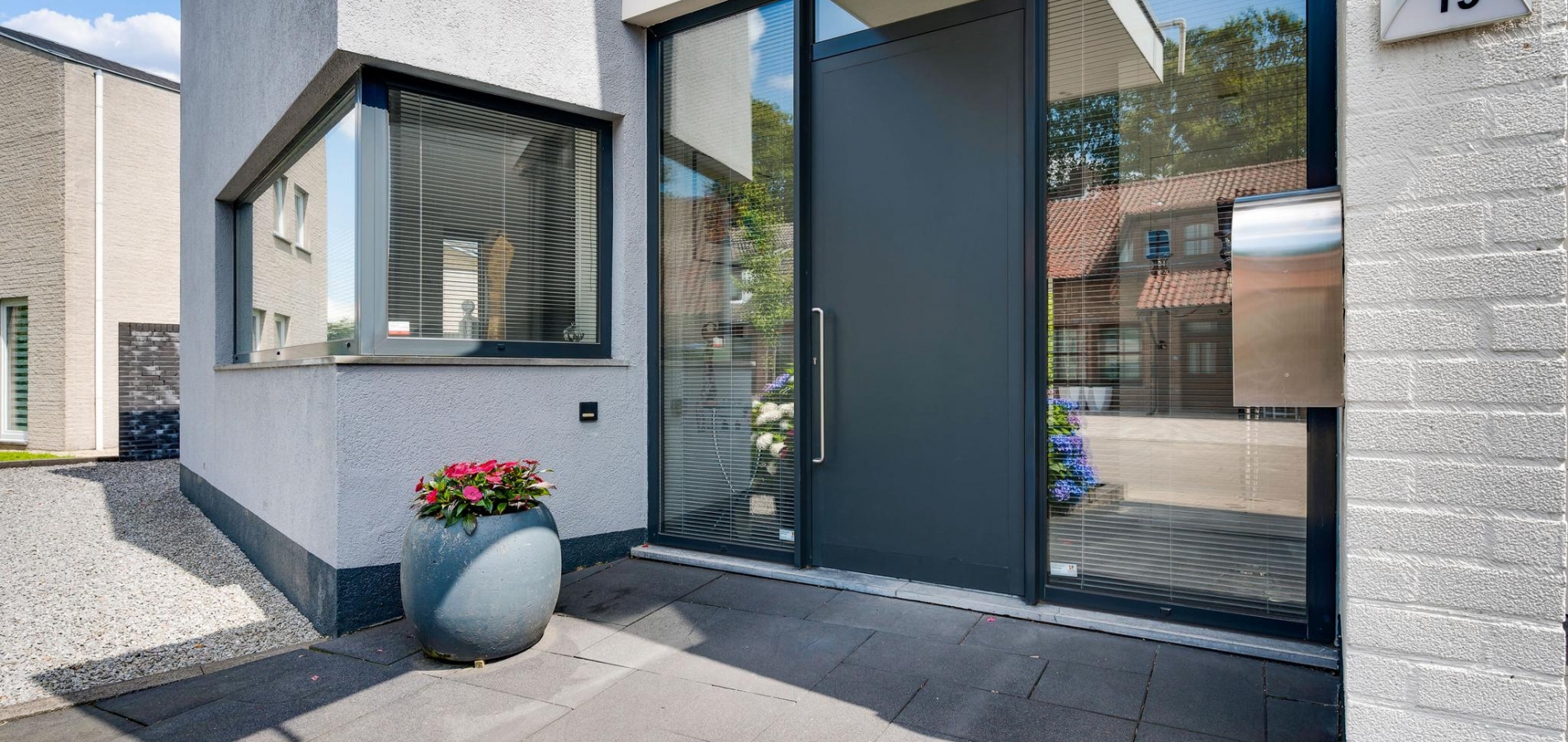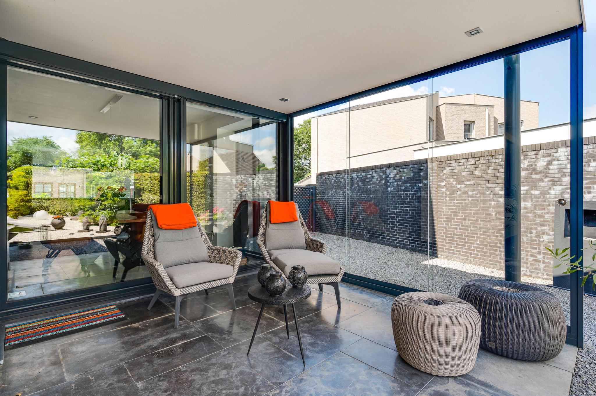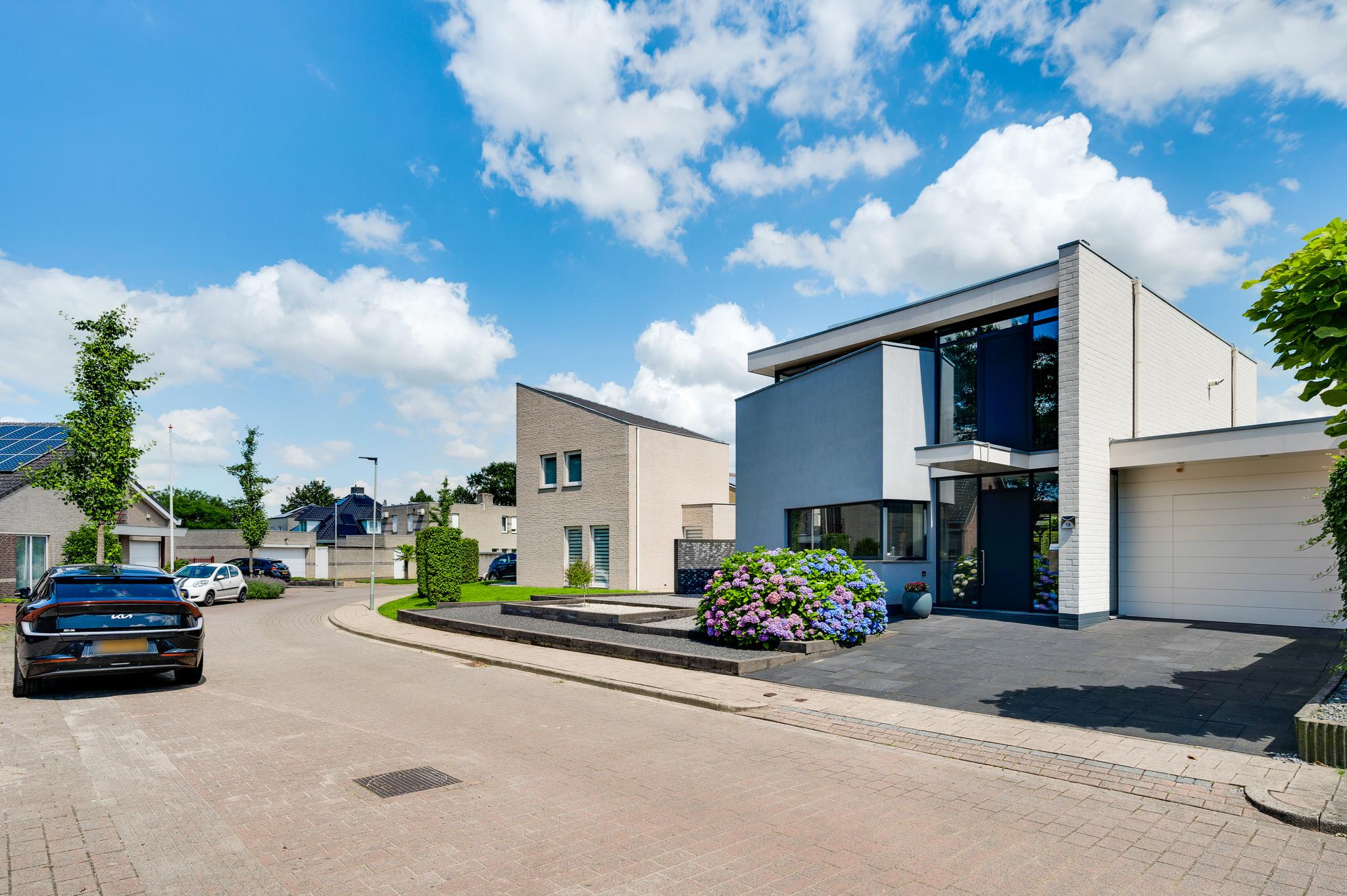 De diepe, onderhoudsvriendelijke achtertuin is gesitueerd op het oosten. Grind in verschillende kleuren is gecombineerd met een prachtige, moderne vijver en meerdere terrassen. Het terras met elektrisch bedienbaar lamellendak is de perfecte plek om de tuin te bewonderen en het terras naast de vijver is voor de zonliefhebber. Links van de villa is een eigen, brede achterom met dubbele poort. De voortuin en de oprit voor twee auto’s maken de villa meer dan af.