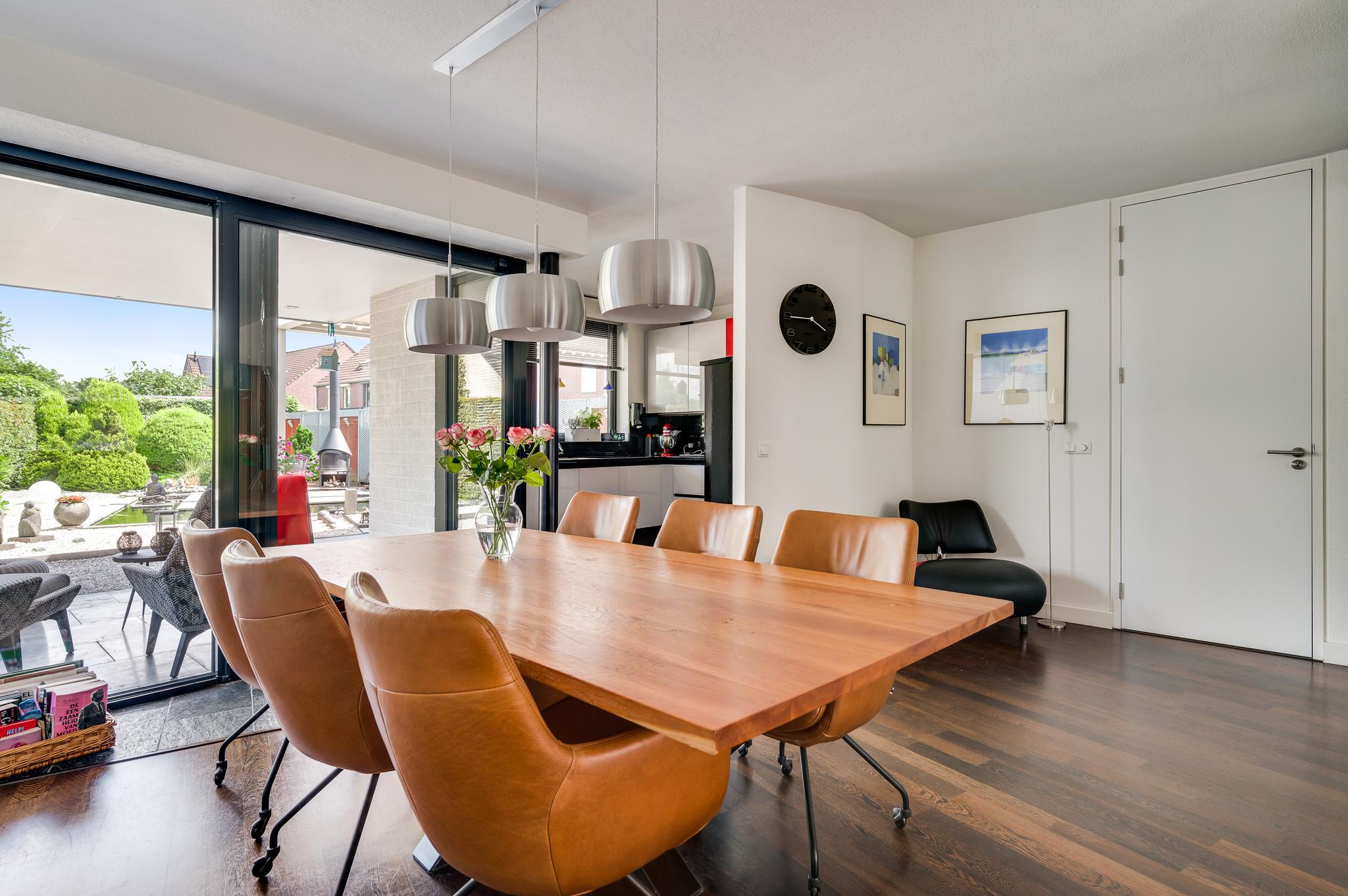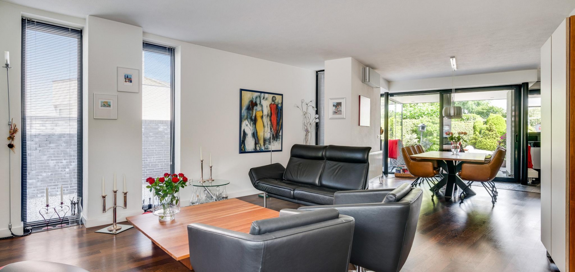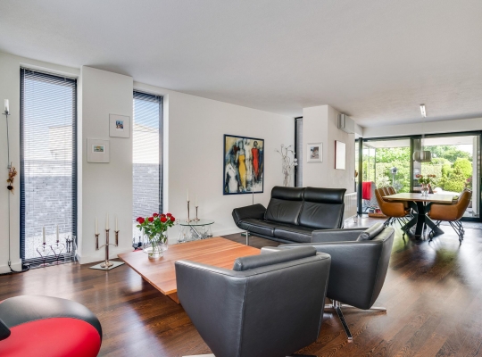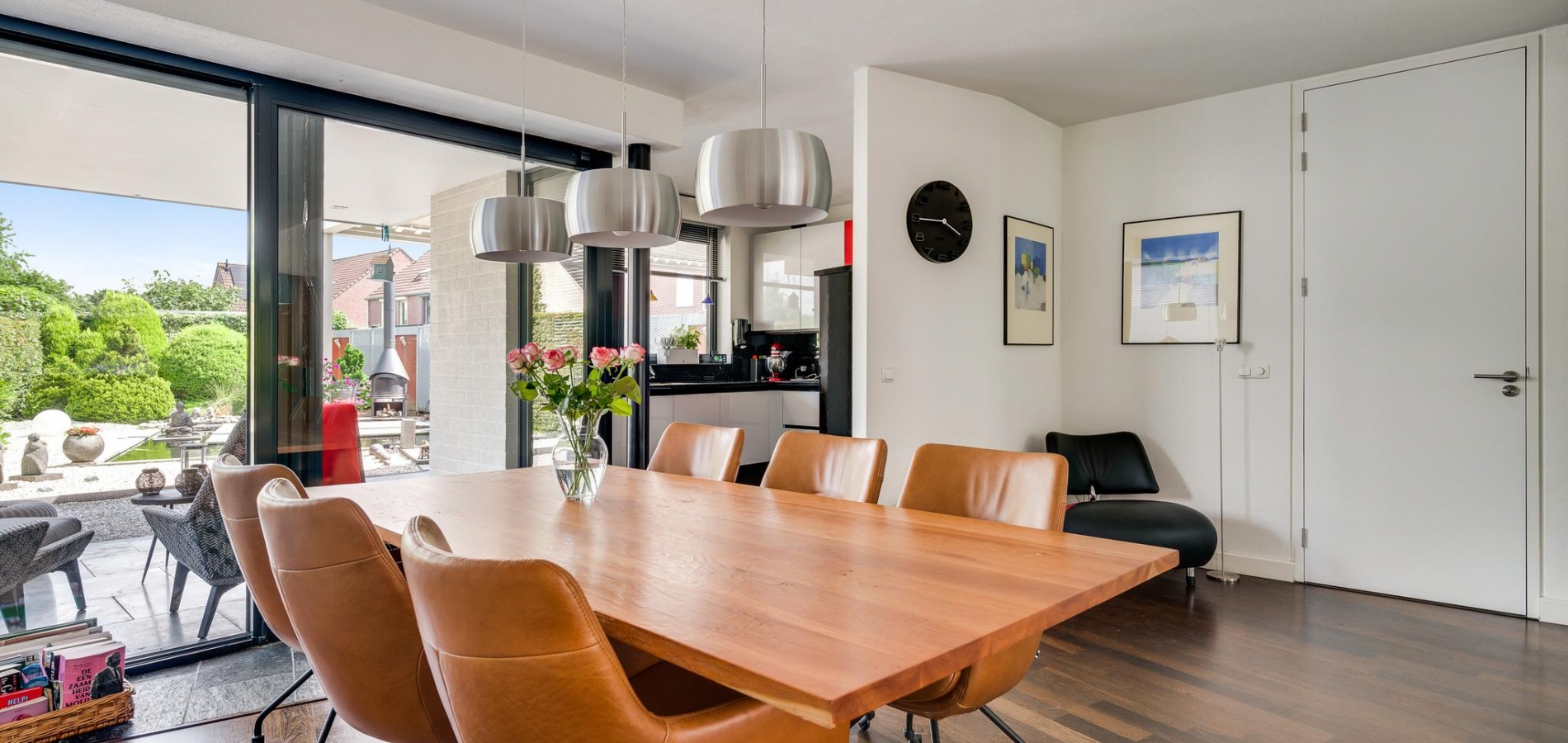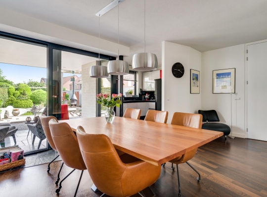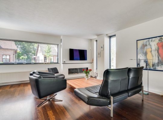 Grote ramen aan drie zijden, de schuifpui naar het overdekte terras en een wengé parketvloer maken de woonkamer tot een zeer lichte en sfeervolle leefruimte. Aan de voorzijde, bij de prachtige gashaard, is het zitgedeelte en het eetgedeelte bevindt zich aan de achterzijde, vlak naast de keuken.