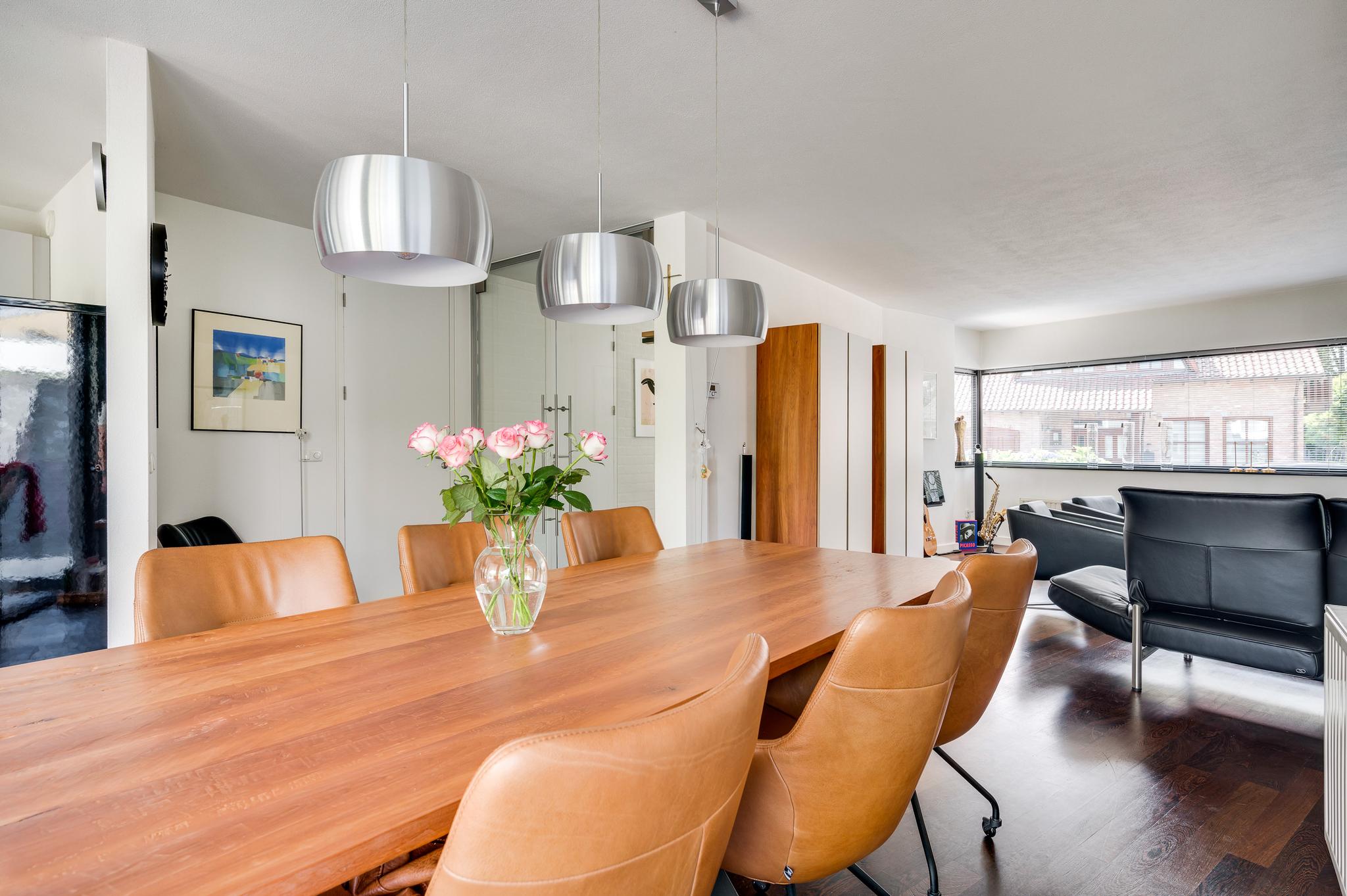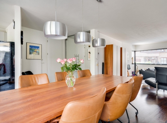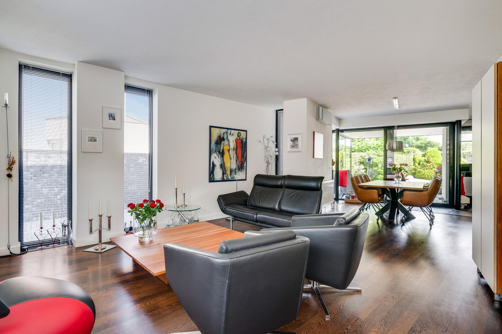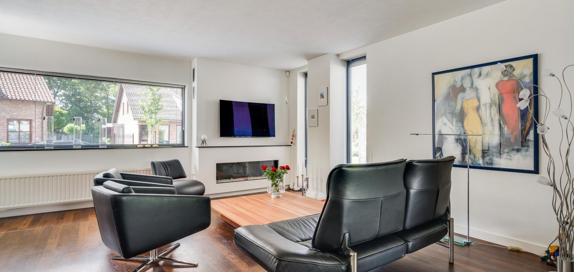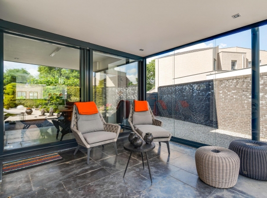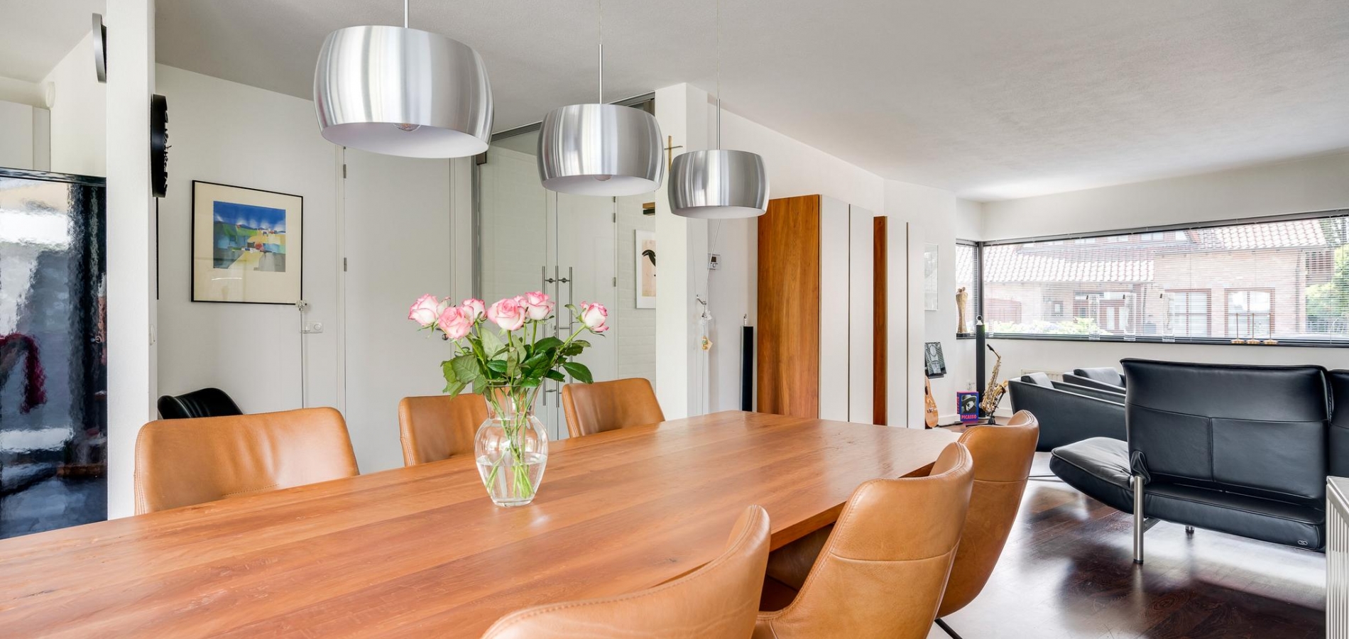 Grote ramen aan drie zijden, de schuifpui naar het overdekte terras en een wengé parketvloer maken de woonkamer tot een zeer lichte en sfeervolle leefruimte. Aan de voorzijde, bij de prachtige gashaard, is het zitgedeelte en het eetgedeelte bevindt zich aan de achterzijde, vlak naast de keuken.