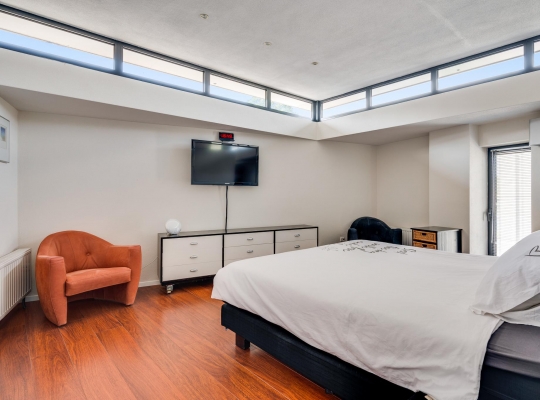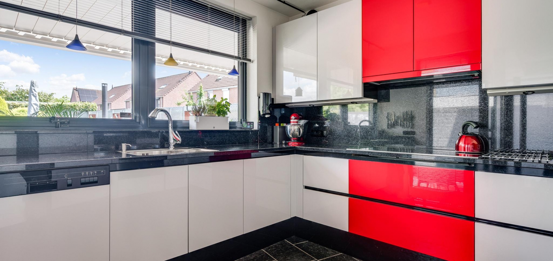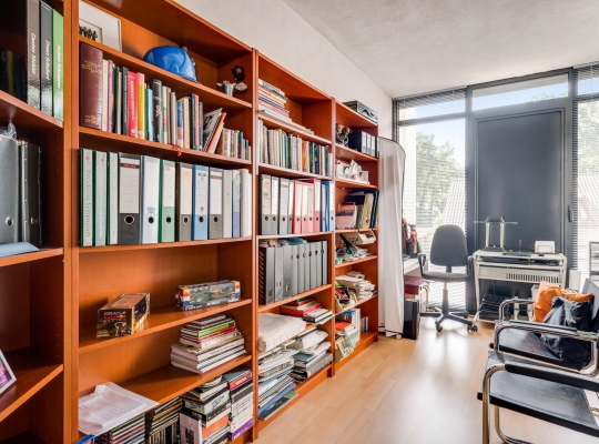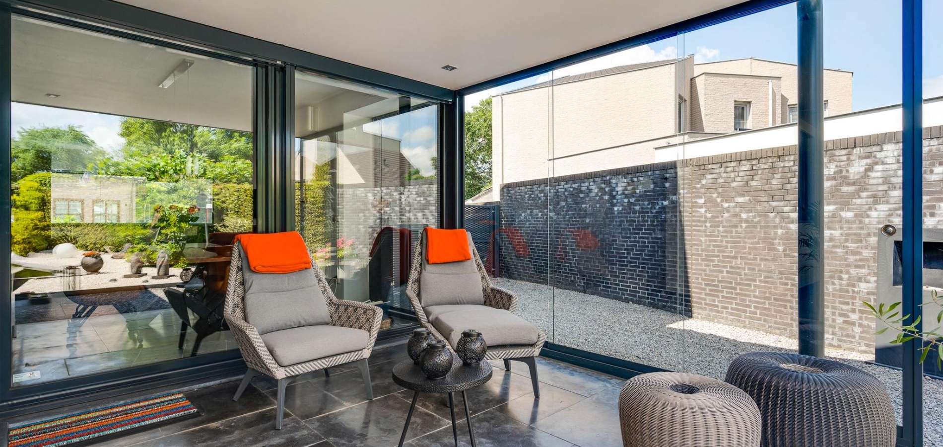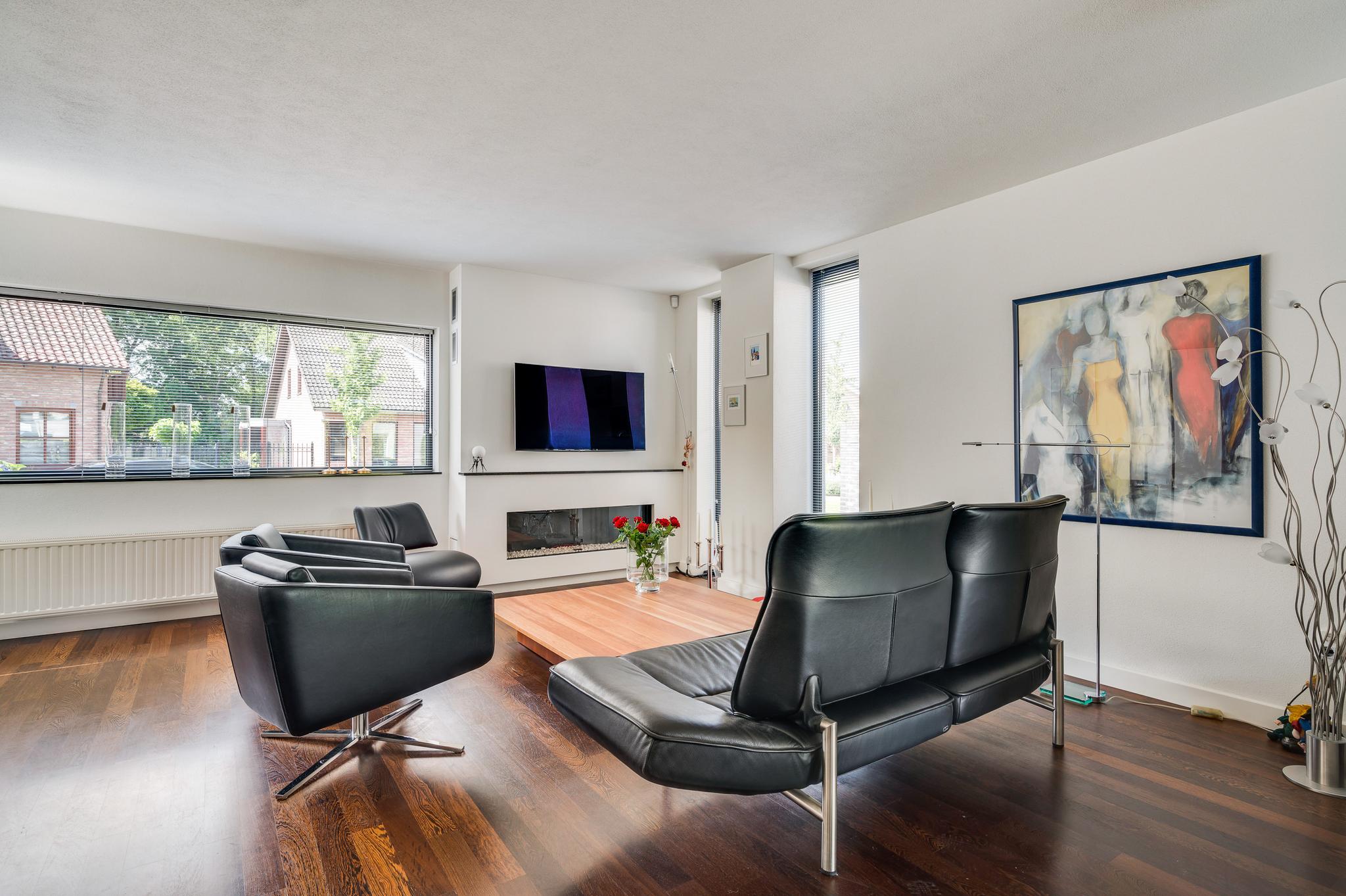 Grote ramen aan drie zijden, de schuifpui naar het overdekte terras en een wengé parketvloer maken de woonkamer tot een zeer lichte en sfeervolle leefruimte. Aan de voorzijde, bij de prachtige gashaard, is het zitgedeelte en het eetgedeelte bevindt zich aan de achterzijde, vlak naast de keuken.