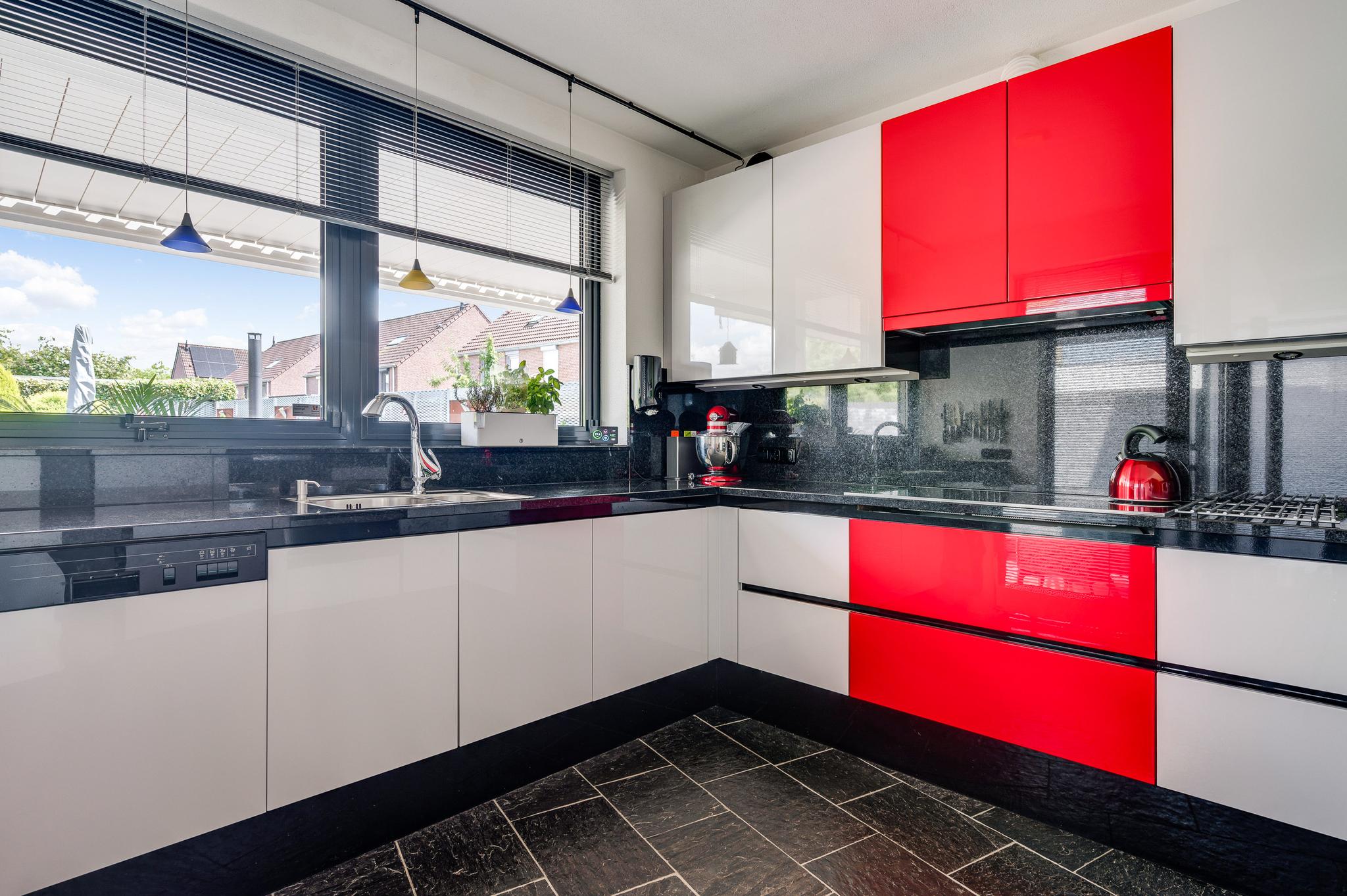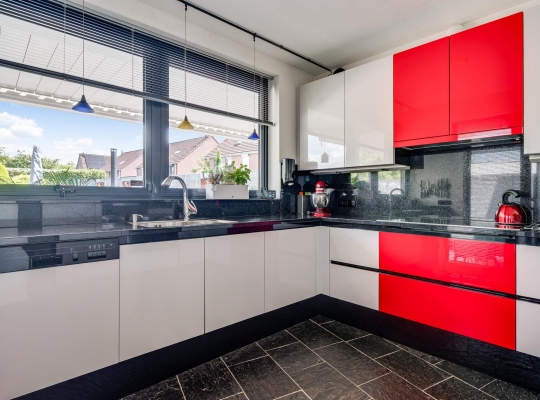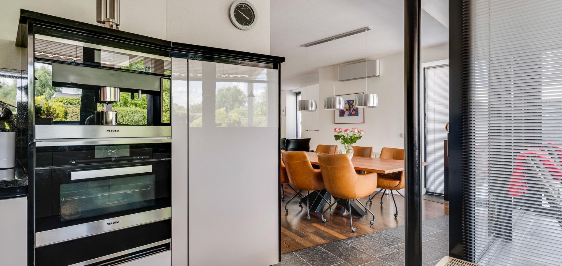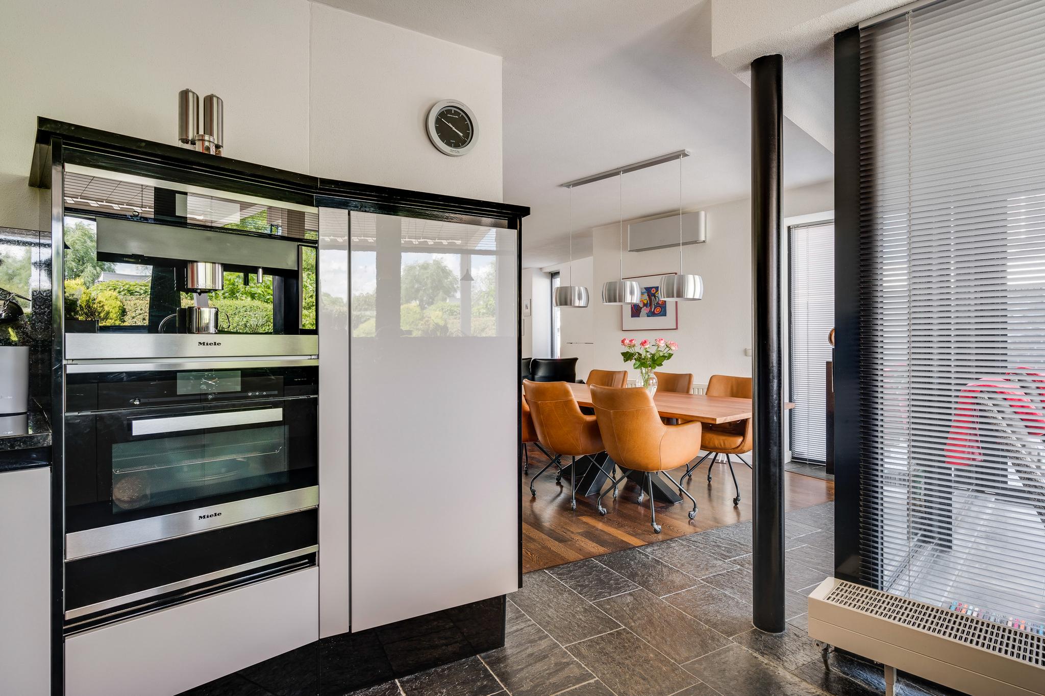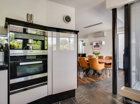 Vanuit de halfopen keuken met leisteen vloer heeft u fraai uitzicht naar de tuin. De hoogwaardige Siematic hoekopstelling biedt veel bergruimte en het aanrechtblad is, net als de achterwand, van graniet. Alle benodigde apparatuur (Miele) is ingebouwd: een inductie kookplaat, afzuigkap, vaatwasser, hetelucht stoomoven, koffiemachine, slowcooker/bordenwarmer en een koelkast.