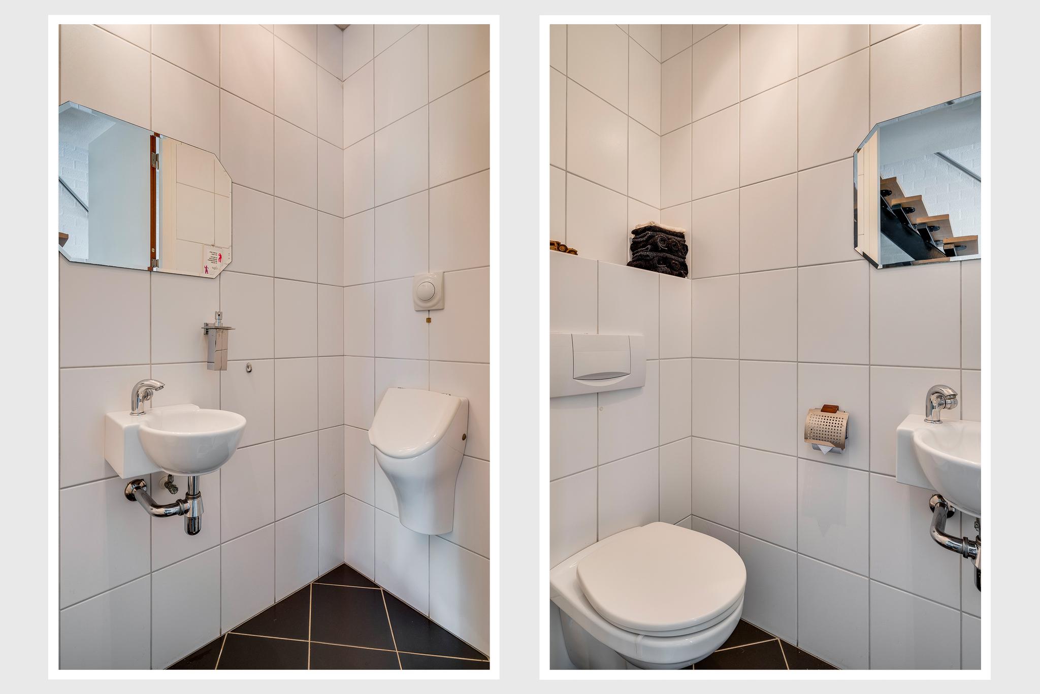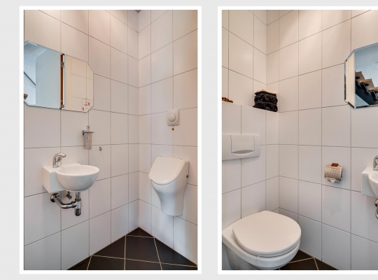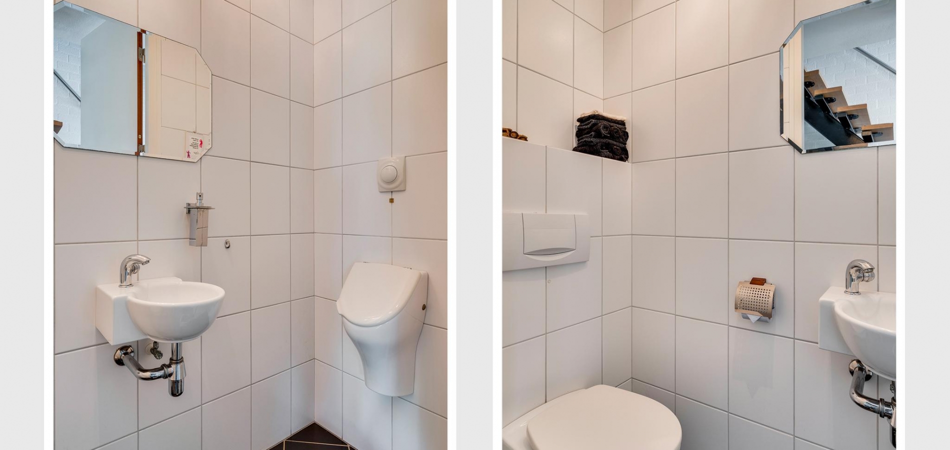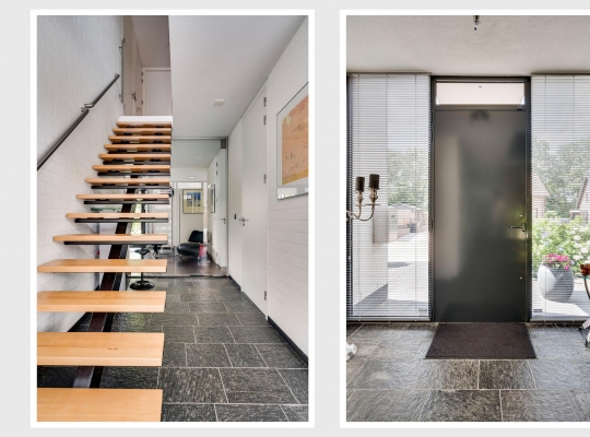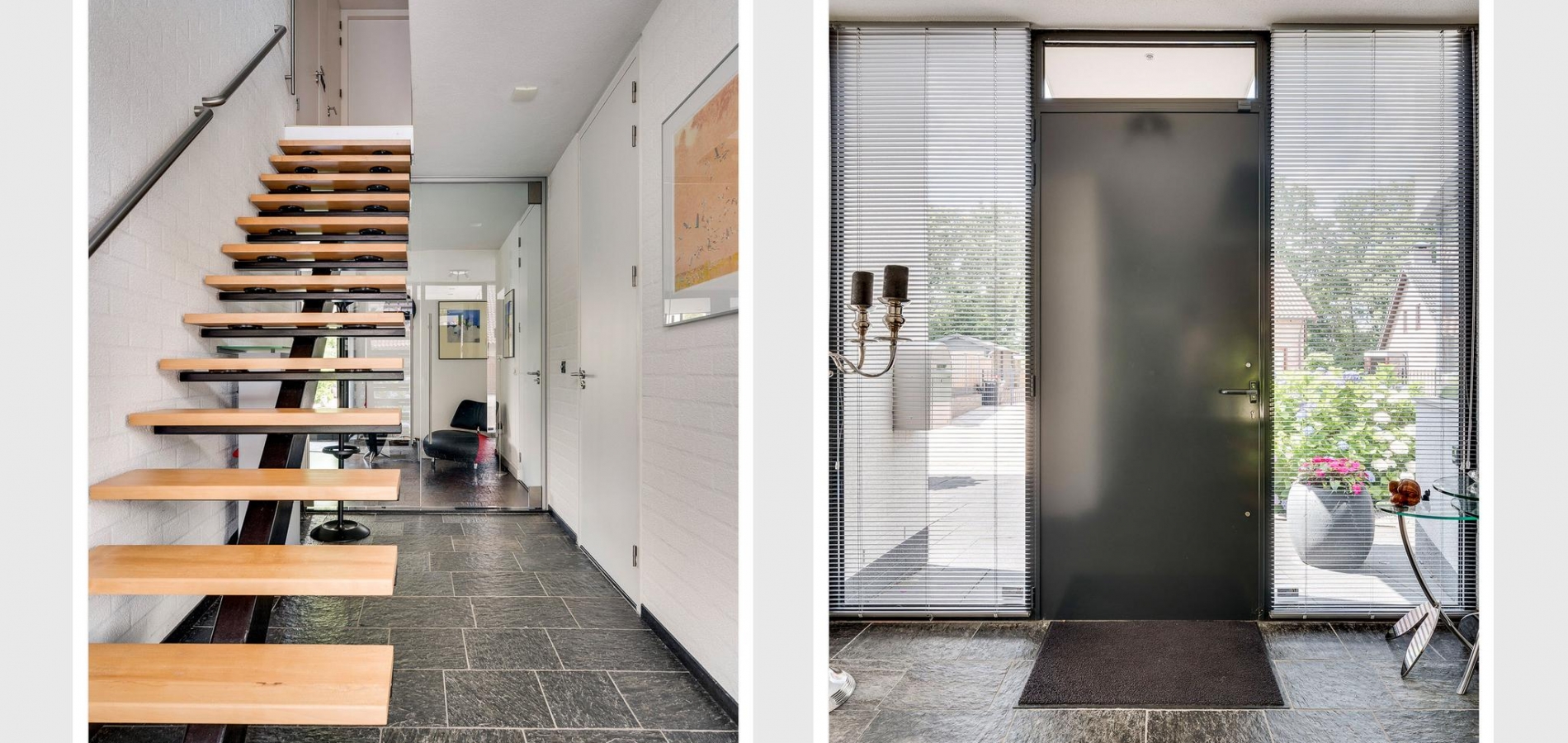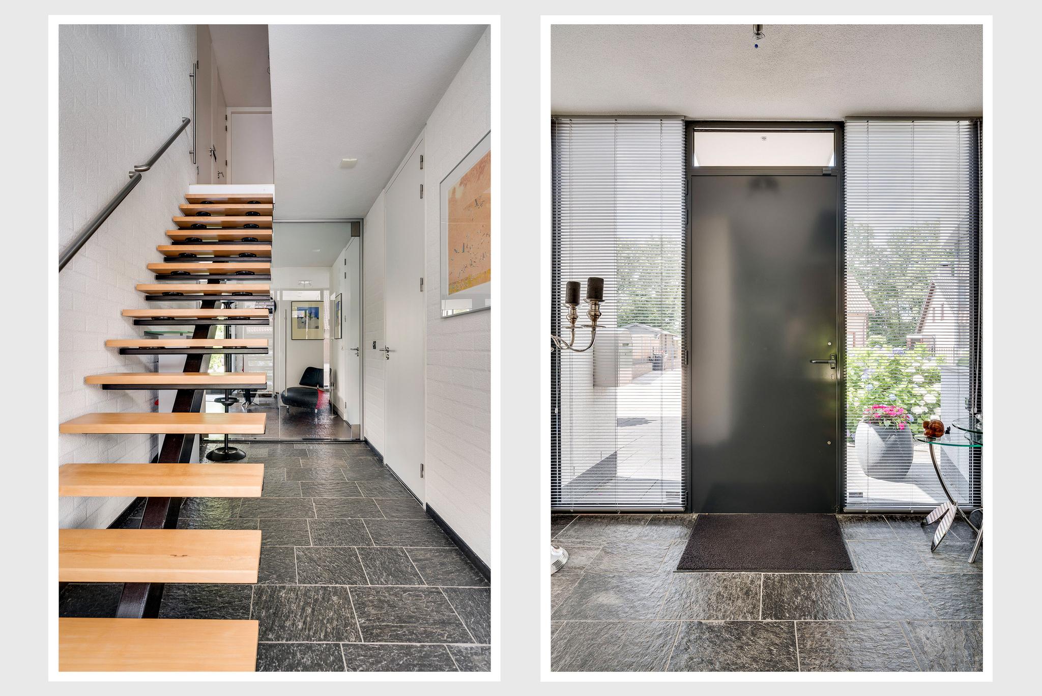 De moderne architectuur met strakke lijnen en grote ramen maakt u nieuwsgierig. Loop vanaf de oprit naar de overdekte entree, die toegang geeft tot de fraaie ontvangsthal met een leisteen vloer. De trap is fraai. Net als de grote glazen deuren naar de woonkamer. Rechts in de hal is de zeer royale toiletruimte met een wandcloset, fonteintje en een urinoir.