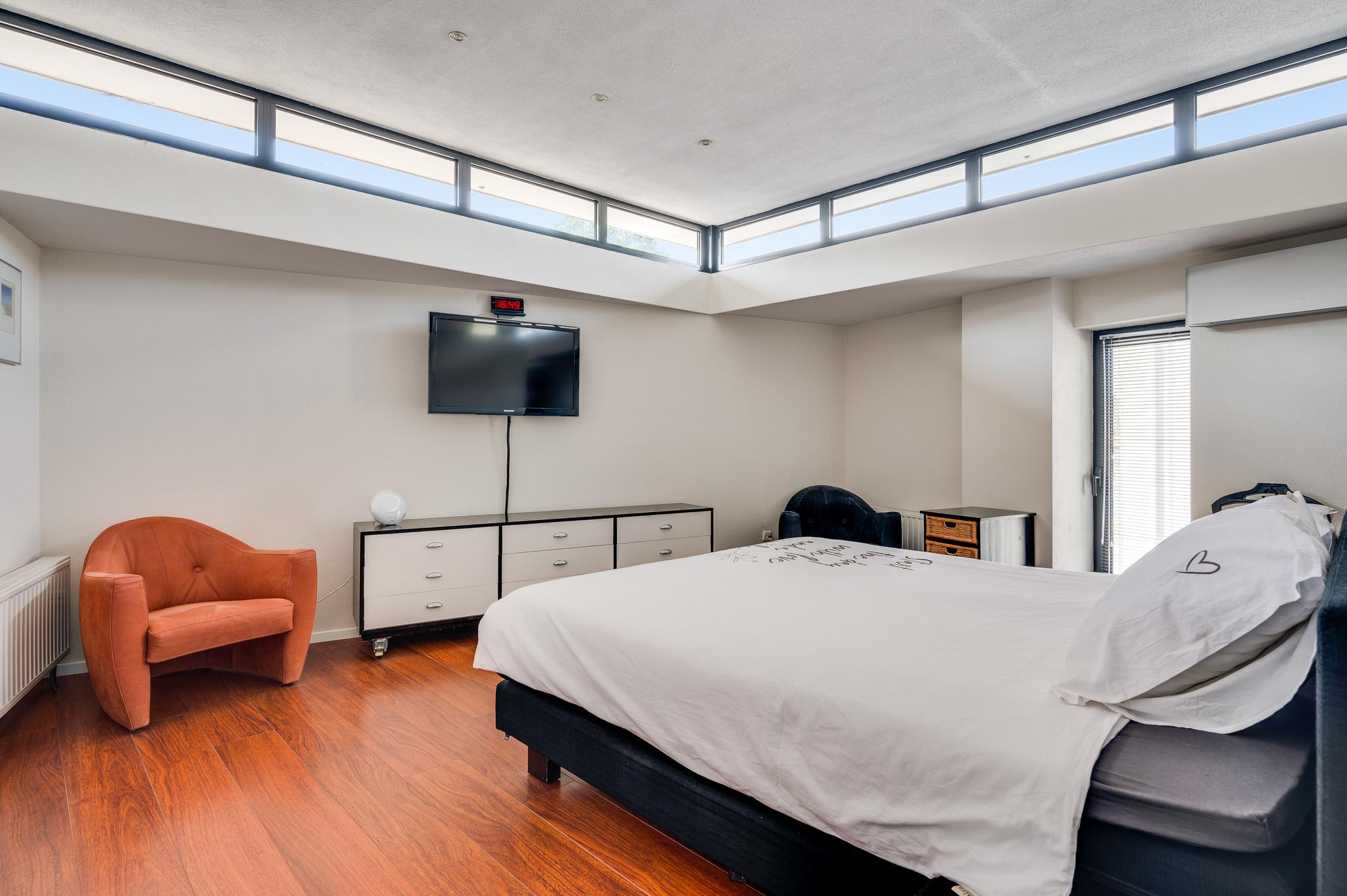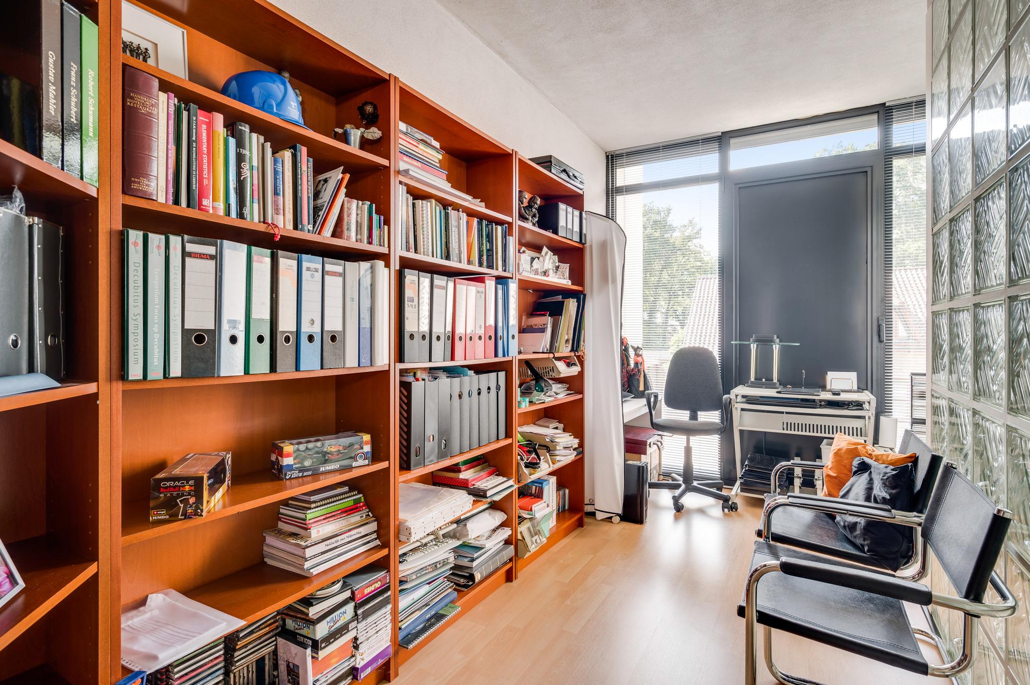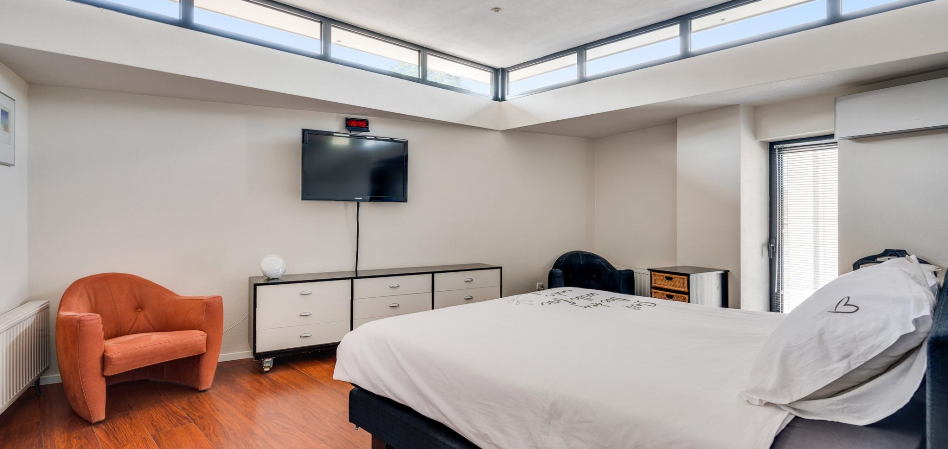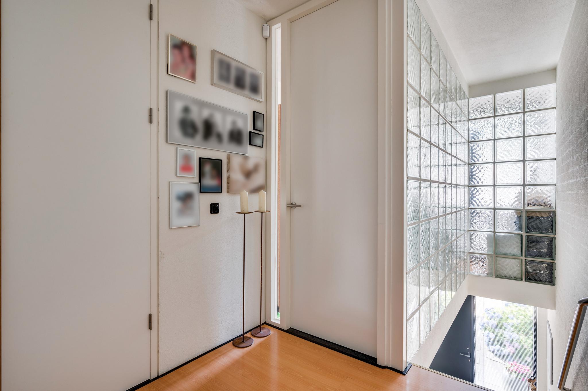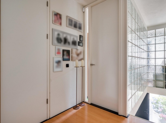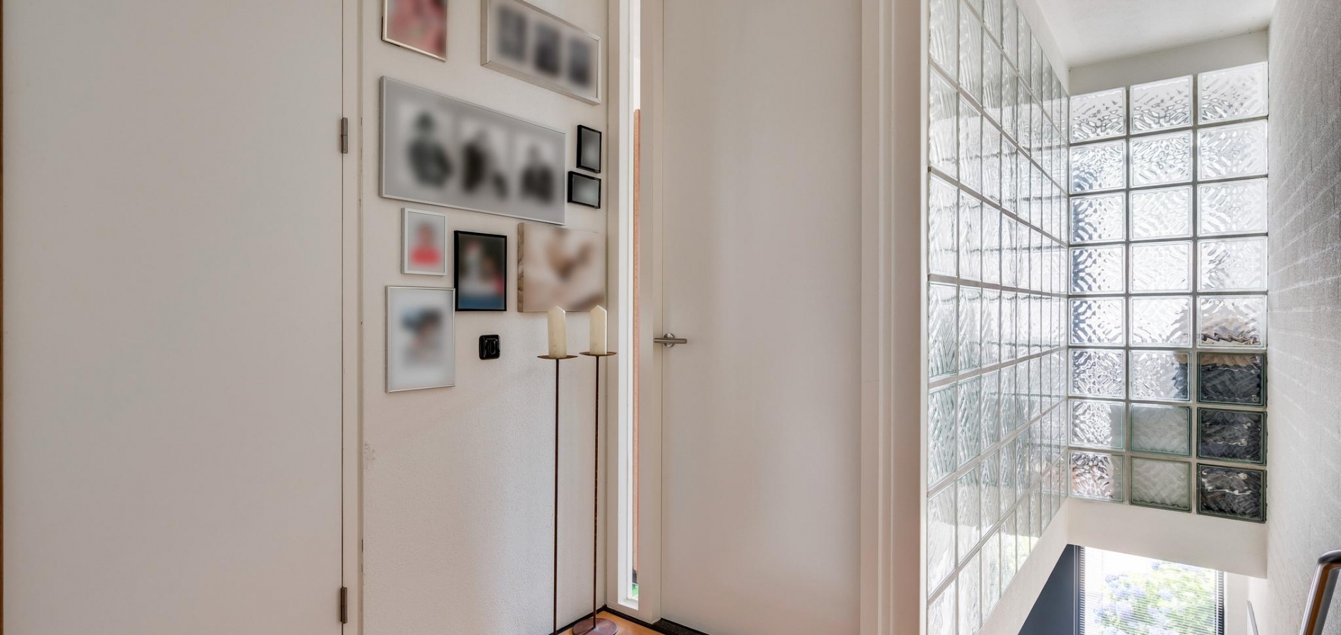 Volg de trap vanuit de hal naar de overloop, die dankzij de muren van glazen bouwstenen heel licht is. Aan de voorzijde is slaapkamer I met inloopkast met fraaie raampartijen en een hoog plafond. Naast deze slaapkamer is een studeer-/werkkamer (ca. 9,8 m2), die ook als slaapkamer II kan worden gebruikt. Aan de achterzijde is slaapkamer III (ca. 9,6 m2) met prachtig uitzicht naar de tuin.