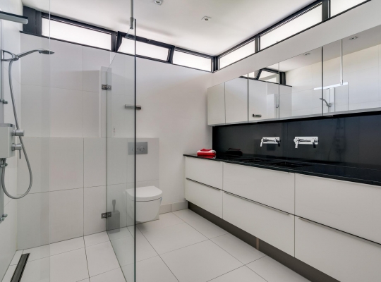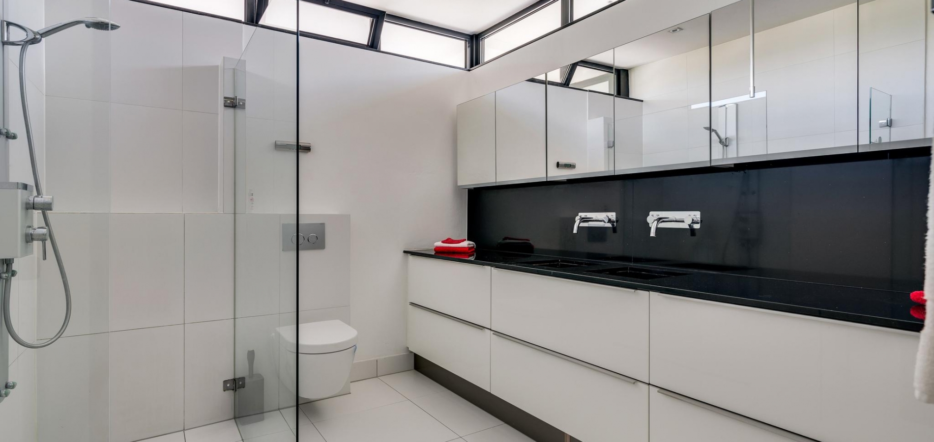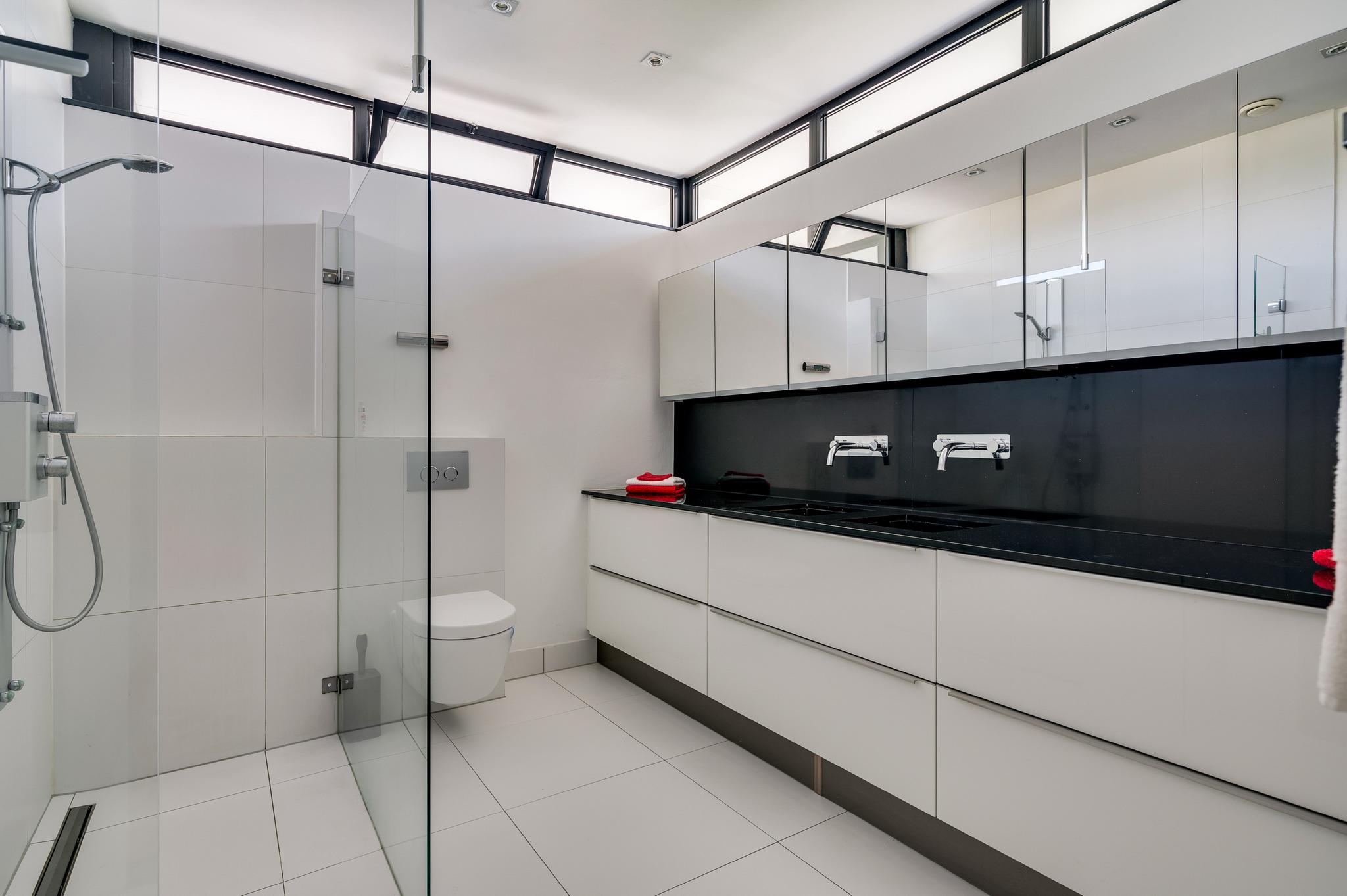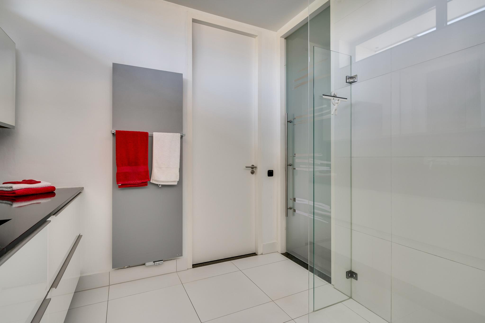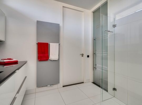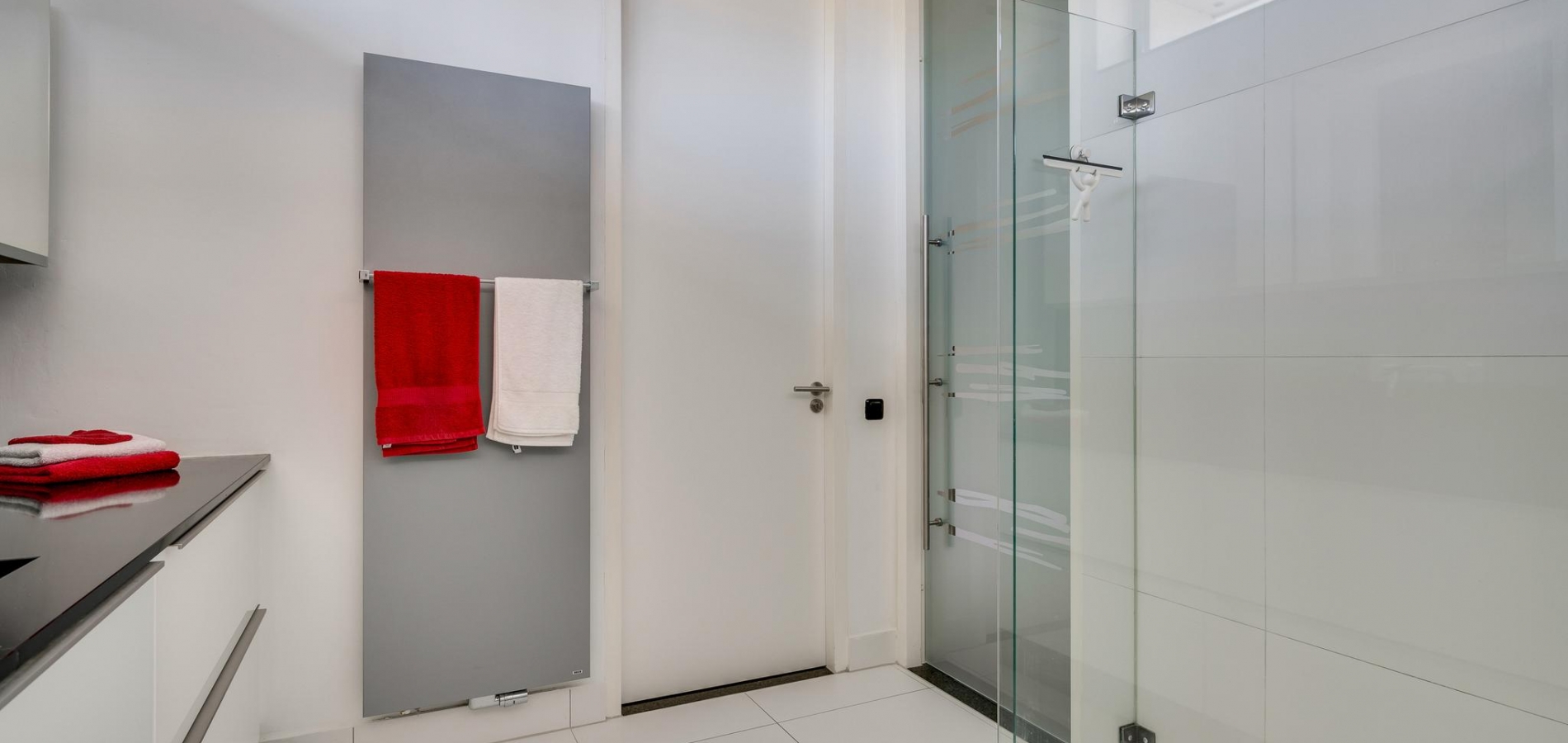 Vanuit slaapkamer I en de overloop is de badkamer (ca. 8,2 m2) te bereiken. Deze ruimte is fraai ingedeeld met een op maat gemaakt dubbel wastafelmeubel, een grote inloopdouche, wandcloset en een designradiator. De lades en spiegelkasten bieden volop bergruimte en het hoge plafond versterkt het gevoel van ruimte.