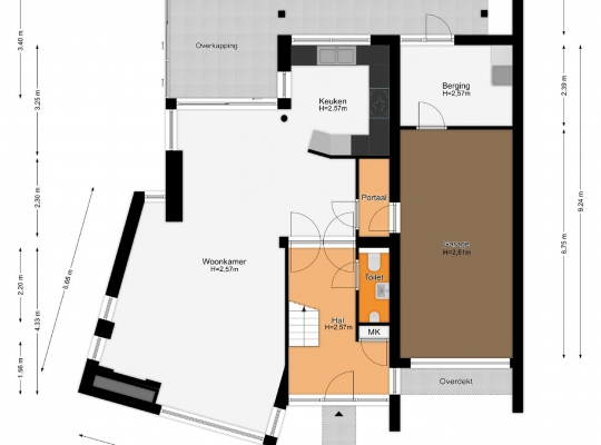 Rechts in de woonkamer is een portaal dat toegang geeft tot de in spouw gebouwde garage (ca. 6,75 x 3,31) met een elektrische kantelpoort. Aan de achterzijde van de garage is een berging (ca. 2,39 x 3,31) met de opstelling van de wasapparatuur. Ook vanuit deze ruimte zijn het overdekte terras en de tuin te bereiken.