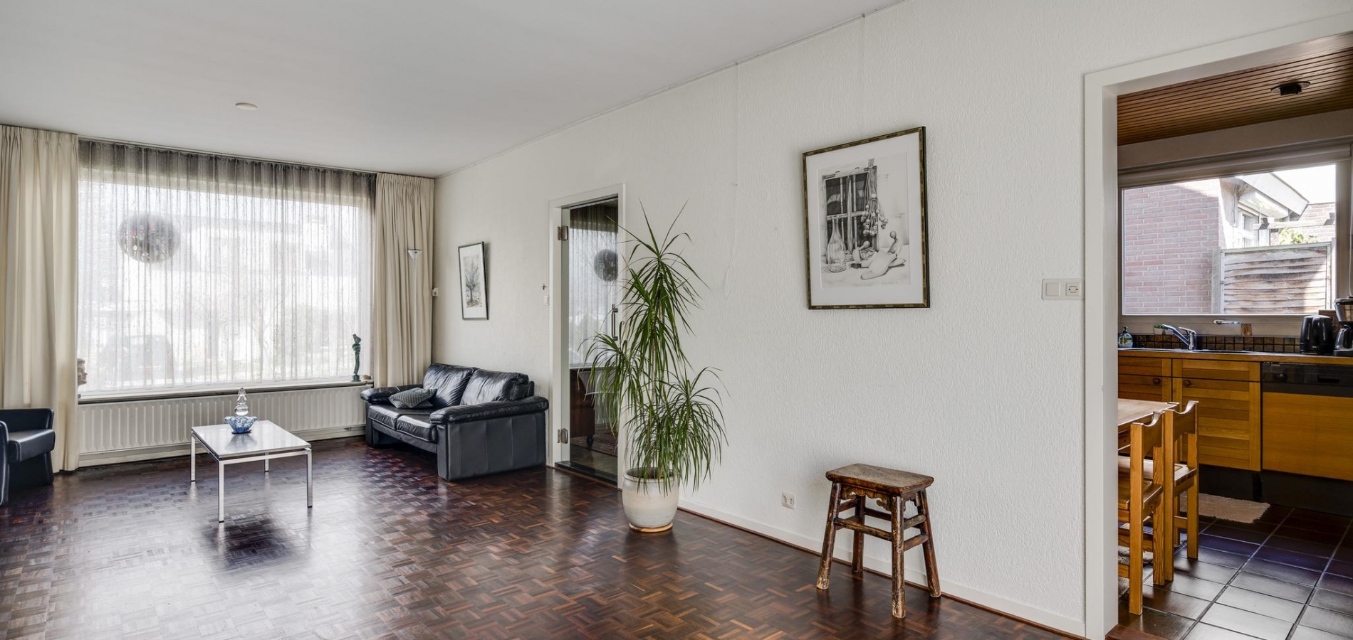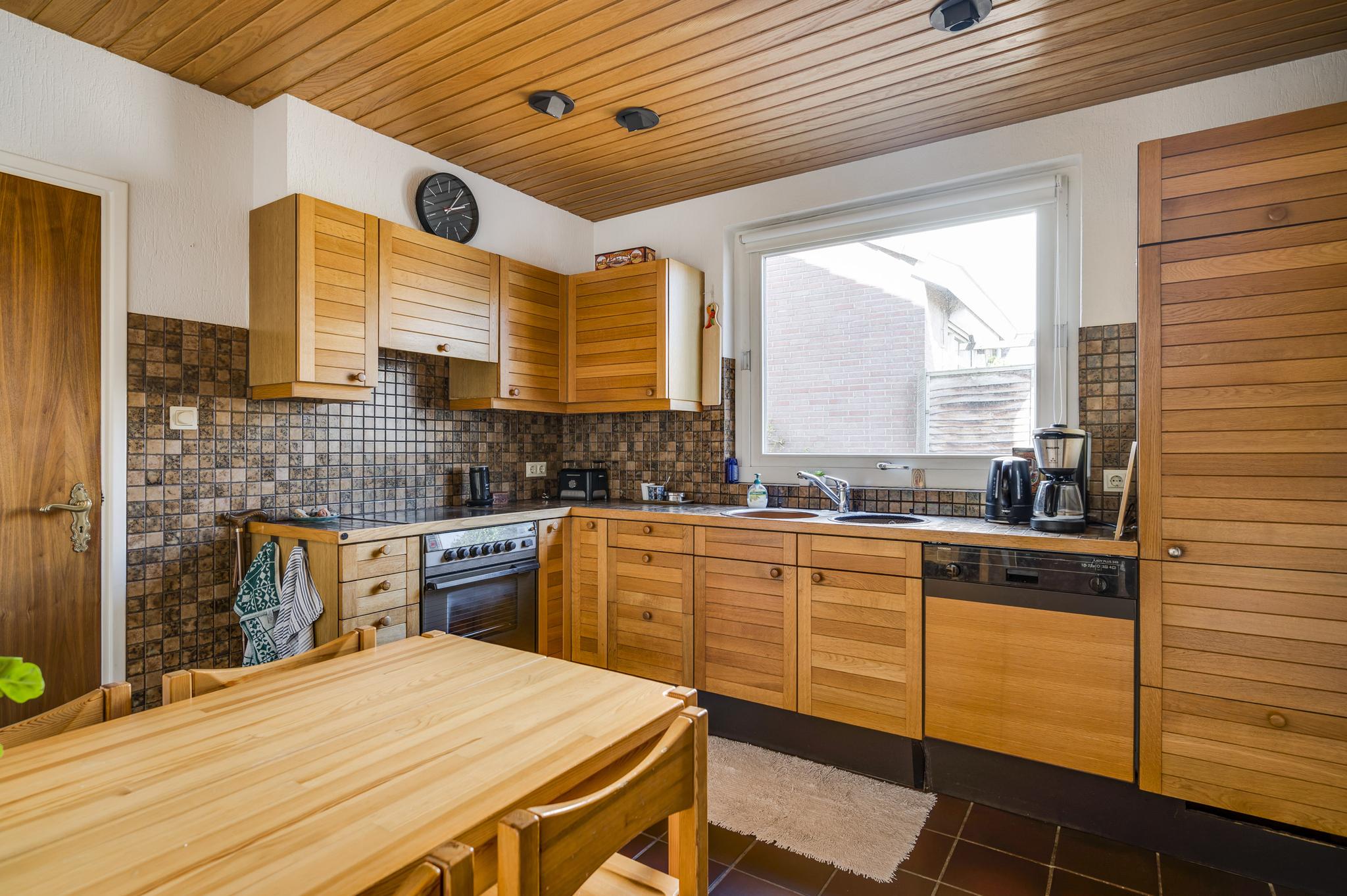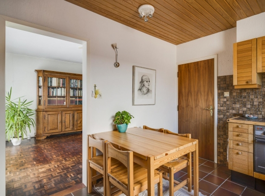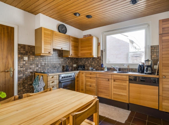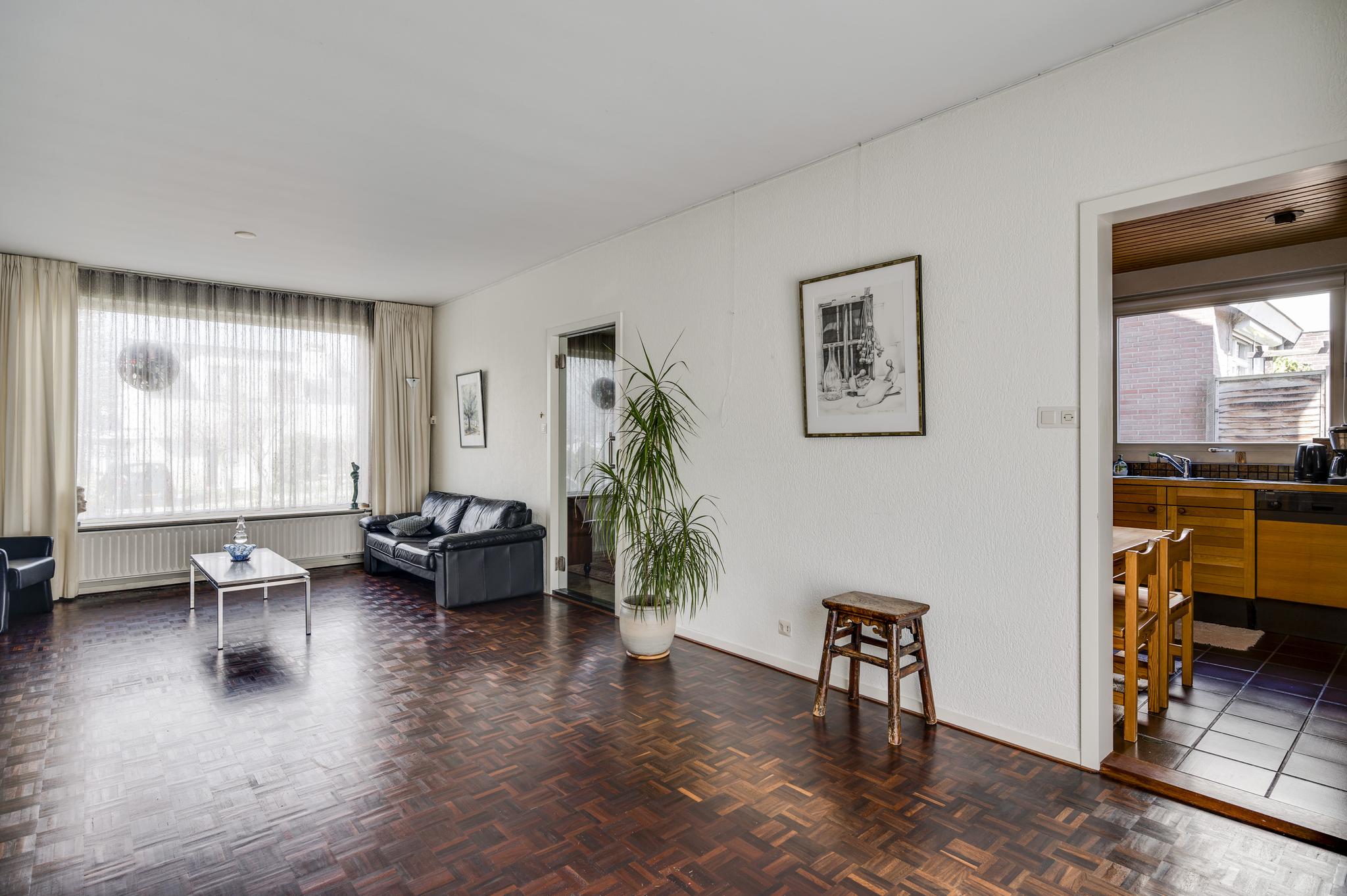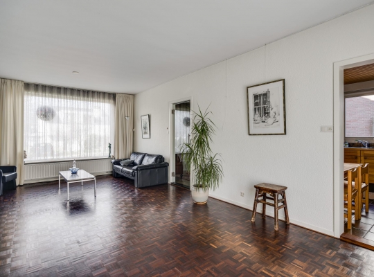 De woonkamer (7.80 x 3.91) heeft een mooie verdeling tussen het zit- en eetgedeelte. De parketvloer toont karakter en via de schuifpui bij het eetgedeelte is de achtertuin te bereiken. In de keuken (3.37 x 3.03) staat een hoekopstelling met een inductie kookplaat, afzuigkap, heteluchtoven, vaatwasser en een koelkast met vriesvak.