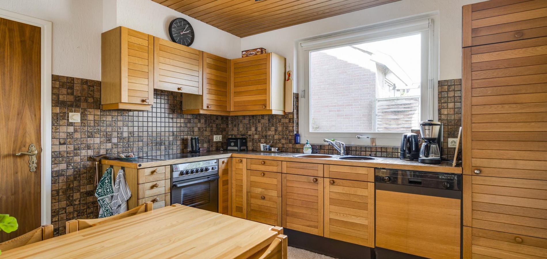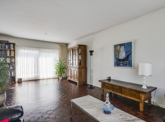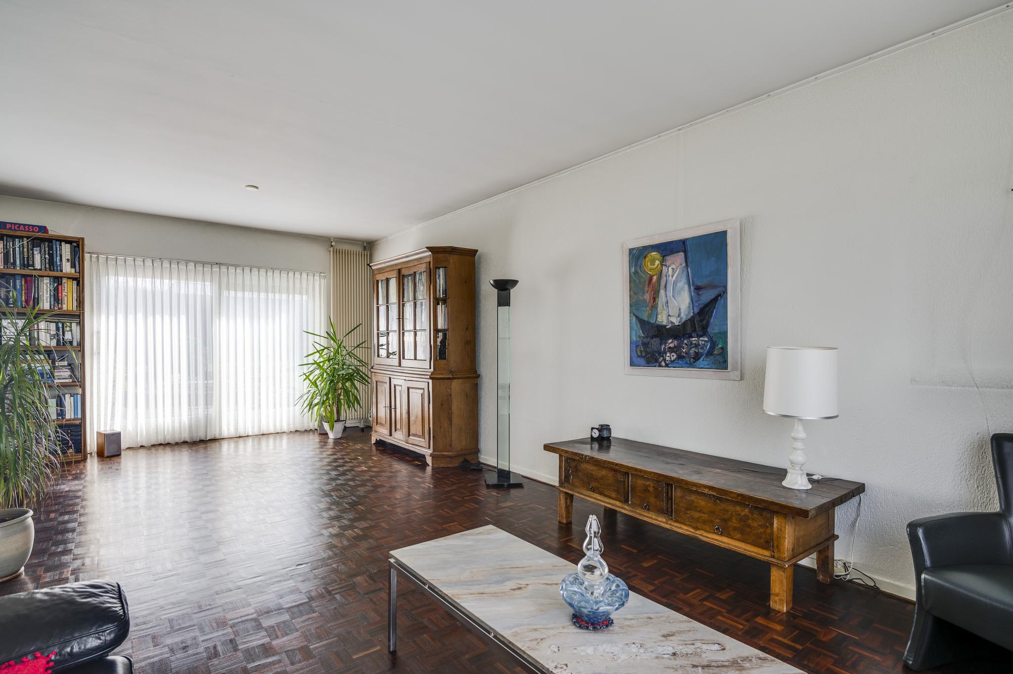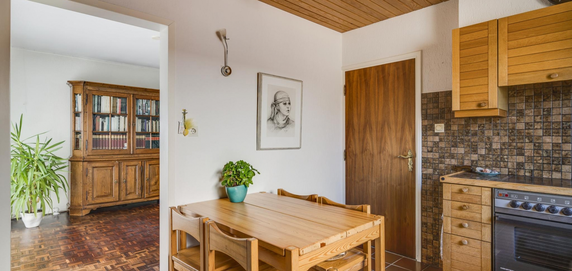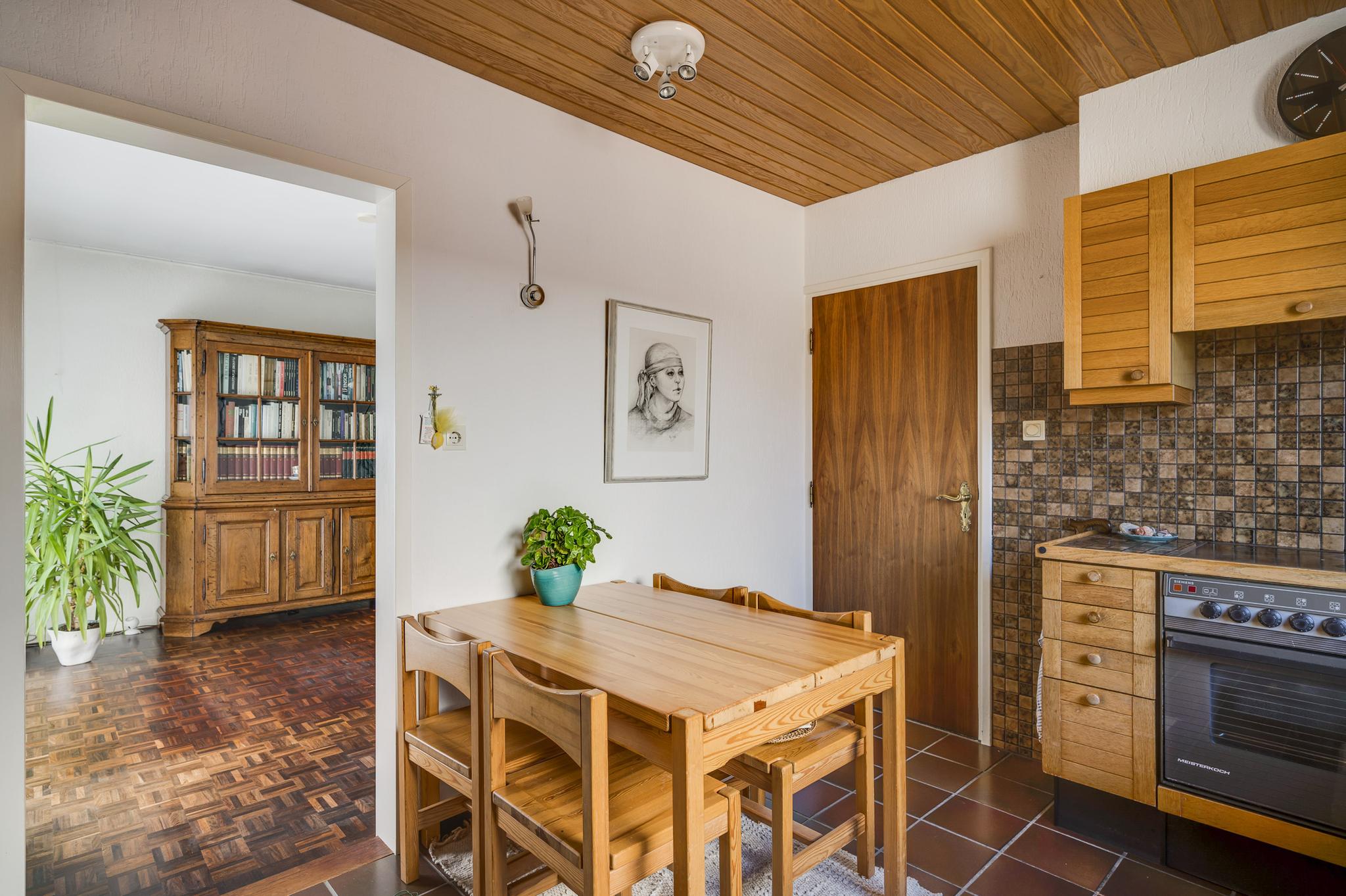De woonkamer (7.80 x 3.91) heeft een mooie verdeling tussen het zit- en eetgedeelte. De parketvloer toont karakter en via de schuifpui bij het eetgedeelte is de achtertuin te bereiken. In de keuken (3.37 x 3.03) staat een hoekopstelling met een inductie kookplaat, afzuigkap, heteluchtoven, vaatwasser en een koelkast met vriesvak.