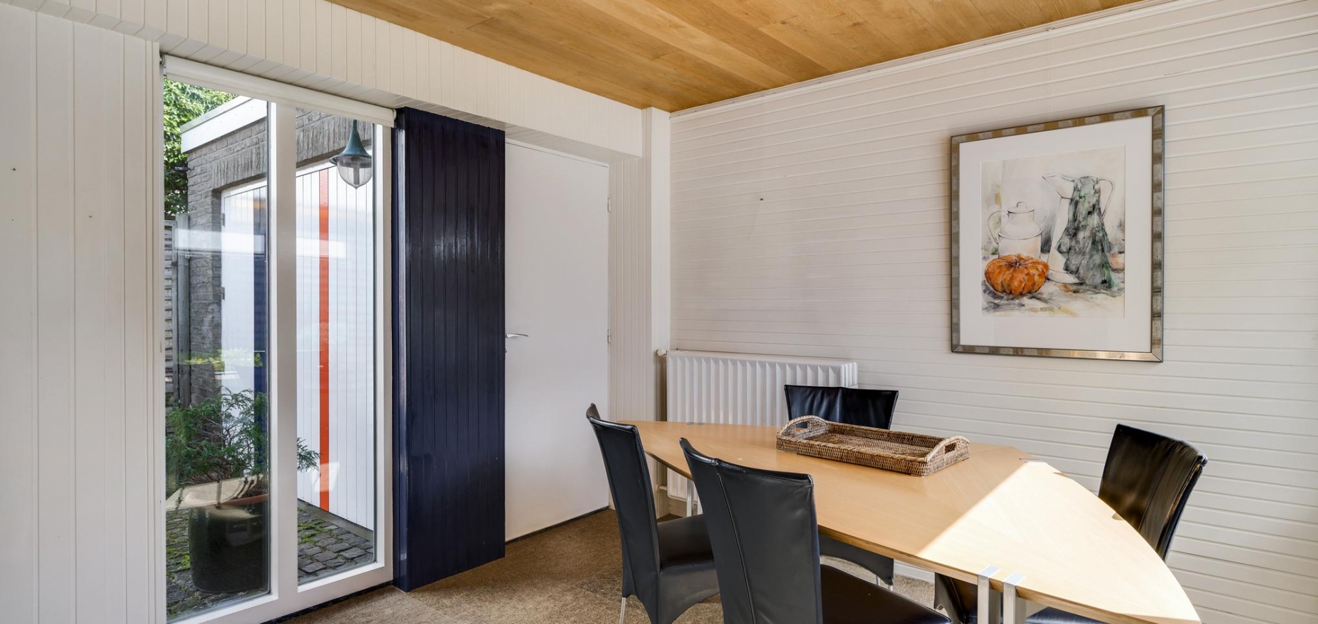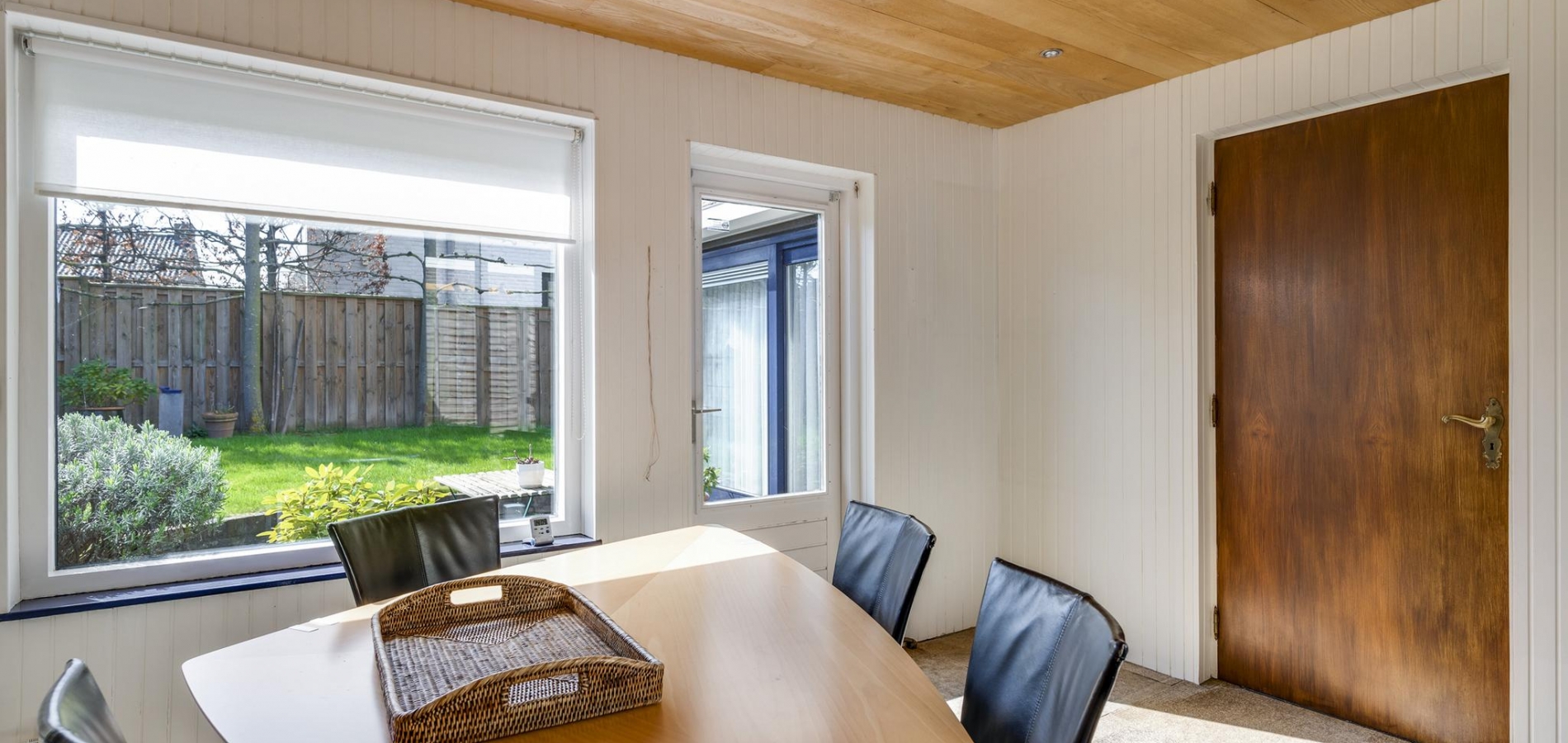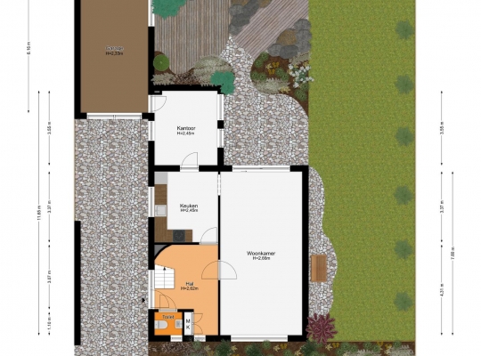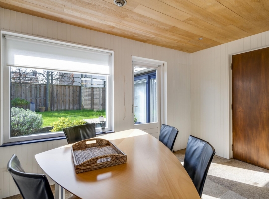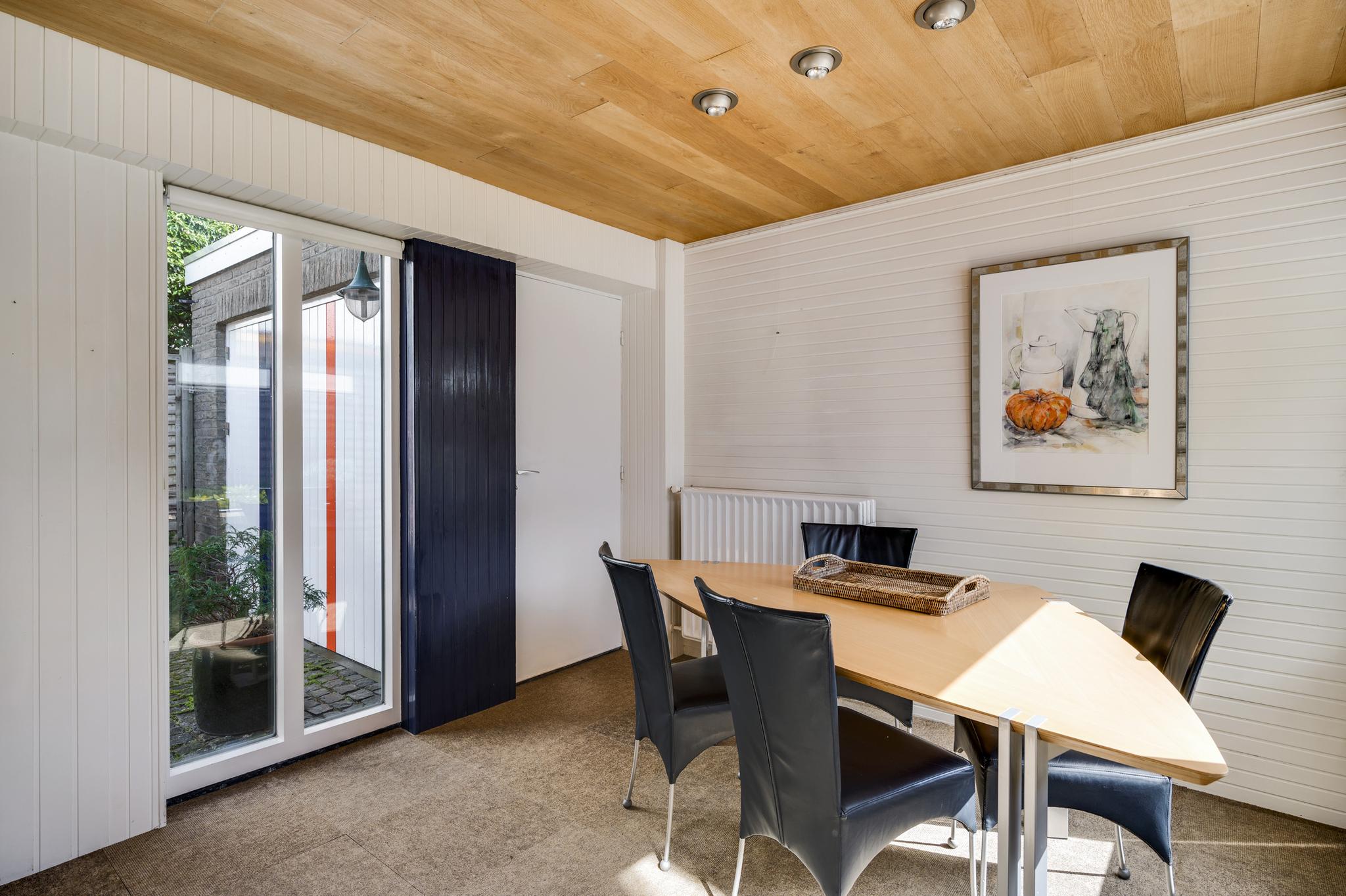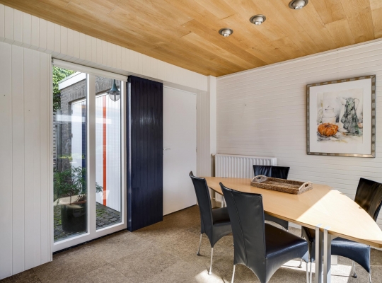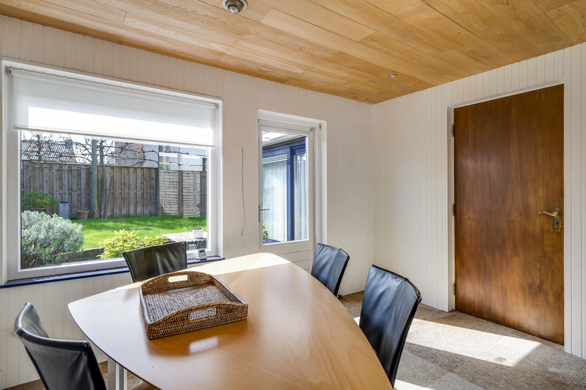 Verrassend is de aanbouw, te bereiken vanuit de keuken. Deze ruimte (3.55 x 3.00) heeft lichtinval aan twee zijden en is zeer geschikt als eetkamer of speelkamer van de kinderen. Via deze ruimte loopt u naar de stenen garage (6.16 x 3.22) met openslaande poortdeuren naar de oprit. Er is een deur naar de grote atelierruimte (7.04 x 4.15) met een entresol, fraai lichtinval en een hoge vide. Niet alleen als atelier, maar ook als kantoor aan huis is deze verwarmde ruimte heel geschikt. Een vaste trap geeft toegang tot de praktische kelder (7.05 x 4.09) met een stahoogte van 2.25 meter.