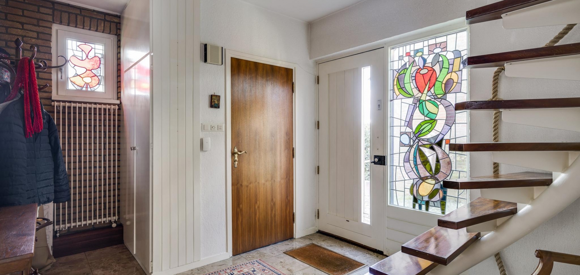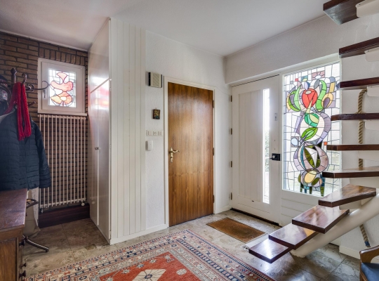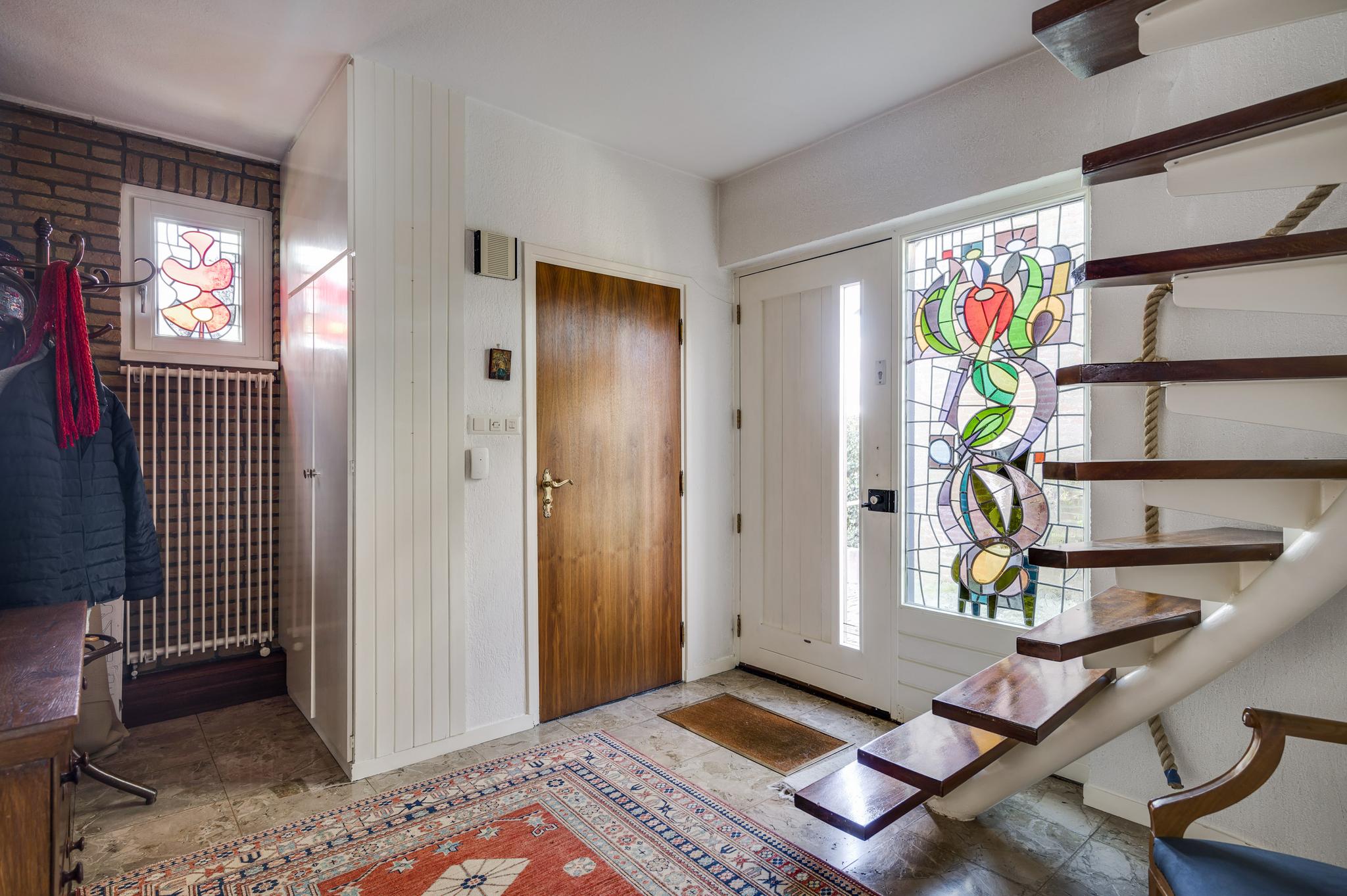 Aan de linkerzijde is de entree, waar het grote glas-in-lood raam direct uw aandacht trekt. Vanuit de hal zijn de woonkamer, keuken en de toiletruimte met fonteintje te bereiken.