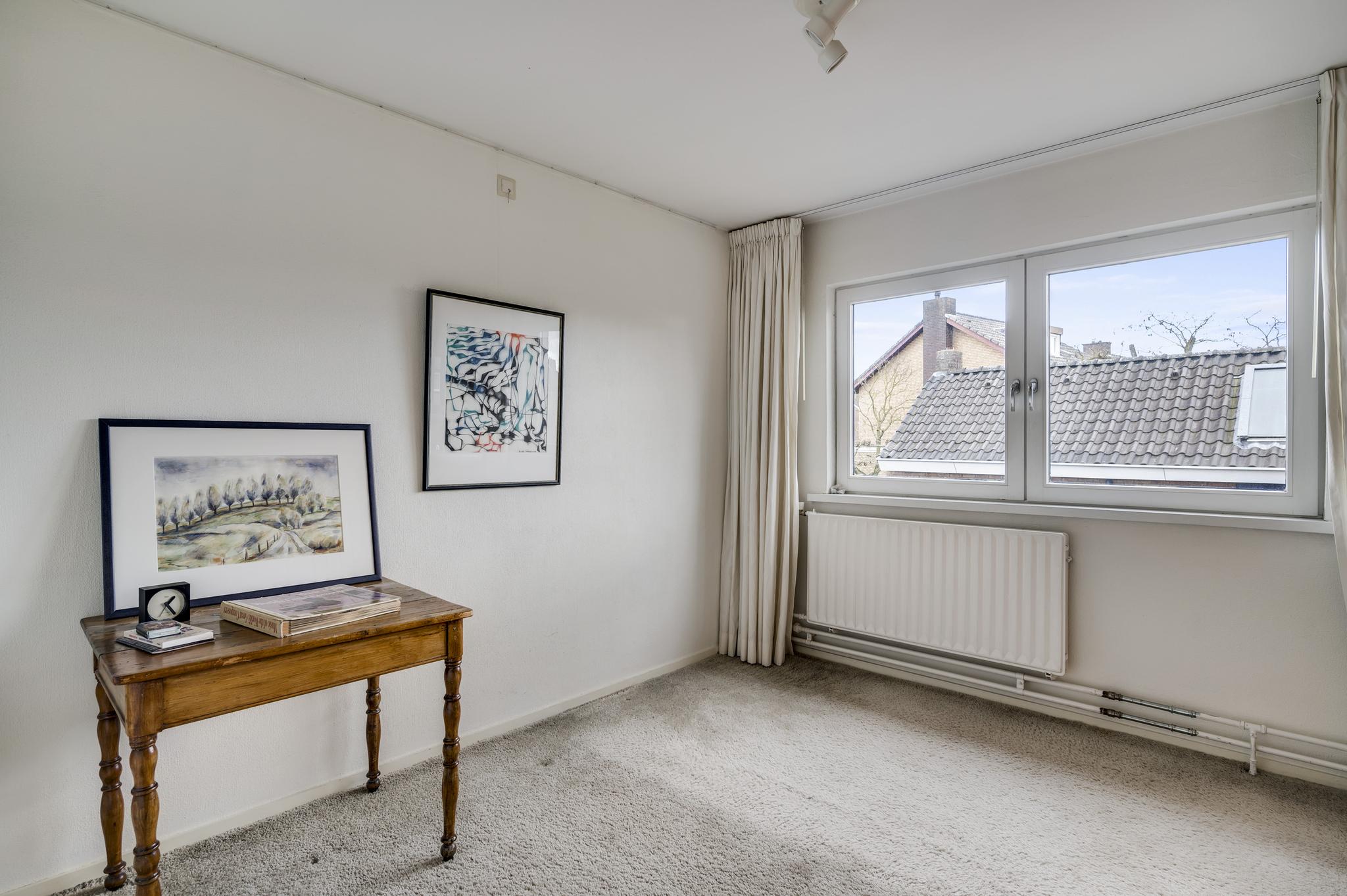Op de eerste verdieping zijn vier slaapkamers, de badkamer en een overloop. Slaapkamer I (3.88 x 3.35) en slaapkamer II (3.36 x 3.06) zijn gesitueerd aan de achterzijde. Een van deze slaapkamers heeft een vaste kastenwand. Slaapkamer III (3.73 x 2.72) en slaapkamer IV (2.74/2.30 x 2.21) zijn aan de voorzijde gesitueerd.