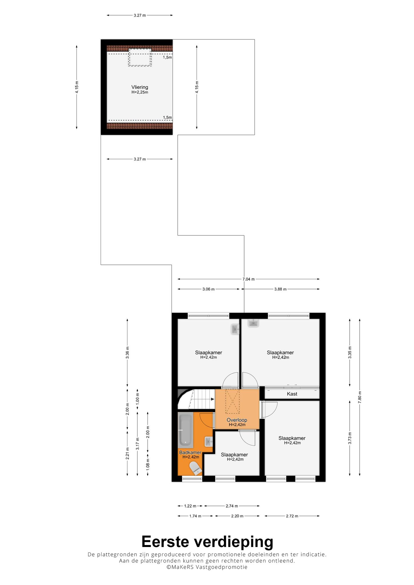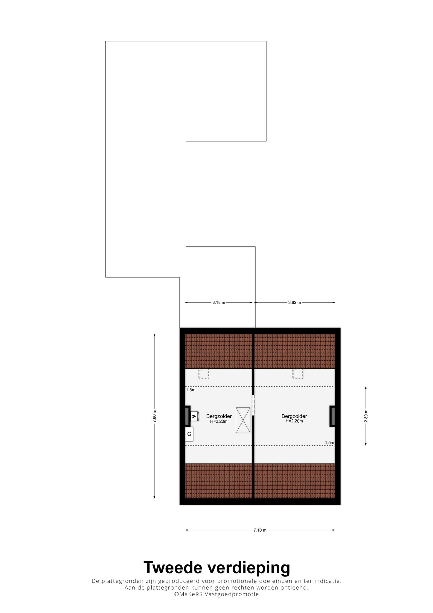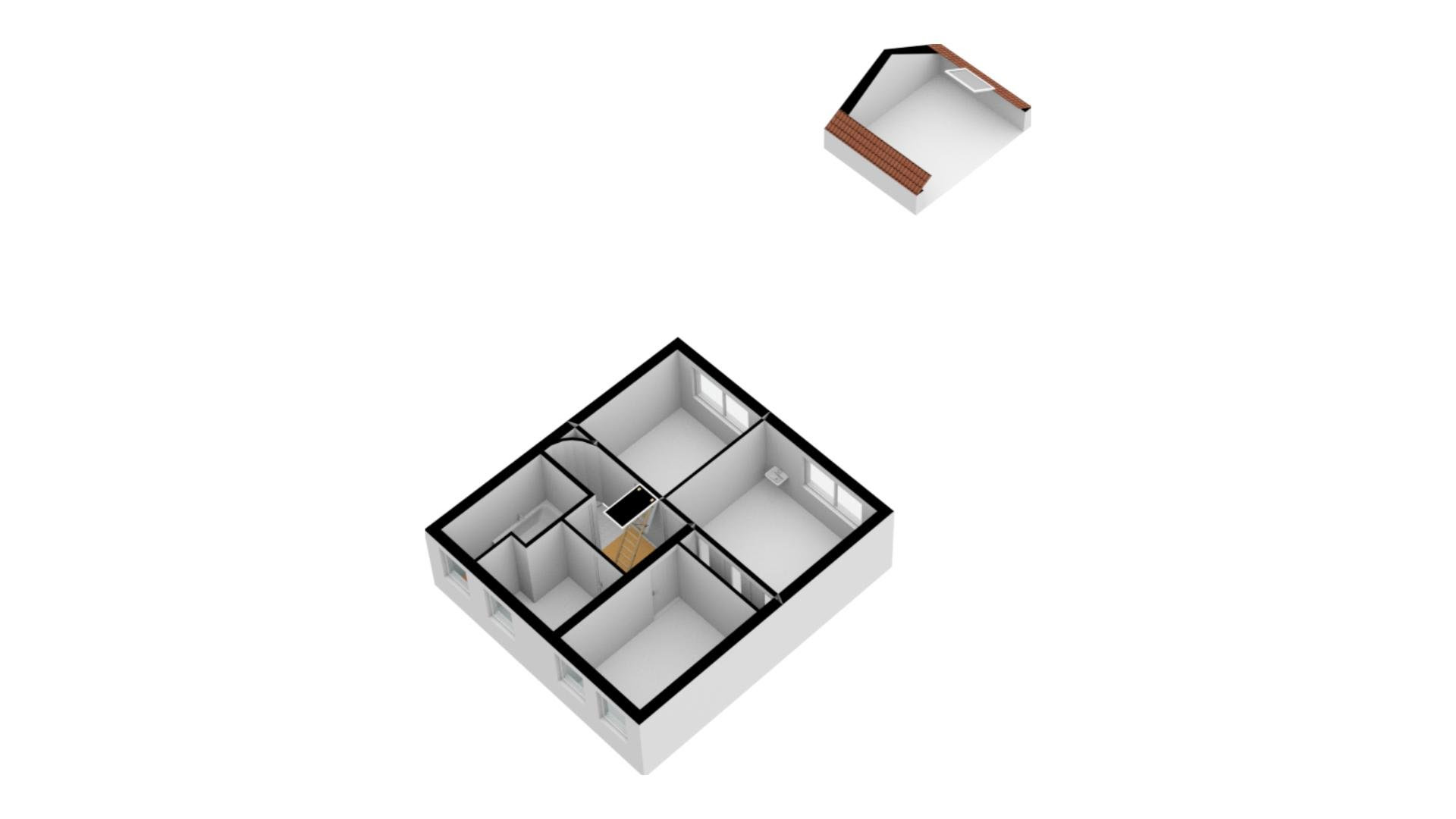 Er is een vlizotrap naar de zolderverdieping, die uit twee ruimtes bestaat. Gemeten vanaf een hoogte van 1.50 meter is de totale grootte 6.00 x 2.80 meter. In combinatie met de nokhoogte van 2.20 meter is er de mogelijkheid om een vijfde slaapkamer te realiseren.