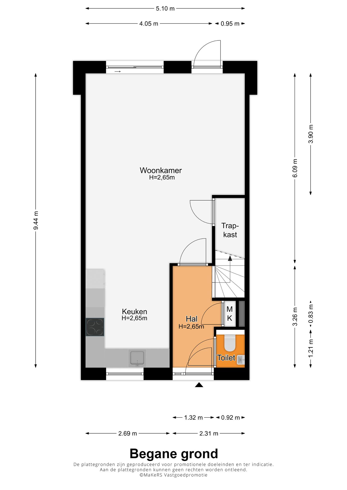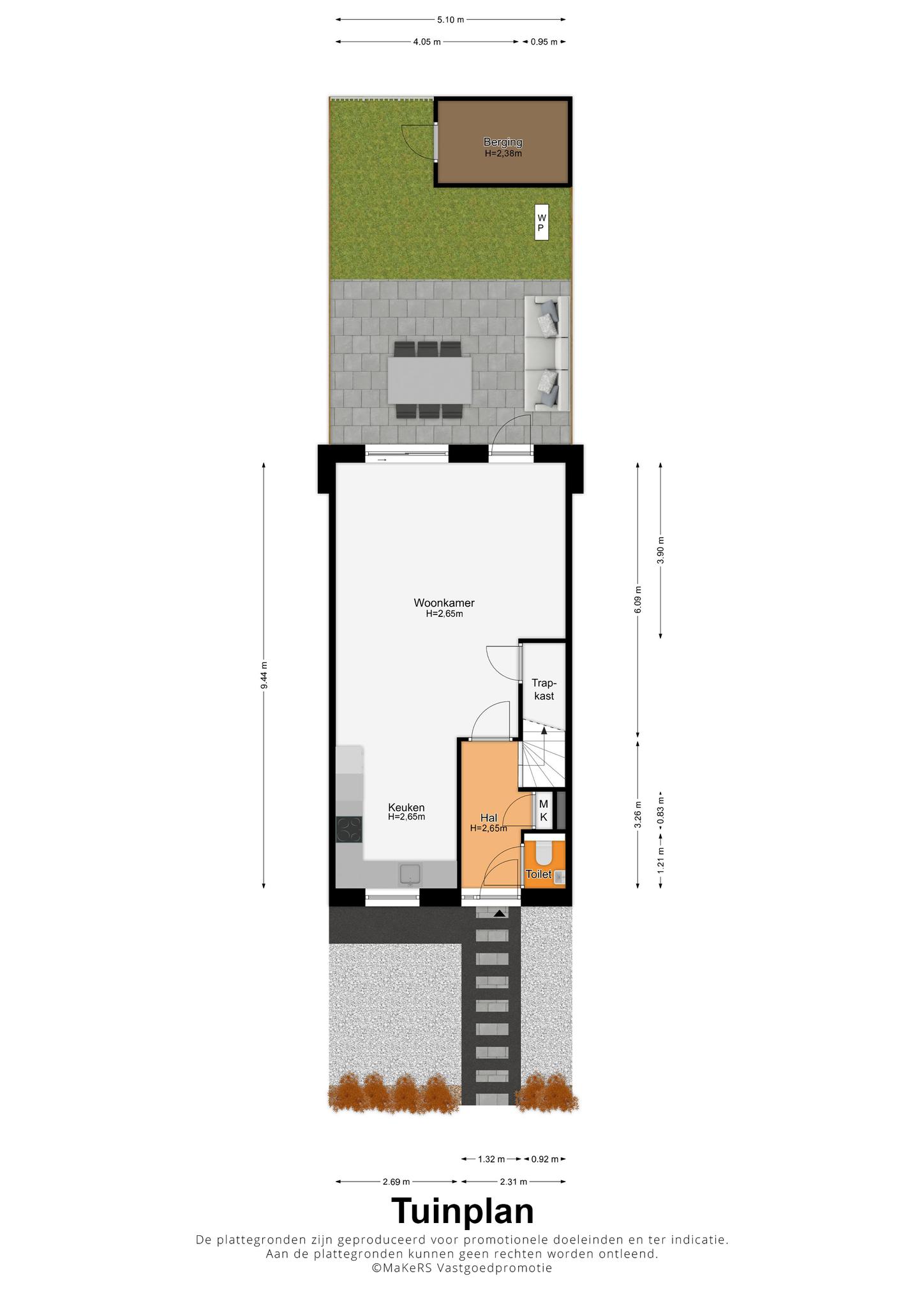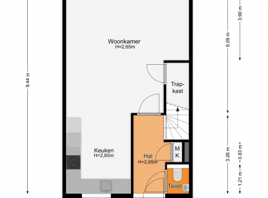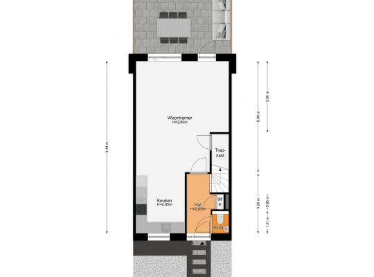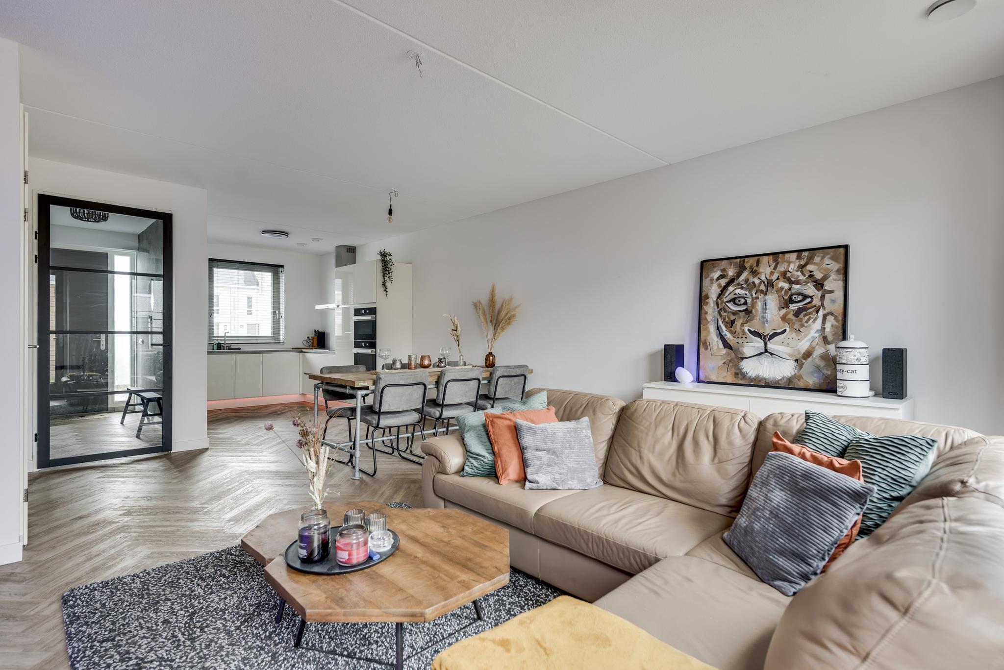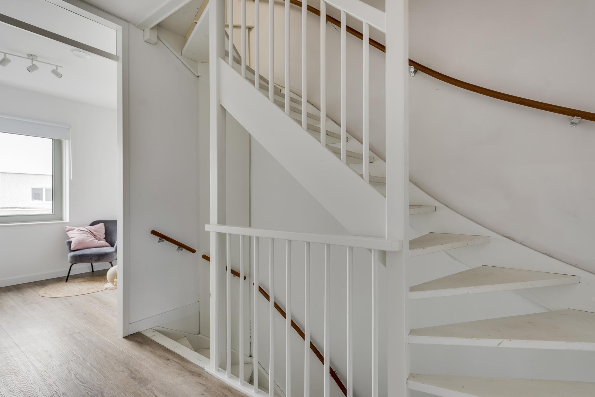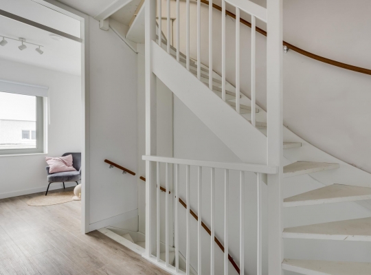 De lichte woonkamer (6.09 x 5.10) heeft een schuifpui en een aparte deur naar de tuin. Onder de trap is een diepe trapkast voor extra bergruimte. Er is genoeg ruimte voor een grote zithoek en een eettafel, waar u als gezin en met familie of vrienden kunt eten.