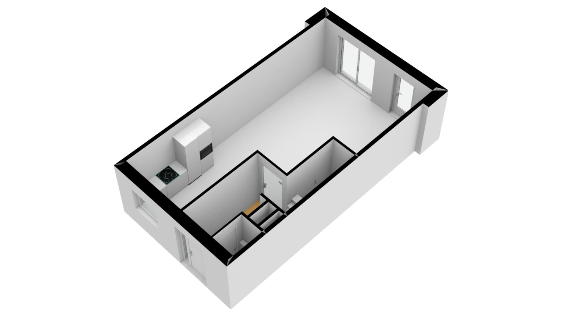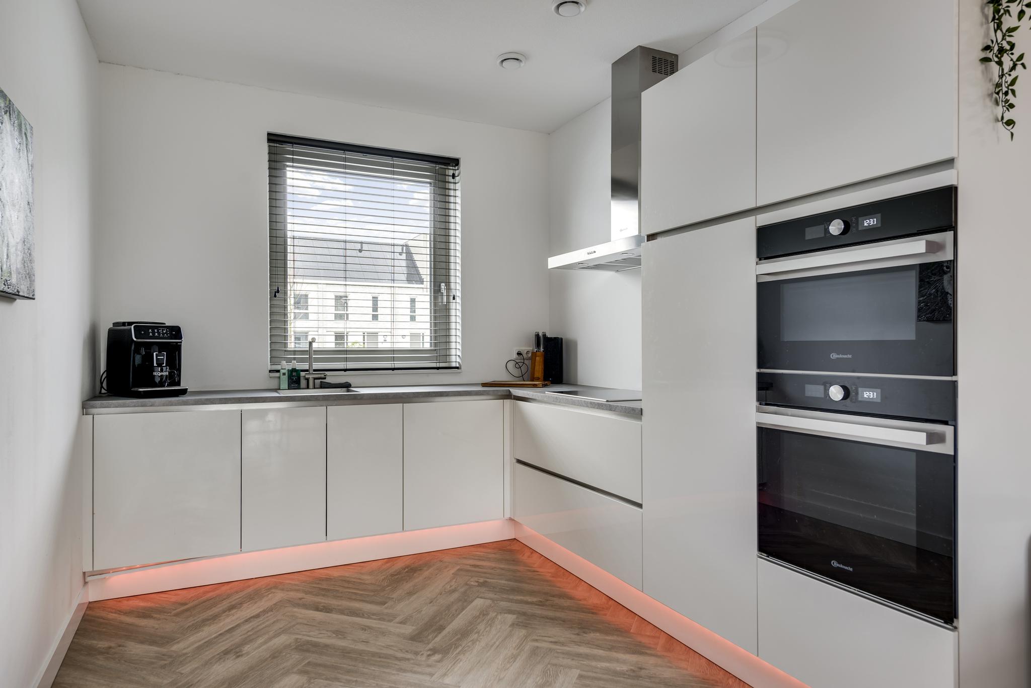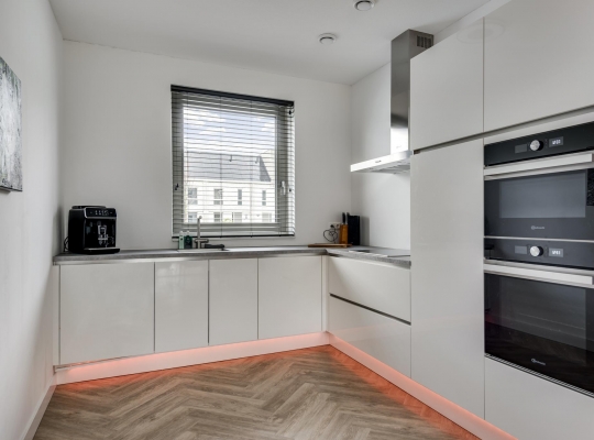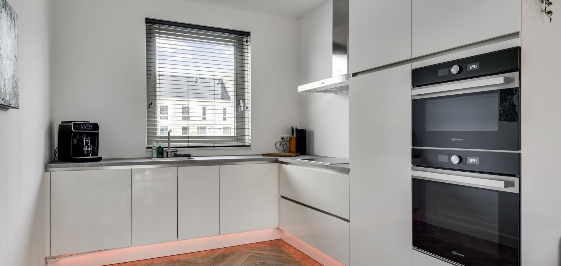 Aan de voorzijde is de open keuken (3.26 x 2.69) met een groot raam en een moderne hoekopstelling, alle benodigde inbouwapparatuur van Bauknecht: een inductie kookplaat, afzuigkap, vaatwasser, koel-/vriescombinatie, oven en een combi-oven/magnetron. Ziet u zichzelf hier al koken met mooi uitzicht naar de brede, rustige straat?