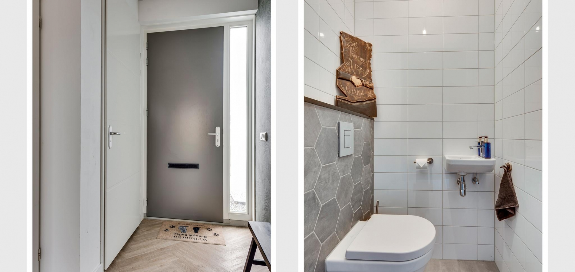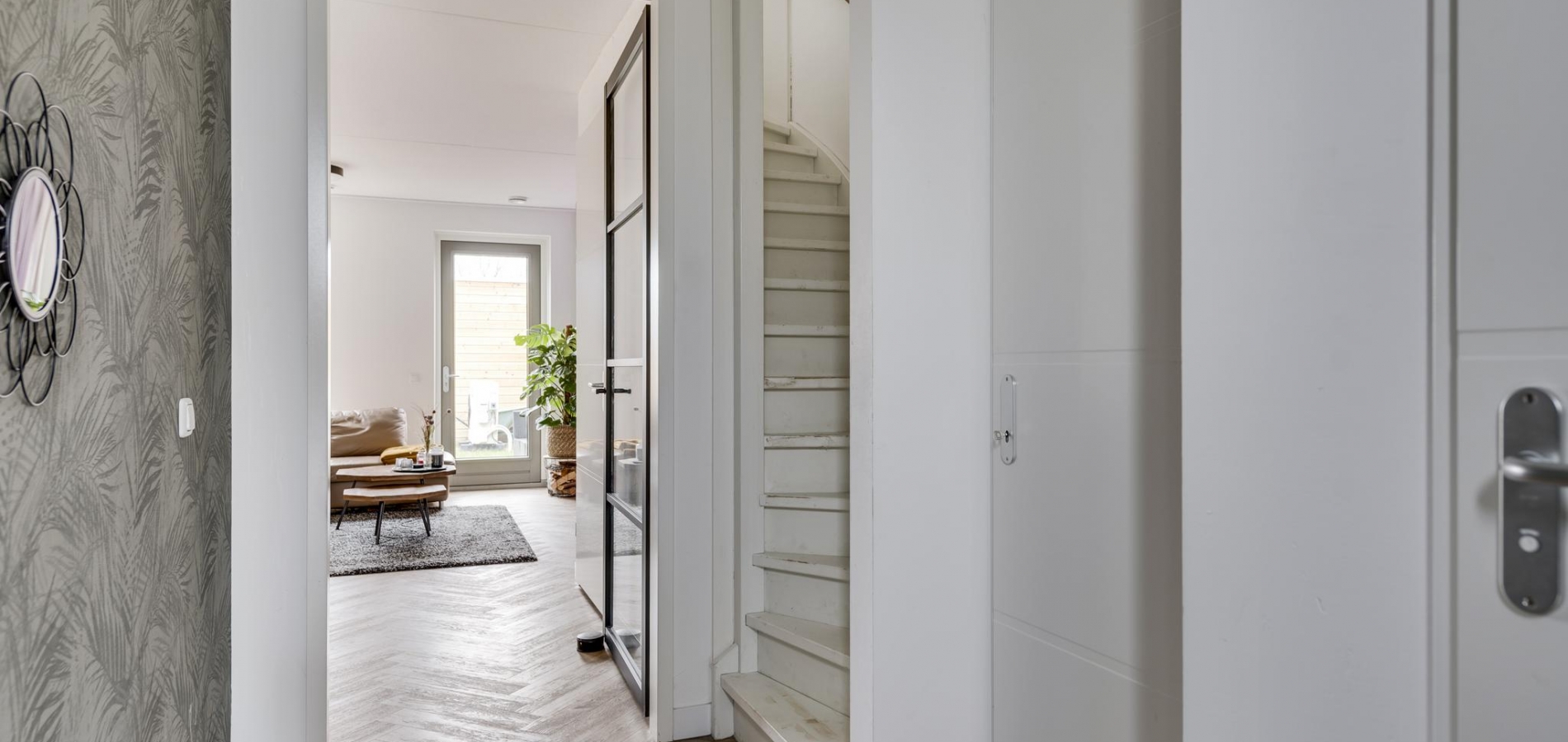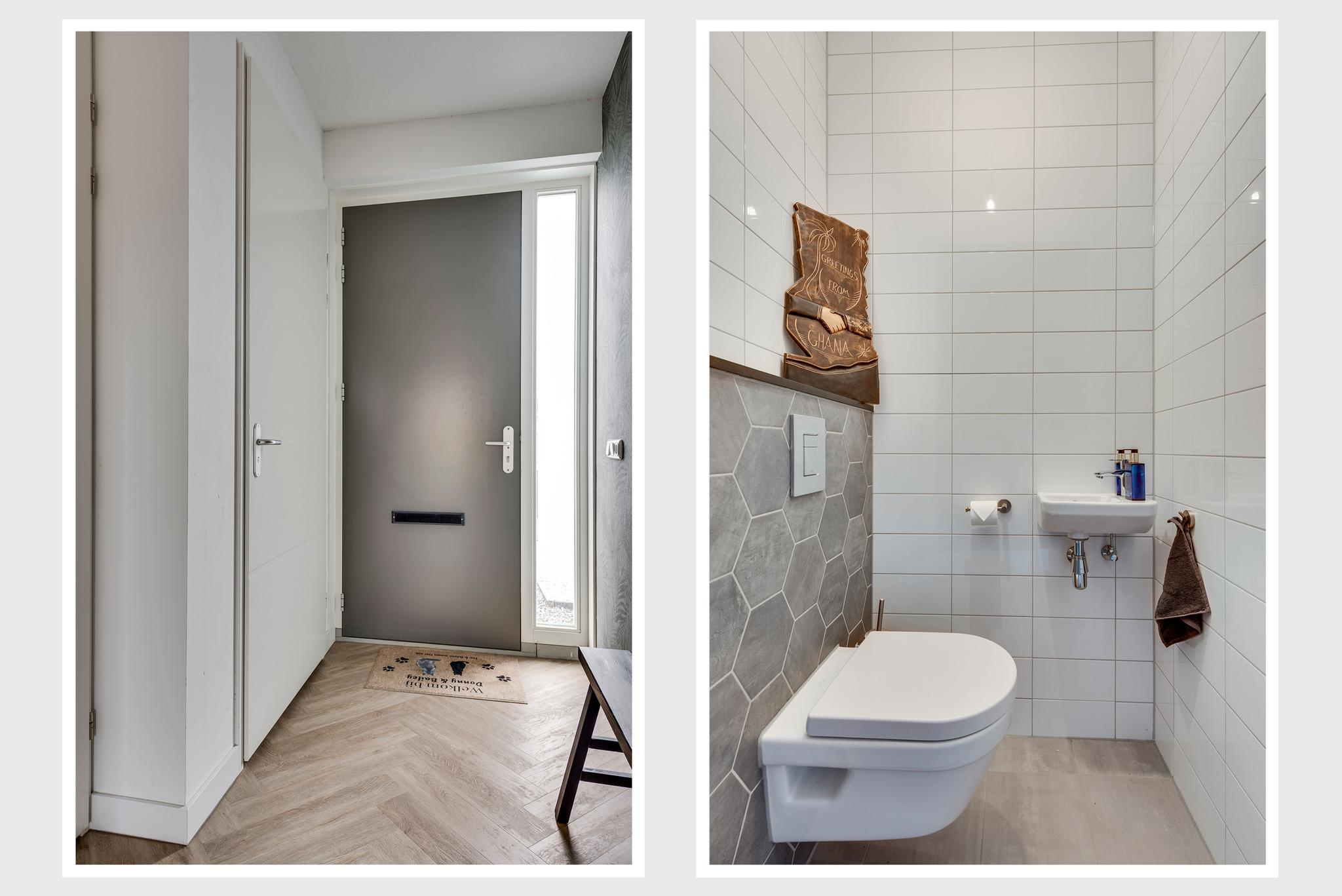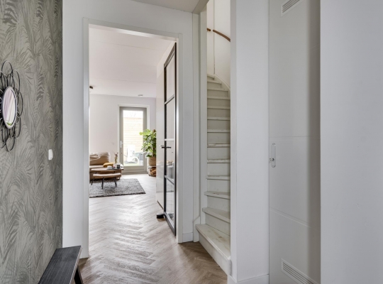 Zodra u in de hal staat, ziet u dat dit huis zo goed als nieuw is en veel sfeer heeft. De visgraatvloer met vloerverwarming ligt op bijna de hele begane grond en een van de wanden in de hal is afgewerkt met hip patroonbehang. Aan de rechterzijde zijn de trapopgang, meterkast en de moderne toiletruimte met fonteintje.