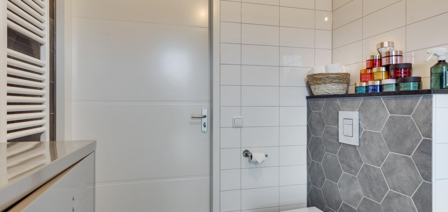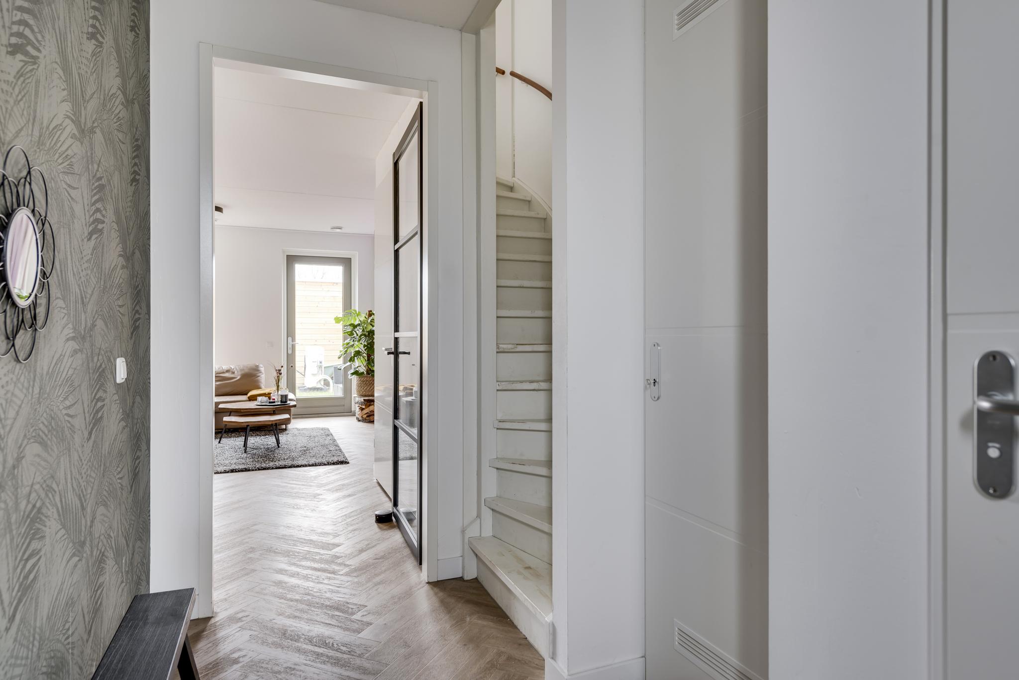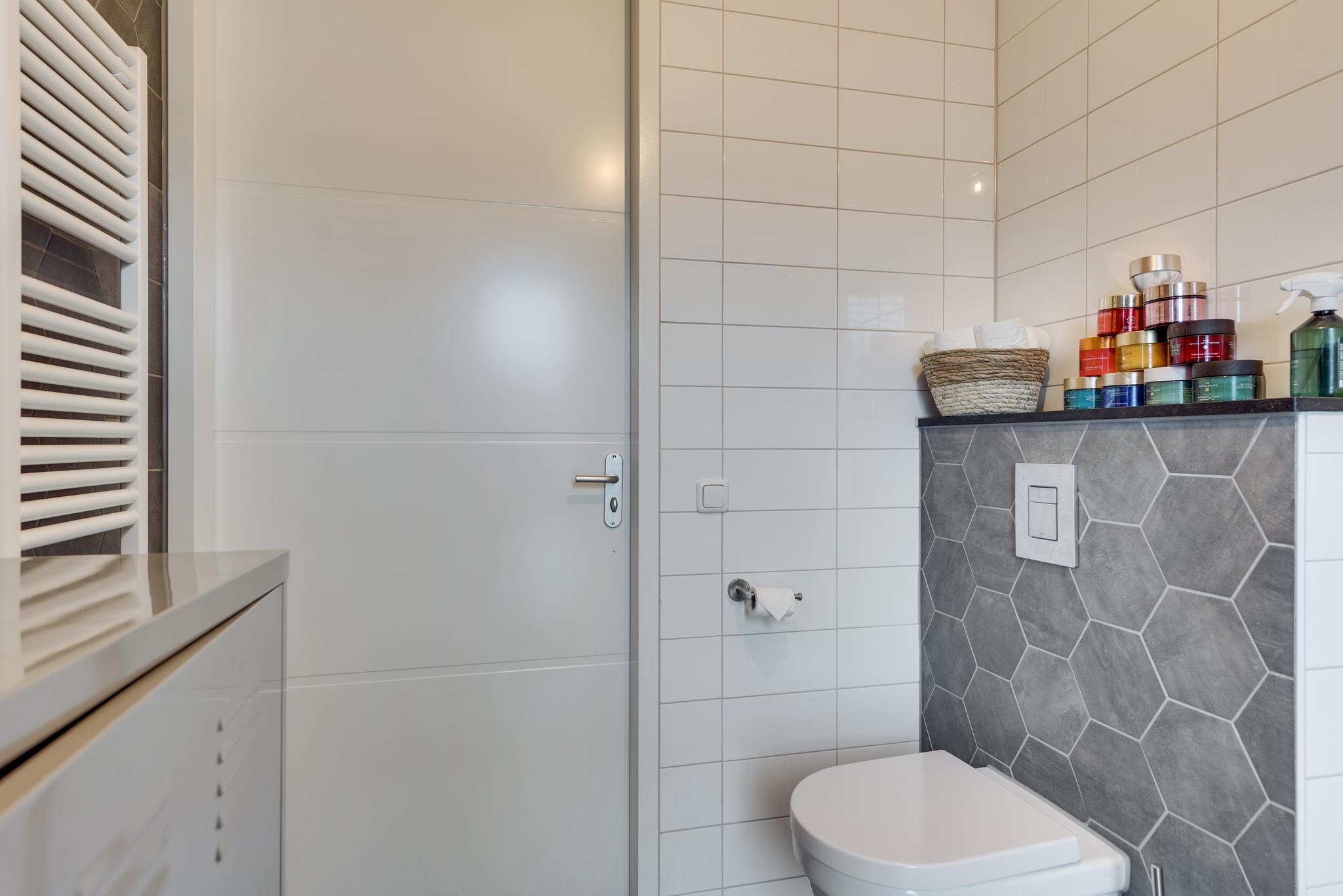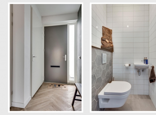Zodra u in de hal staat, ziet u dat dit huis zo goed als nieuw is en veel sfeer heeft. De visgraatvloer met vloerverwarming ligt op bijna de hele begane grond en een van de wanden in de hal is afgewerkt met hip patroonbehang. Aan de rechterzijde zijn de trapopgang, meterkast en de moderne toiletruimte met fonteintje.