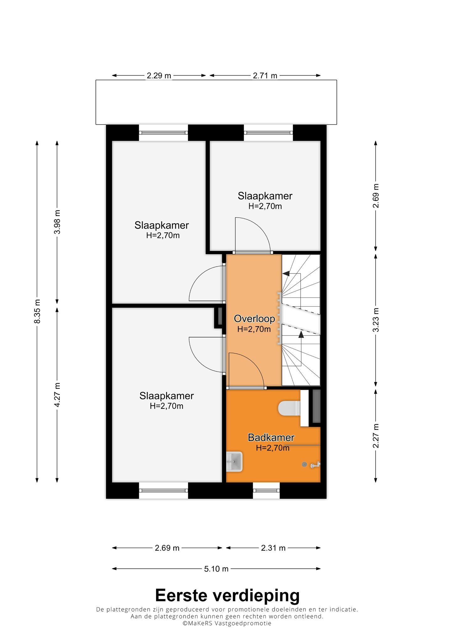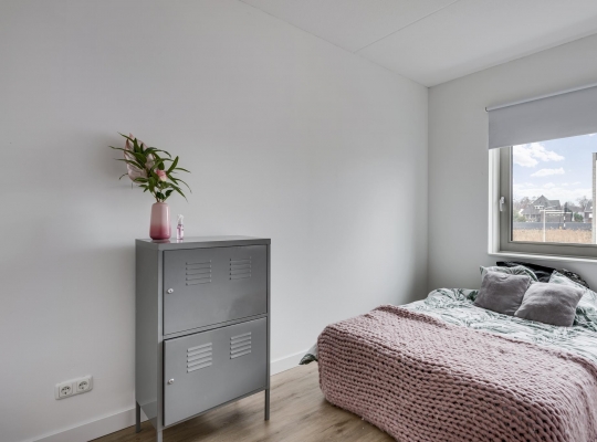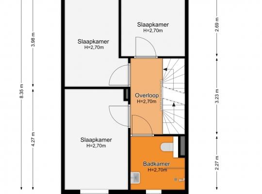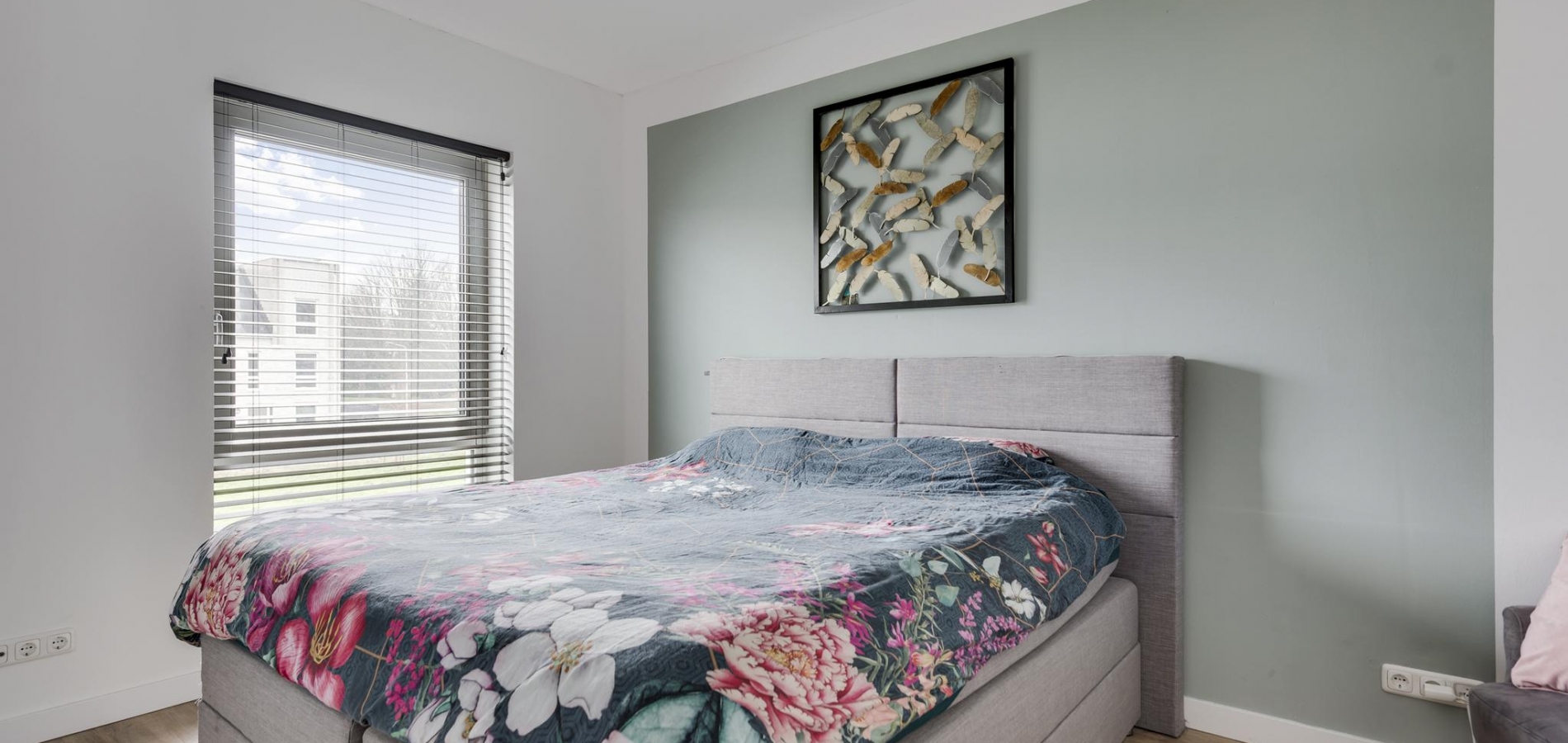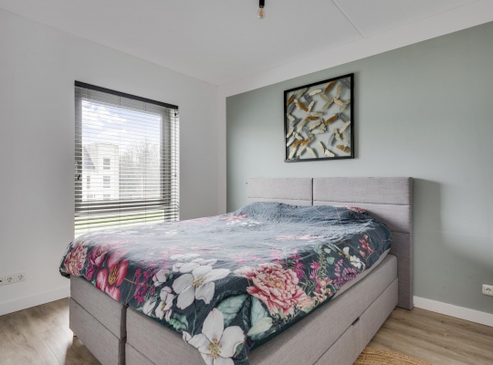 Vanaf de overloop zijn drie slaapkamers te bereiken. Aan de voorzijde is de ouderslaapkamer (4.27 x 2.69) en aan de achterzijde zijn slaapkamer II (3.98 x 2.69/2.29) en slaapkamer III (2.71 x 2.69). Op de overloop en in de slaapkamers ligt een mooie pvc-vloer met houtpatroon en vloerverwarming.