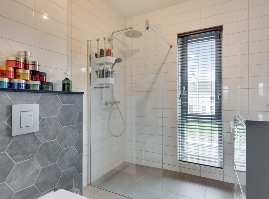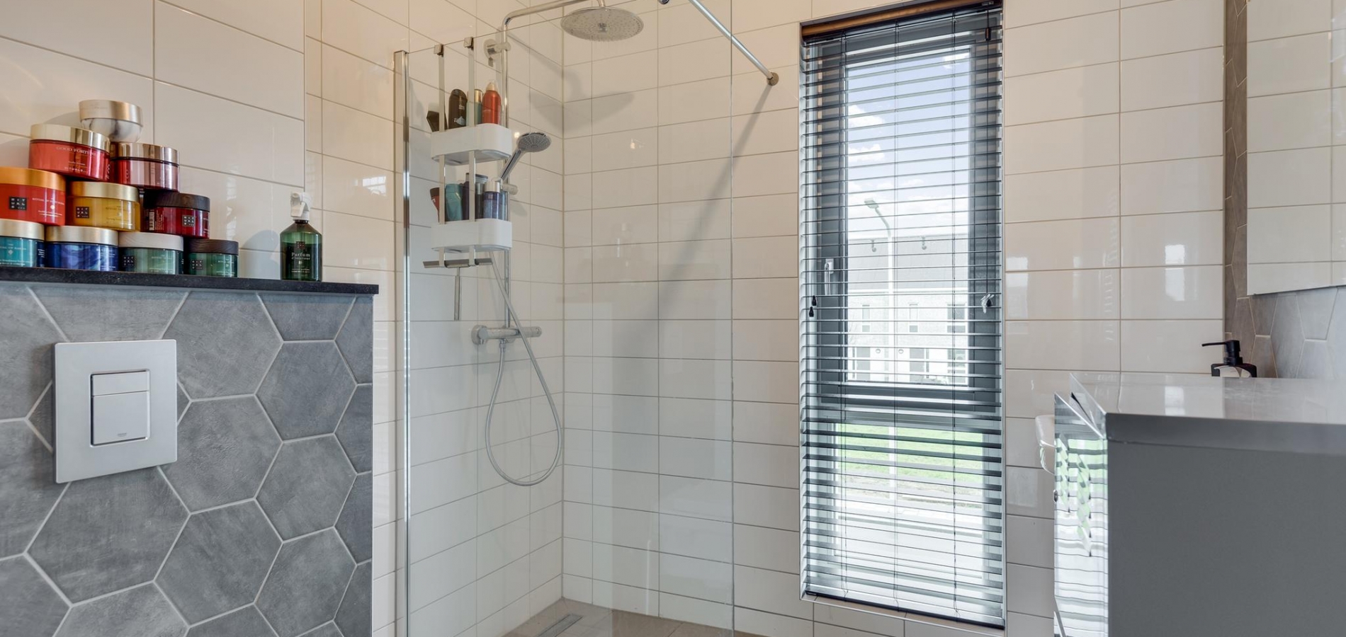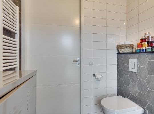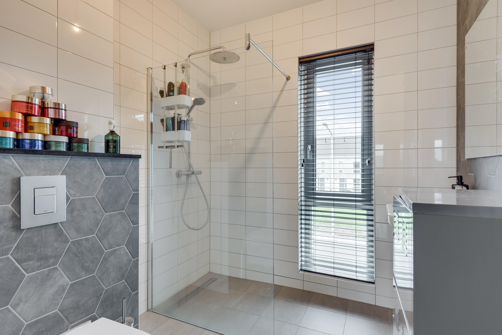 De badkamer (2.31 x 2.27) is ingedeeld met mooie wand- en vloertegels, een grote inloopdouche, wandcloset en een modern wastafelmeubel. Door de ramen in de voorgevel valt veel licht naar binnen.