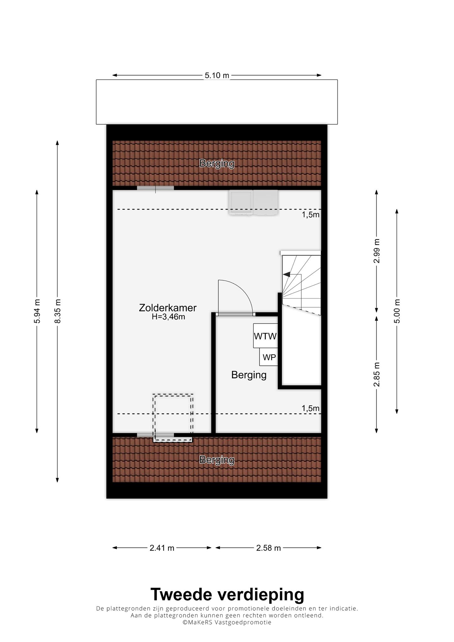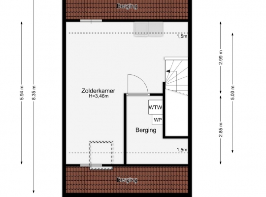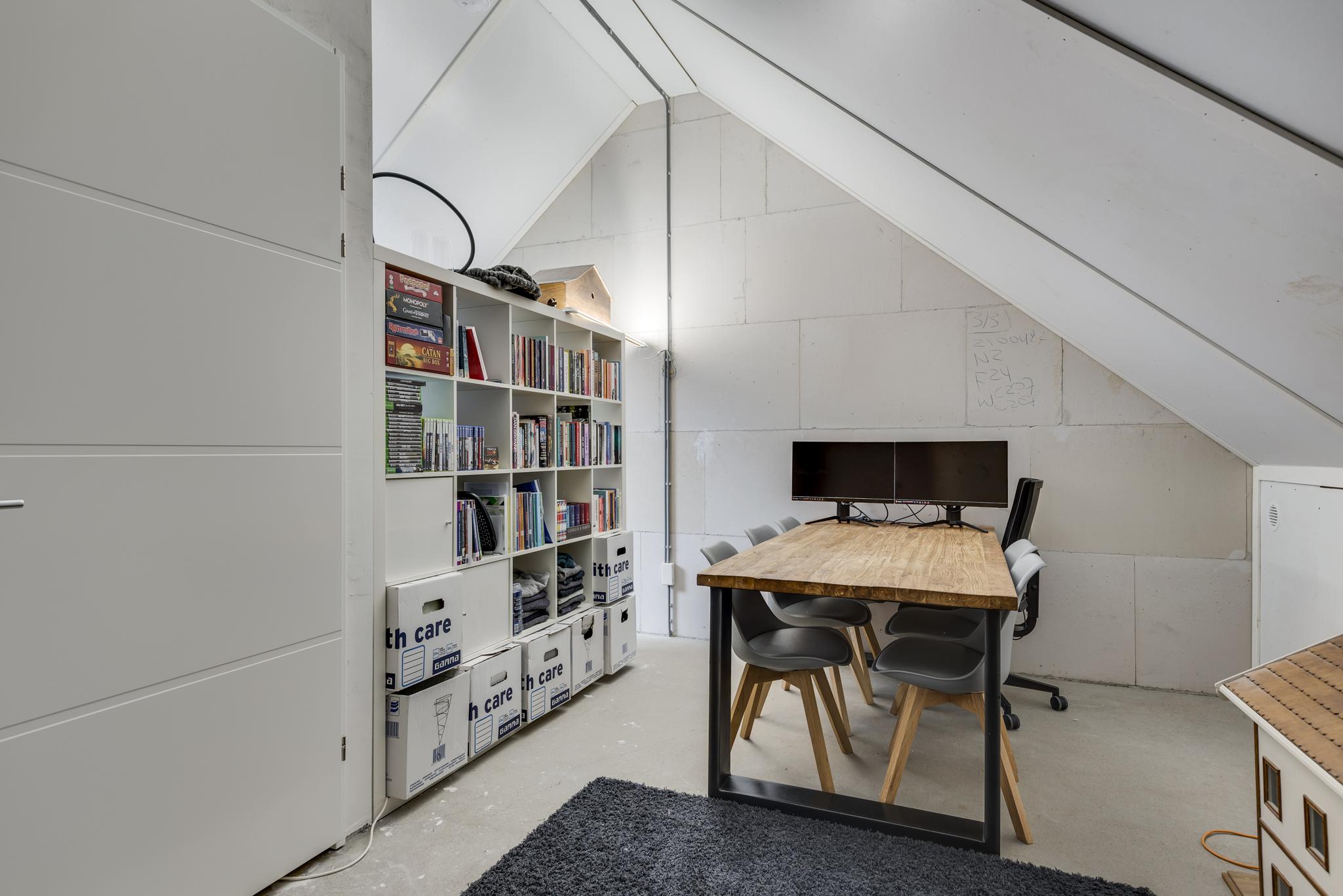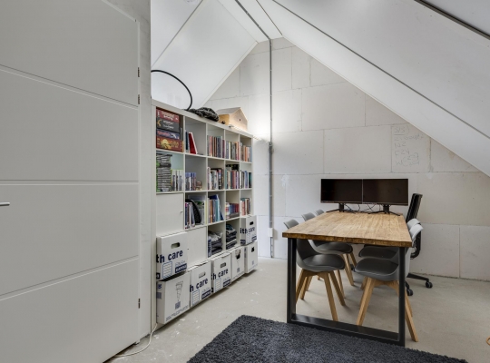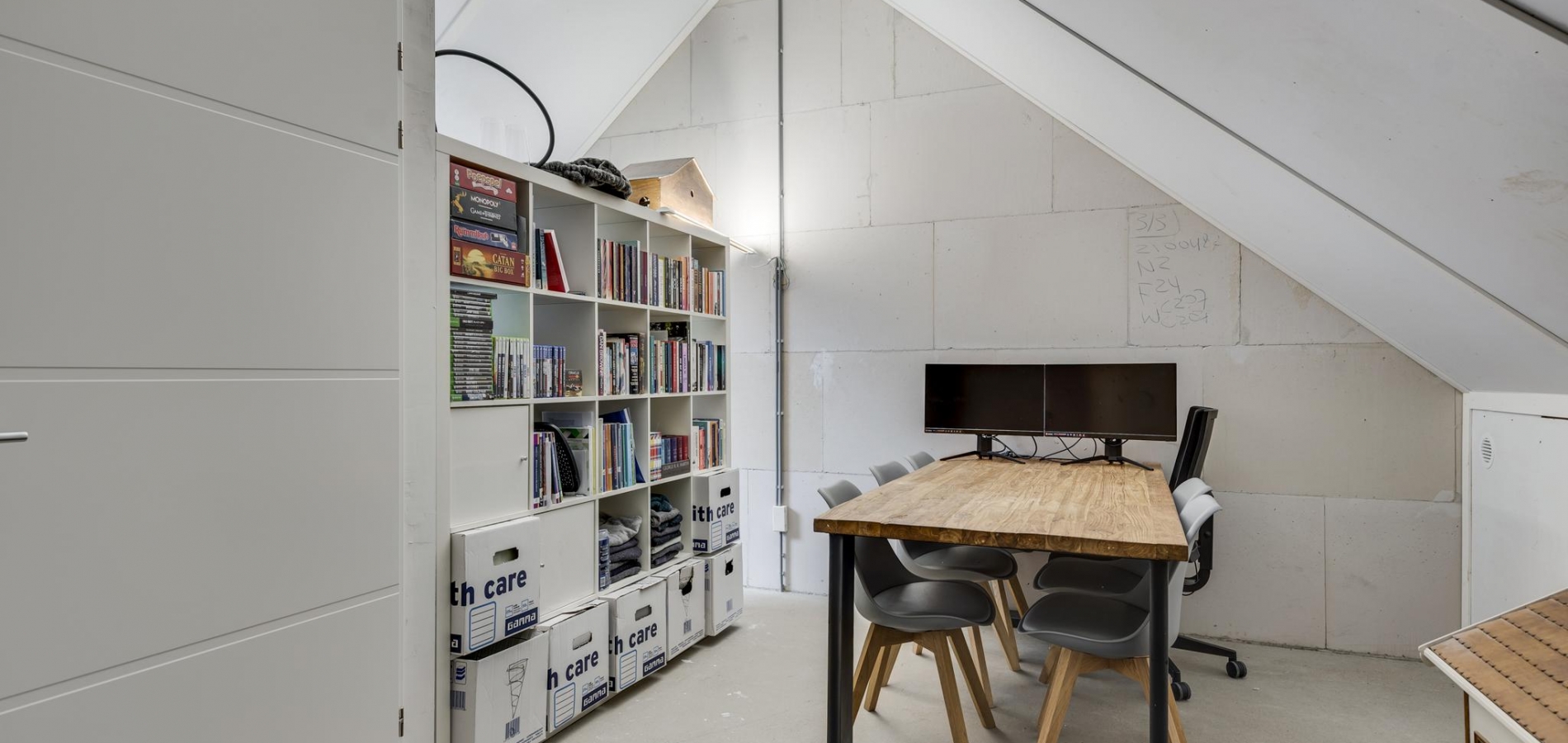 Wat een ruimte is er op de tweede verdieping, te bereiken via een vaste trap. Vanaf 1.50 meter hoogte is er ruim 25 m² beschikbaar, verdeeld in een berging en een zolderkamer. De zolderkamer heeft een groot dakraam aan de voorzijde en in de schuinten van het dak is veel bergruimte. Tevens zijn op de zolderkamer de aansluitingen voor het witgoedapparatuur te vinden. In de berging treft u de WTW-unit, de omvormer van de zonnepanelen en de binnen-unit van de warmtepomp.