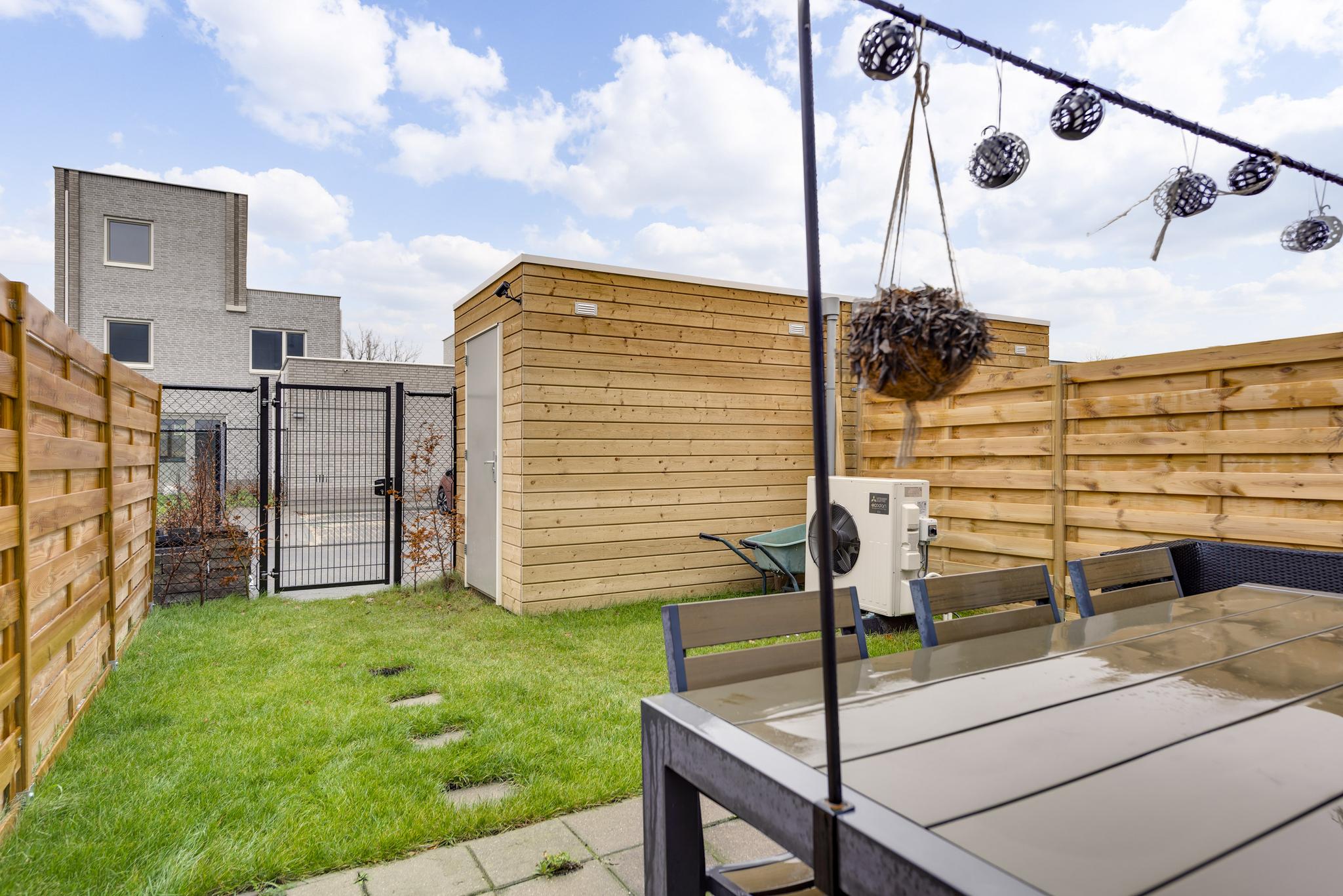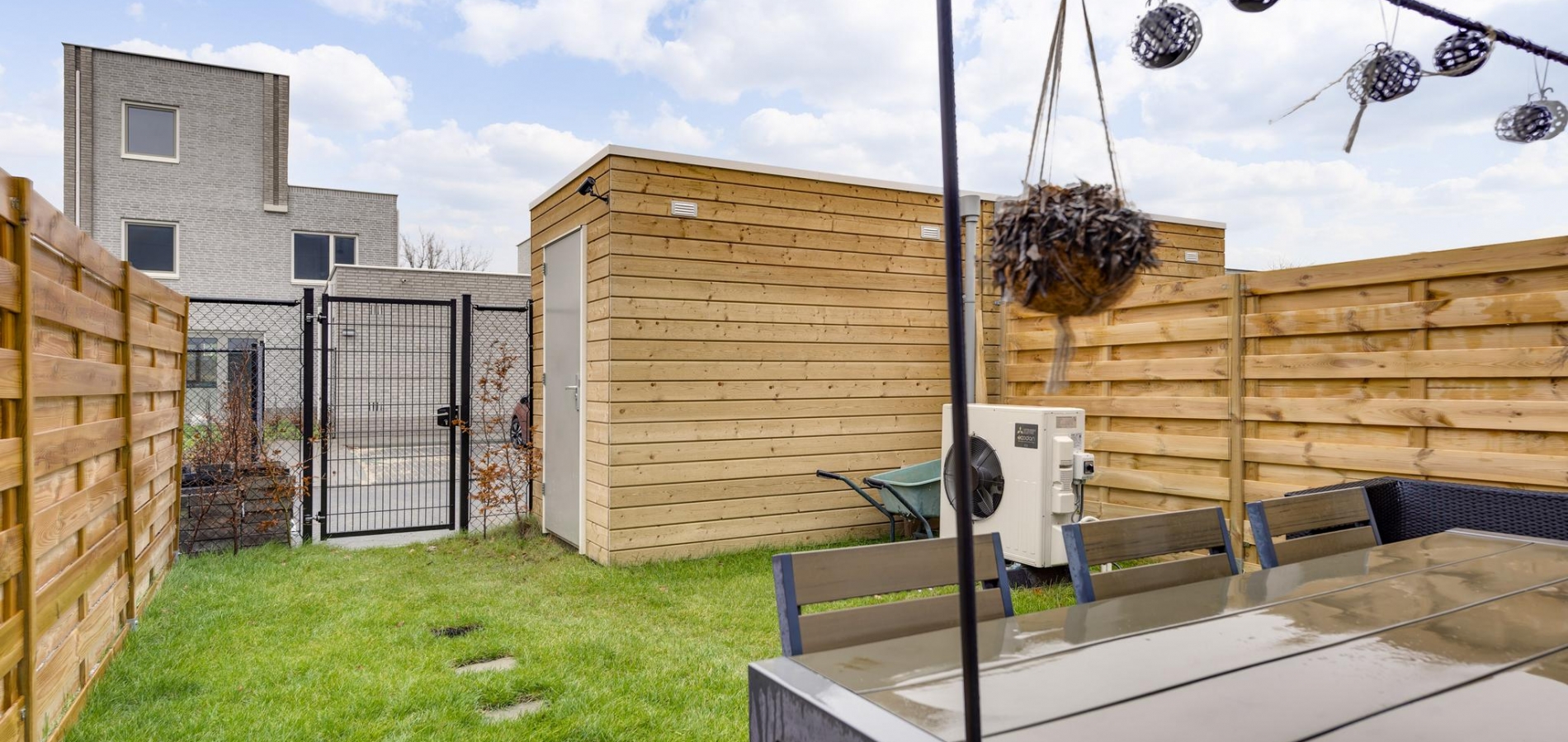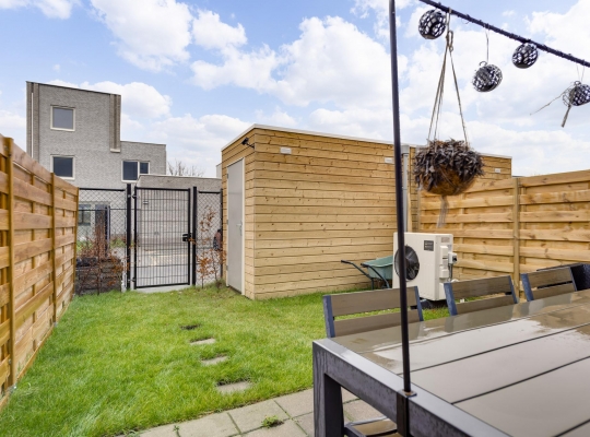 De achtertuin op het zuidoosten is een heerlijke plek om buiten te zitten. Het grote terras grenst aan het grasveld met stapstenen. Houten schuttingen zorgen voor privacy en in de berging is ruimte voor de fietsen. Via de poort is de achtergelegen straat te bereiken, waar u de beschikking heeft over een vaste parkeerplek. Ook voor de voortuin, ingedeeld met grind en bestrating, heeft u geen groene vingers nodig.